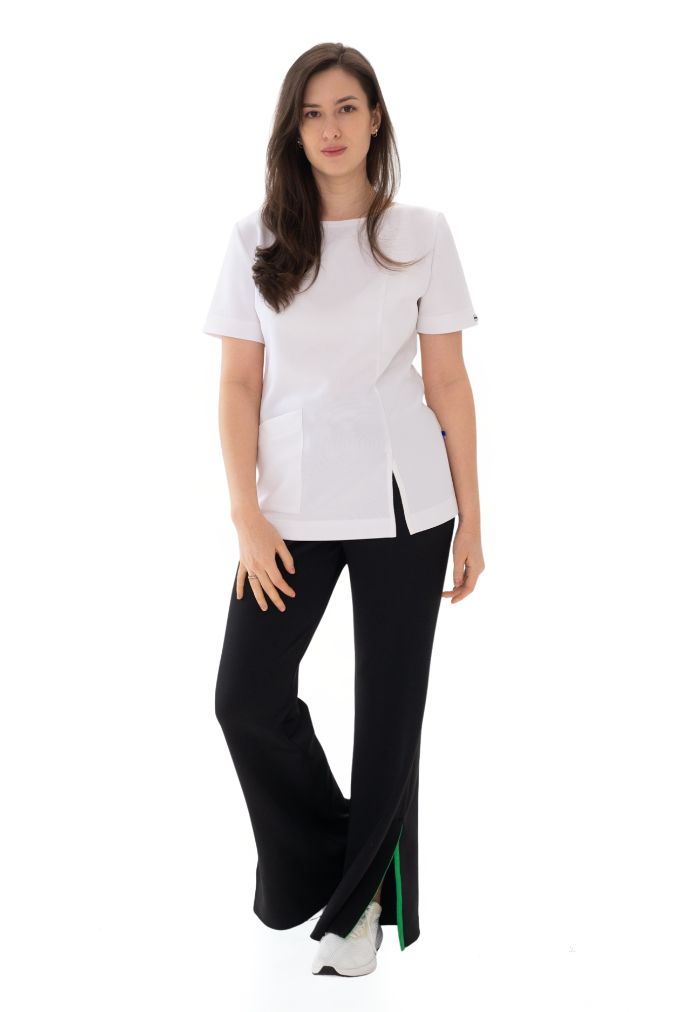 Блуза женская прилегающего силуэта. Выполнена из спортивного трикотажа интерлок. Воротник лодочкой. Короткий рукав. Один накладной карман спереди, разрез обработан контрастной лентой