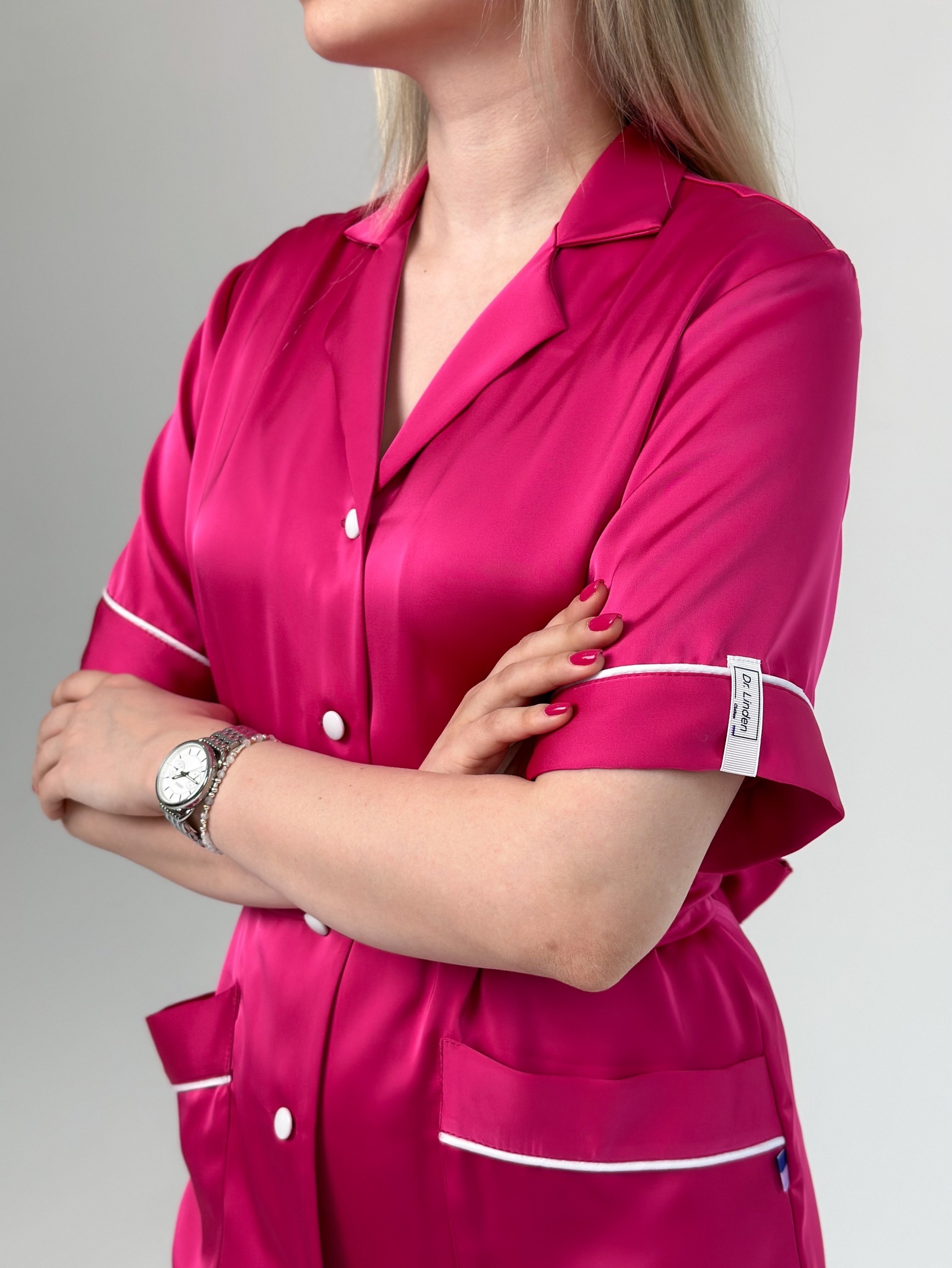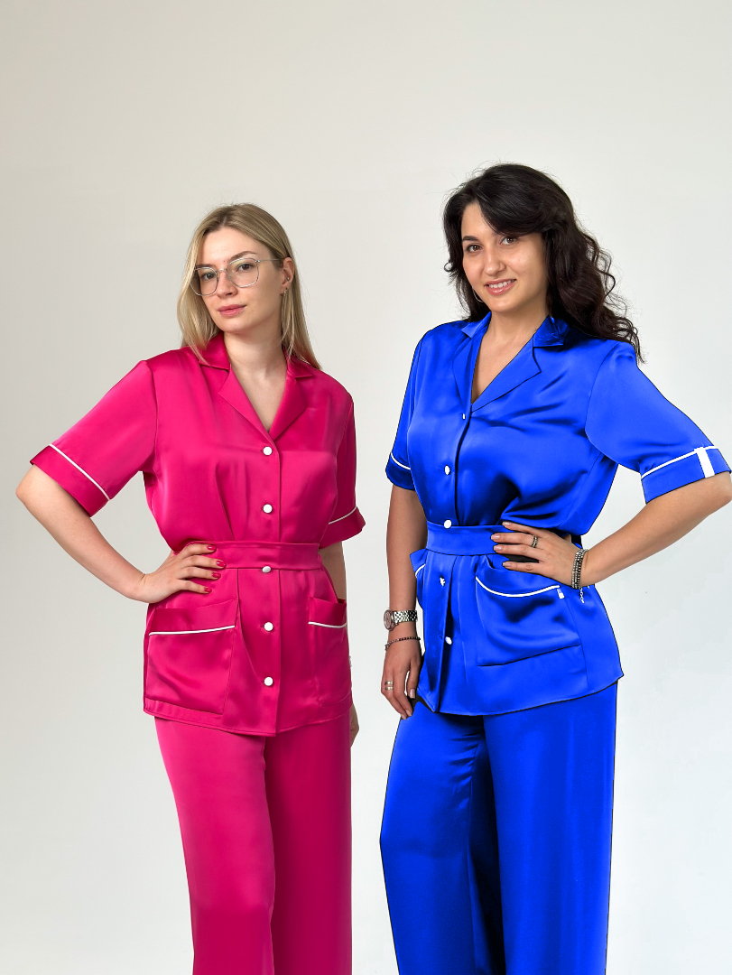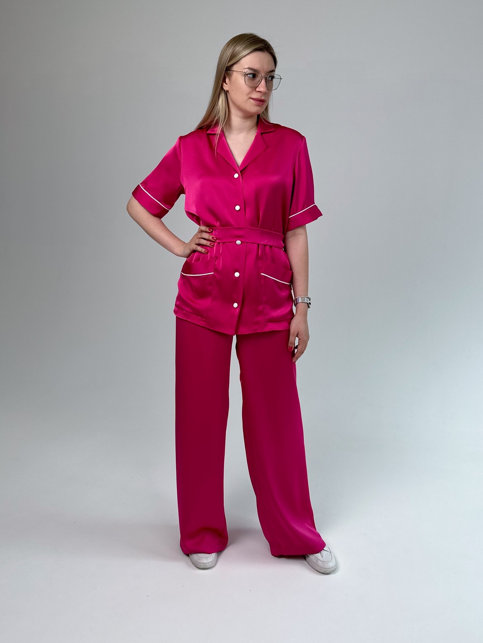 Блуза женская полуприлегающего силуэта. Блуза - рубашка выполнена в пижамном стиле с контрастными пуговицами и кантом. Отложной воротник с заостренными краями. Спереди два накладных кармана. Рукав 3/4 с манжетом. В комплекте съёмный пояс.