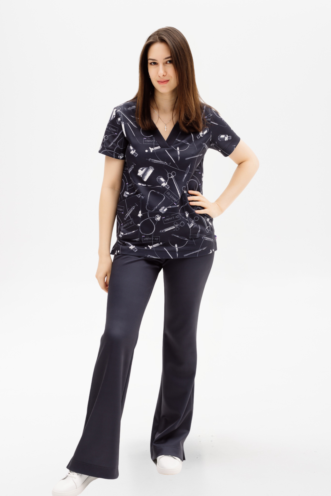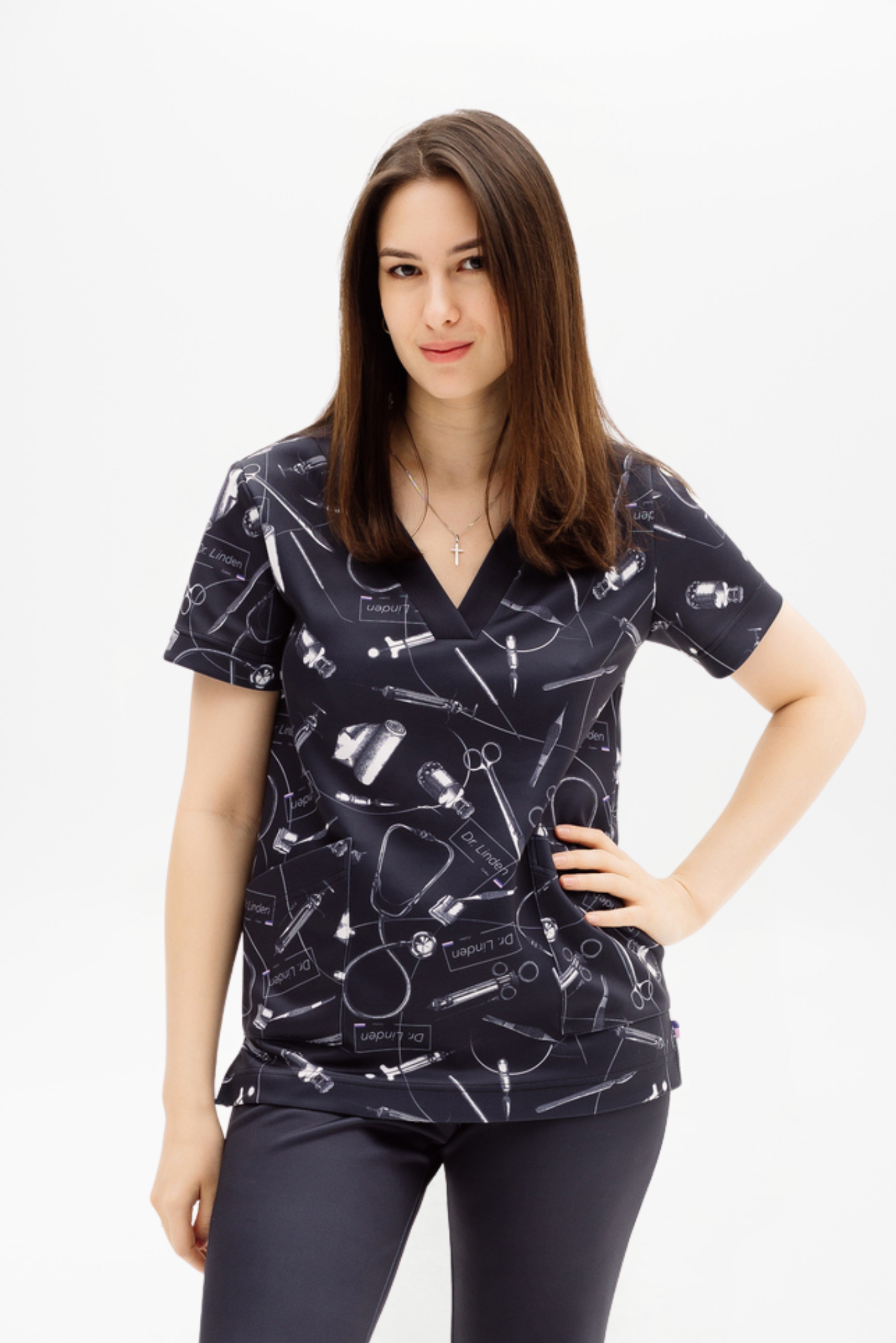 Блуза с V-образным вырезом. Короткий рукав. Два накладных кармана спереди. По бокам разрезы.