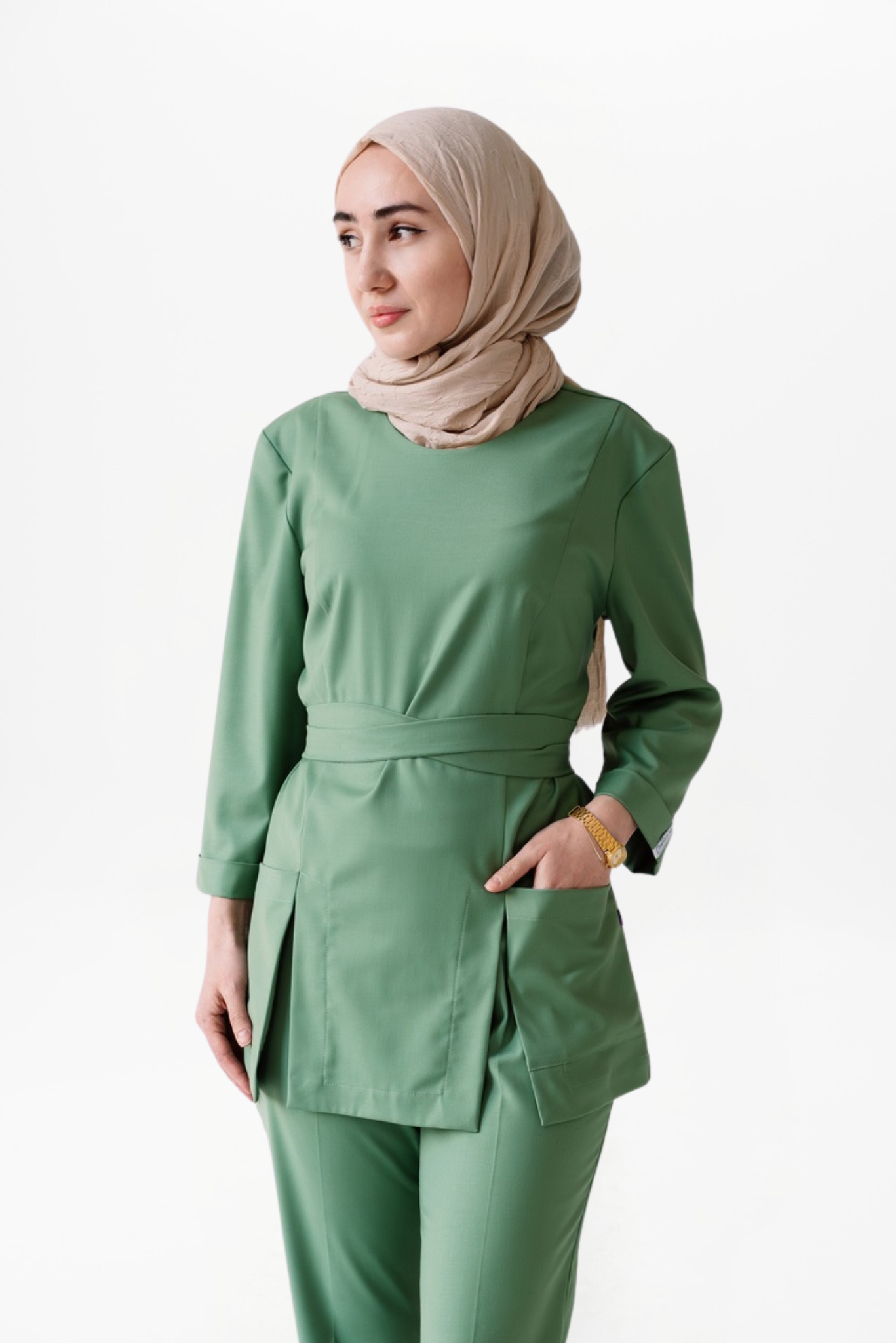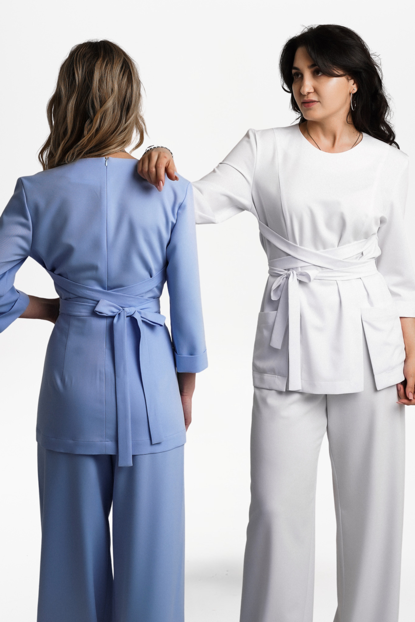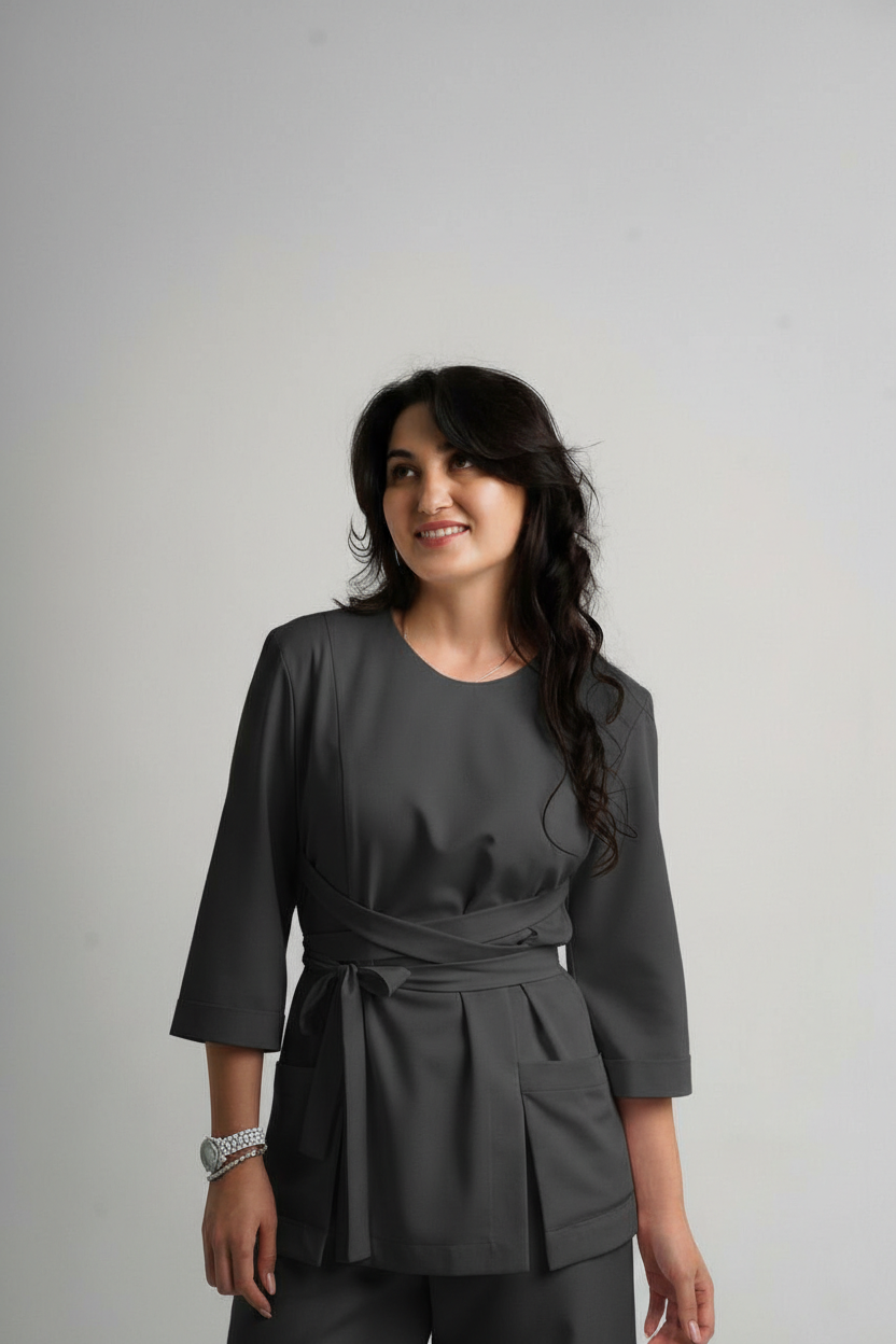 Блуза женская прилегающего силуэта. Материал: 53% cotton, 44% polyester, 3 % Lycra. Блуза с двумя перекрещивающимися поясами и разрезами спереди. Рукав 3/4. Ворот круглый. Сзади молния. Спереди два накладных кармана.