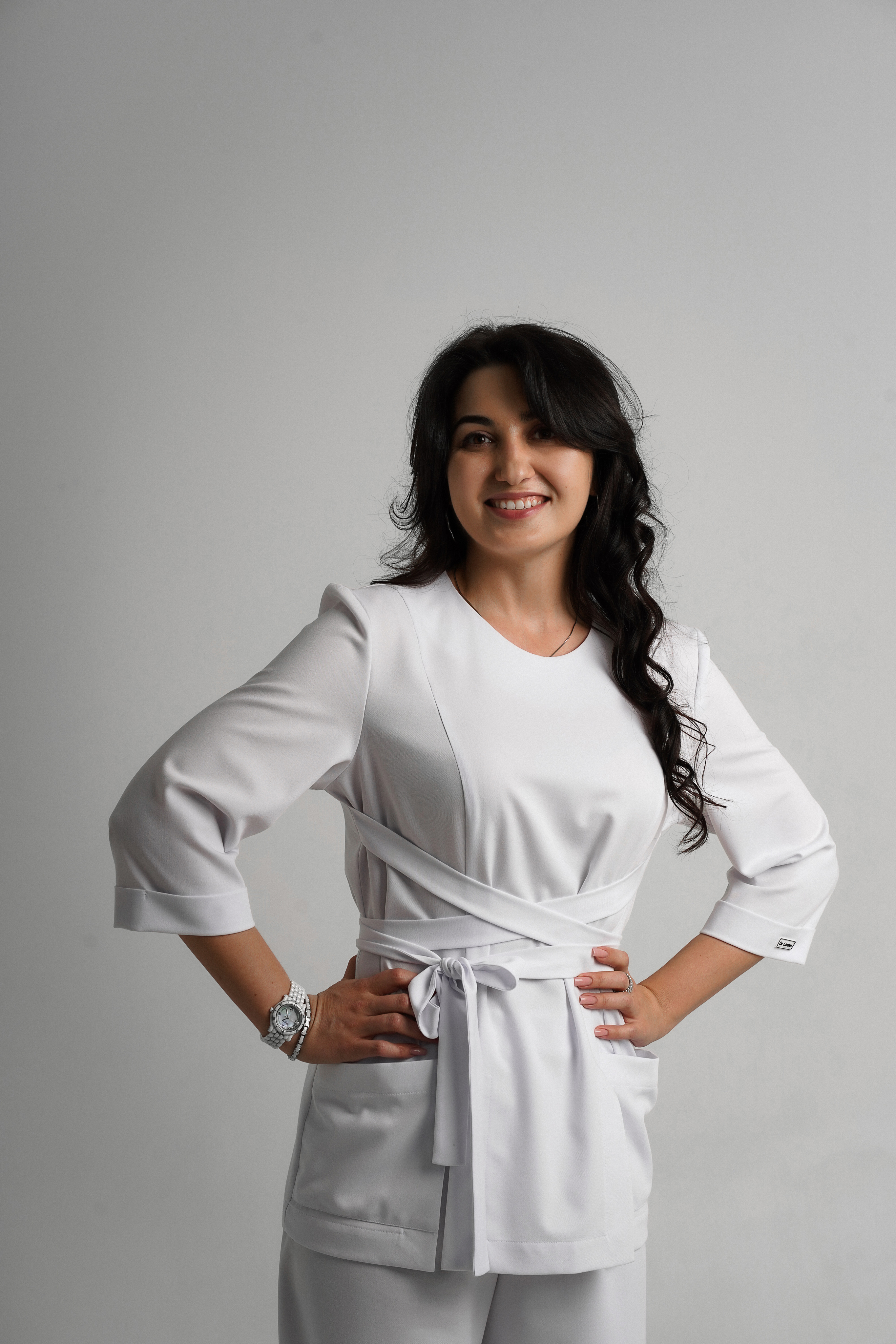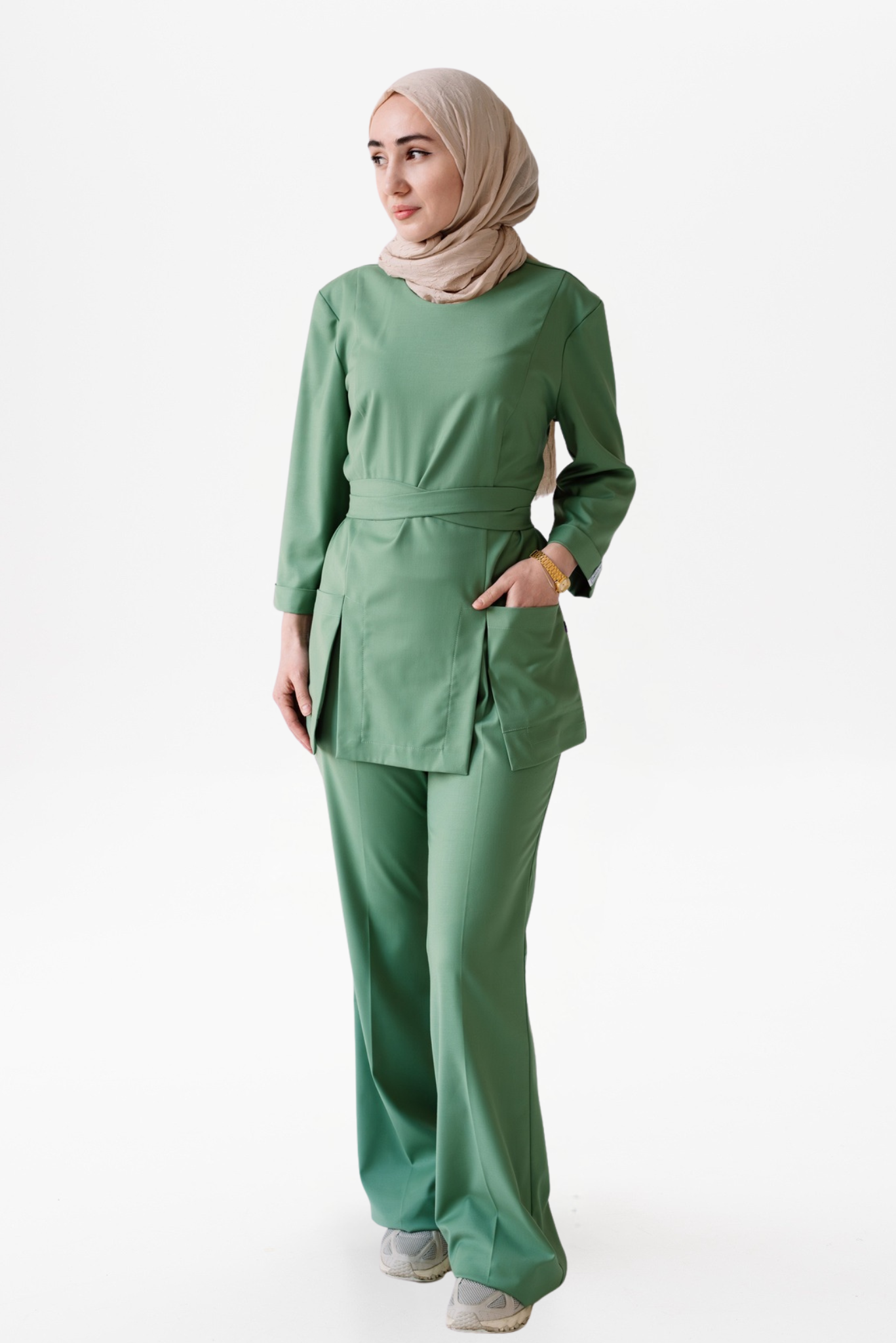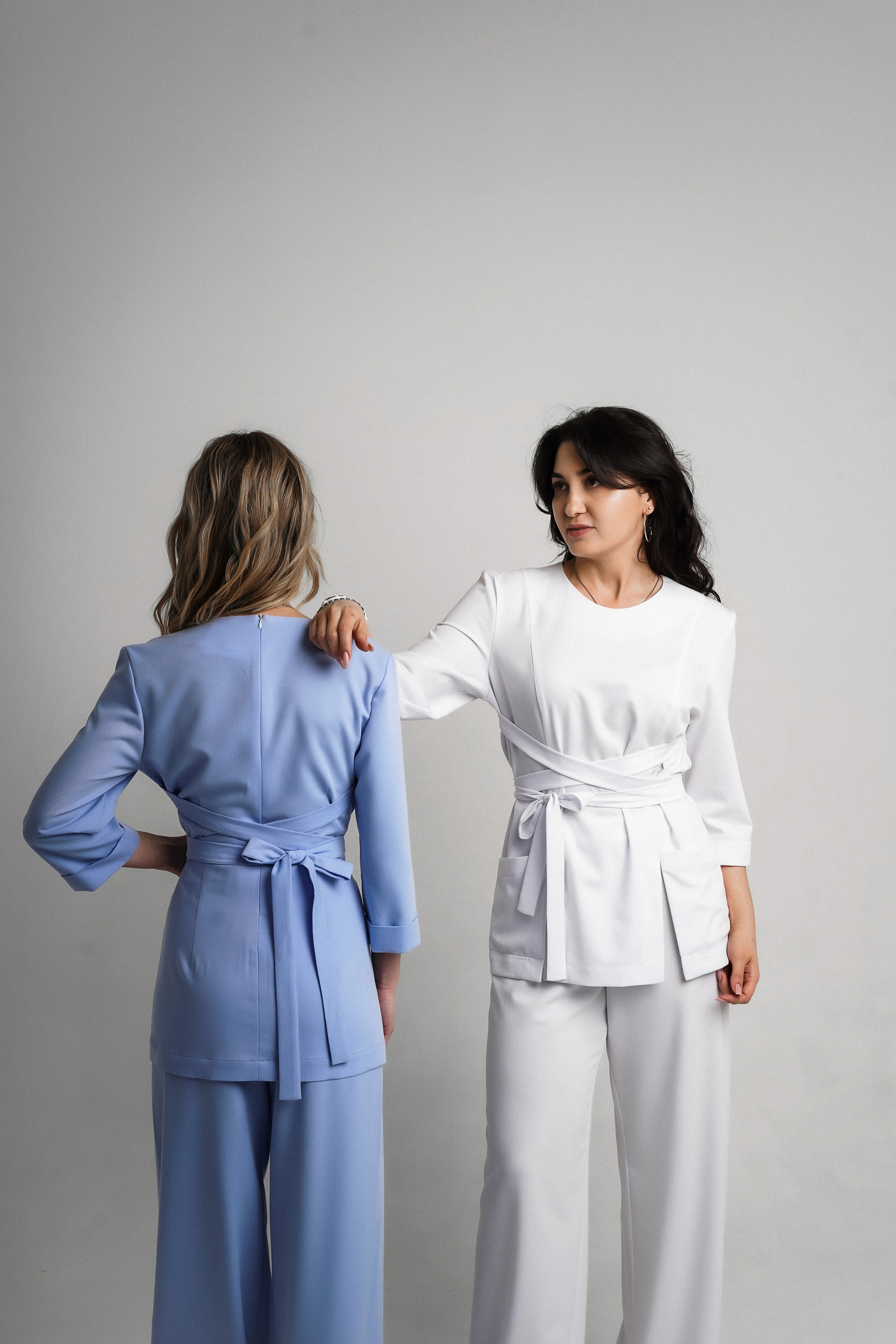 Блуза женская прилегающего силуэта. Материал: 53% cotton, 44% polyester, 3 % Lycra. Блуза с двумя перекрещивающимися поясами и разрезами спереди. Рукав 3/4. Ворот круглый. Сзади молния. Спереди два накладных кармана.