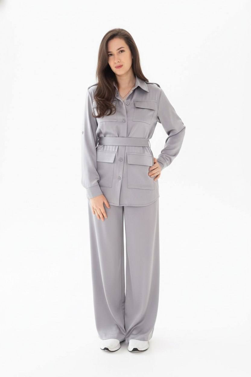 Блуза - рубашка выполнена в стиле сафари с накладными карманами с клапанами на груди и по бокам. Рукав длинный с манжетом и возможностью подворота. Имеет закругленный нижний край и съемный пояс.