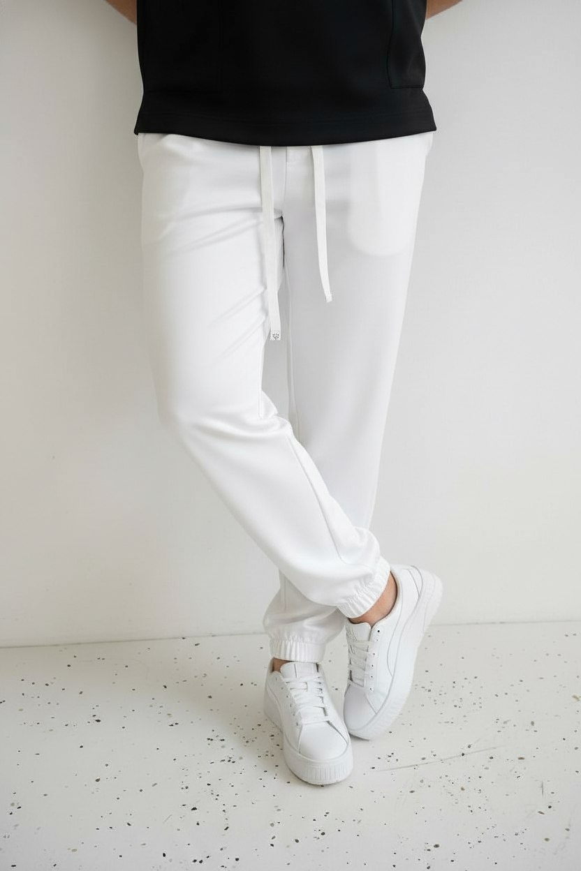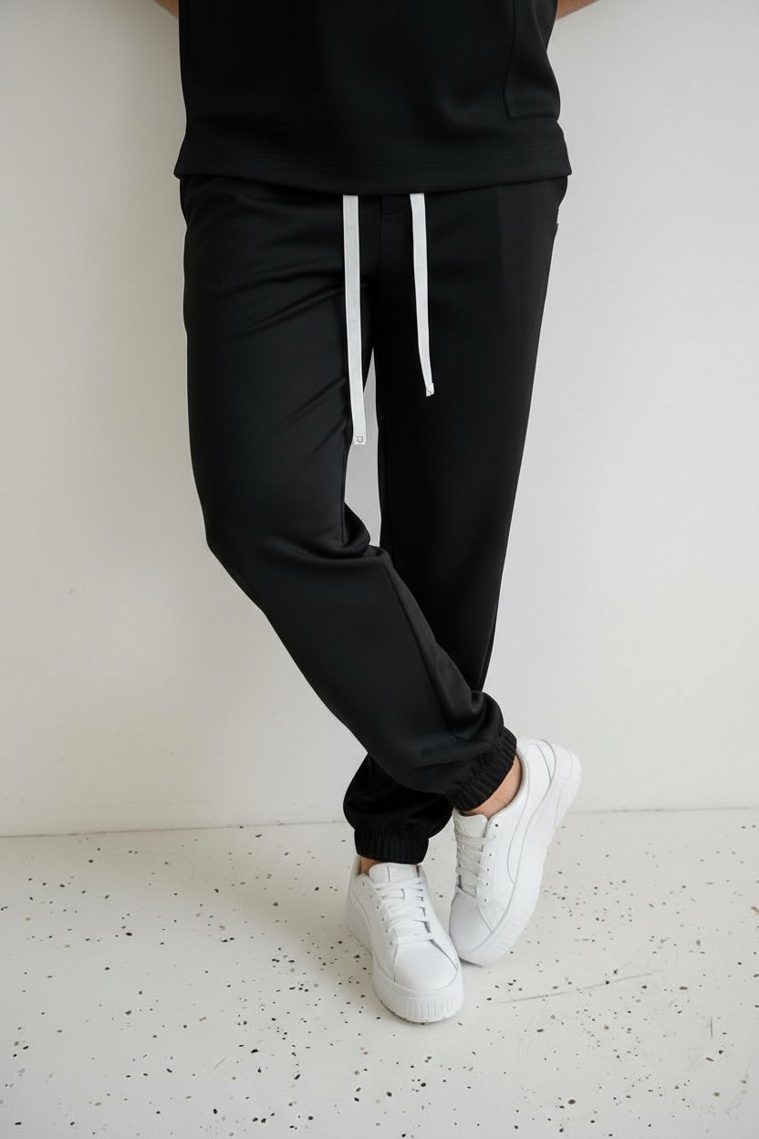 Брюки джоггеры выполнены из спортивного трикотажа. Пояс с резинкой и кулиской, имитация гульфика. Два боковых кармана. Внизу разрезы по наружному шву.