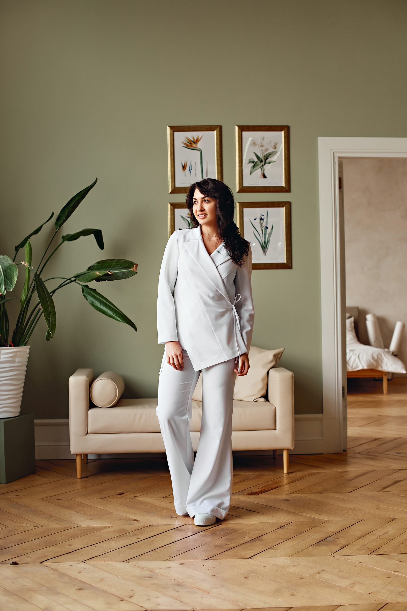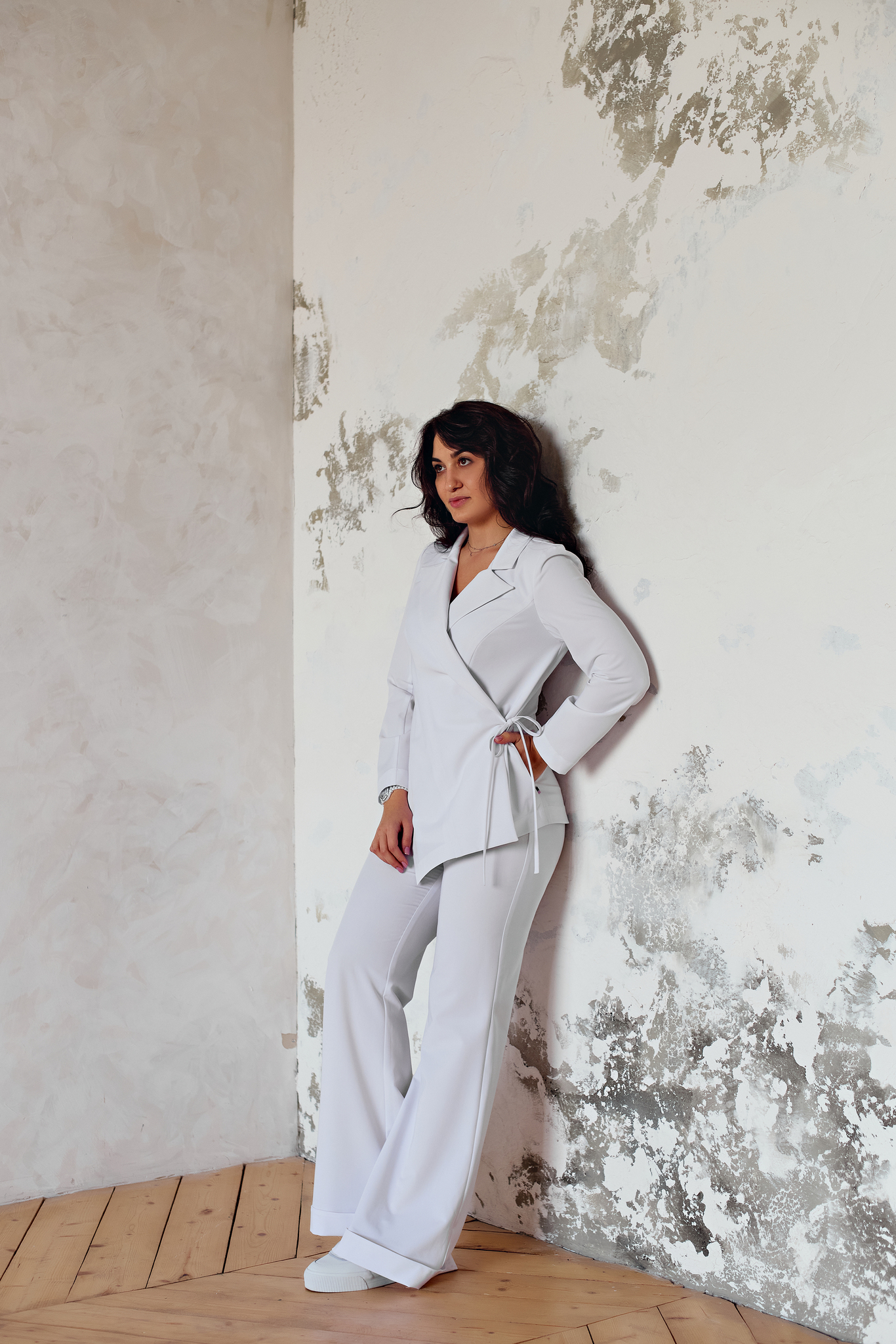 Брюки женские полуприлегающего силуэта. Материал: 53% cotton, 44% polyester, 3 % Lycra. Брюки-клеш с высокой посадкой подойдут для любого роста и фигуры, визуально стройнят и удлиняют ноги. Пояс на мягкой резинке.