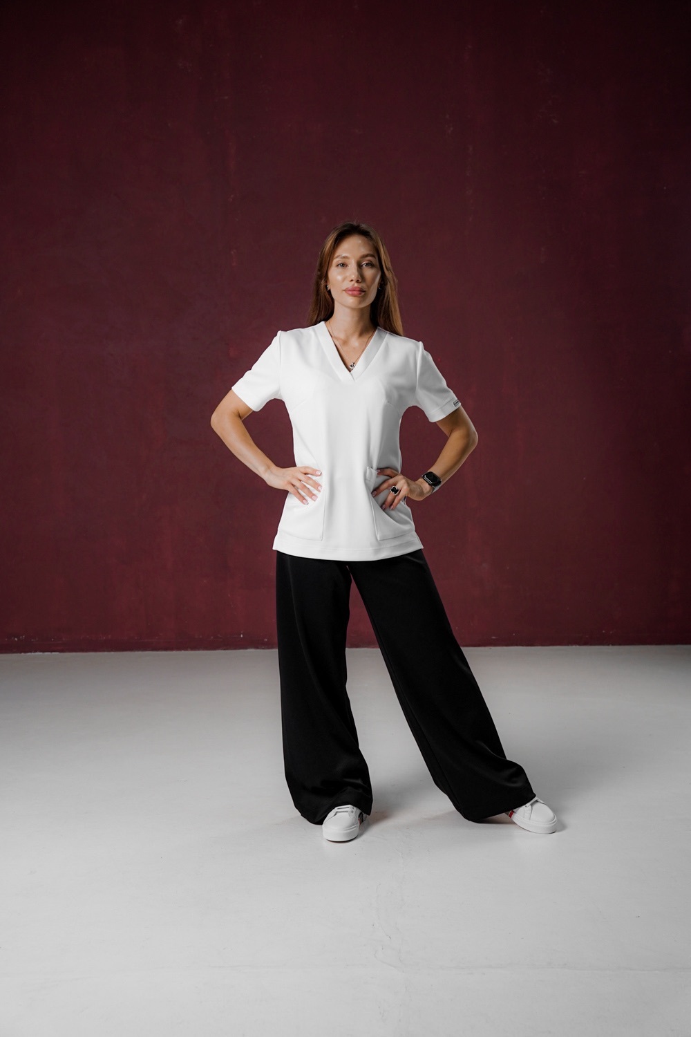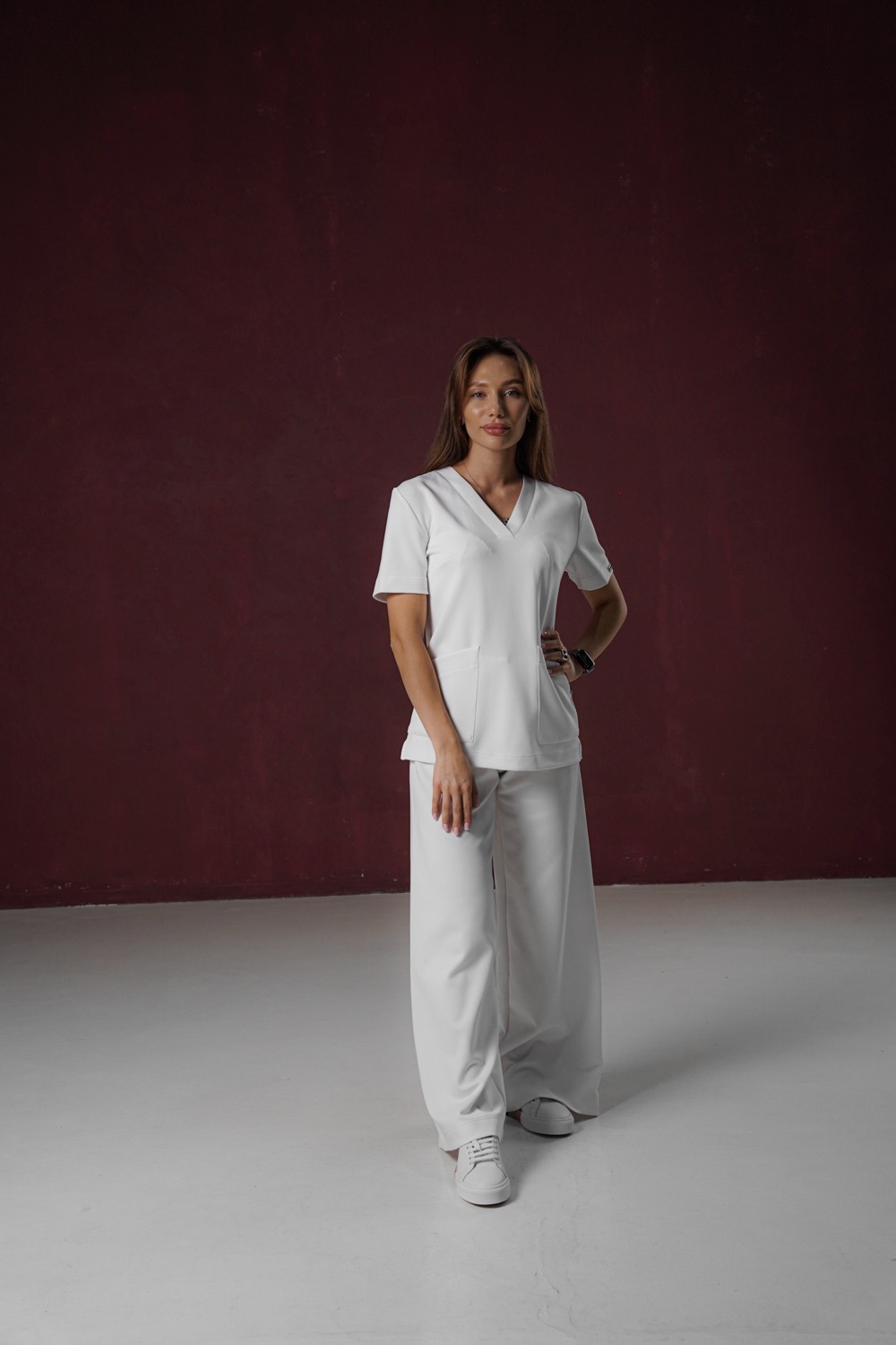 Брюки женские полуприлегающего силуэта. Материал: спортивный трикотаж интерлок. Брюки-палаццо с высокой посадкой подойдут для любого роста и фигуры, визуально стройнят и удлиняют ноги. Пояс на мягкой резинке. Единственный шов по внутренней поверхности ноги.