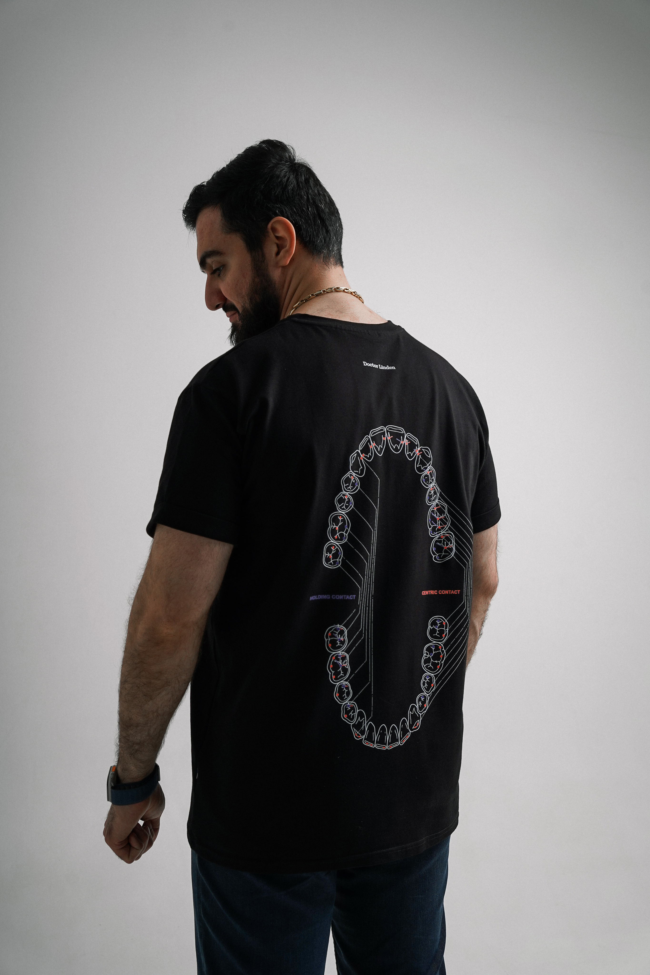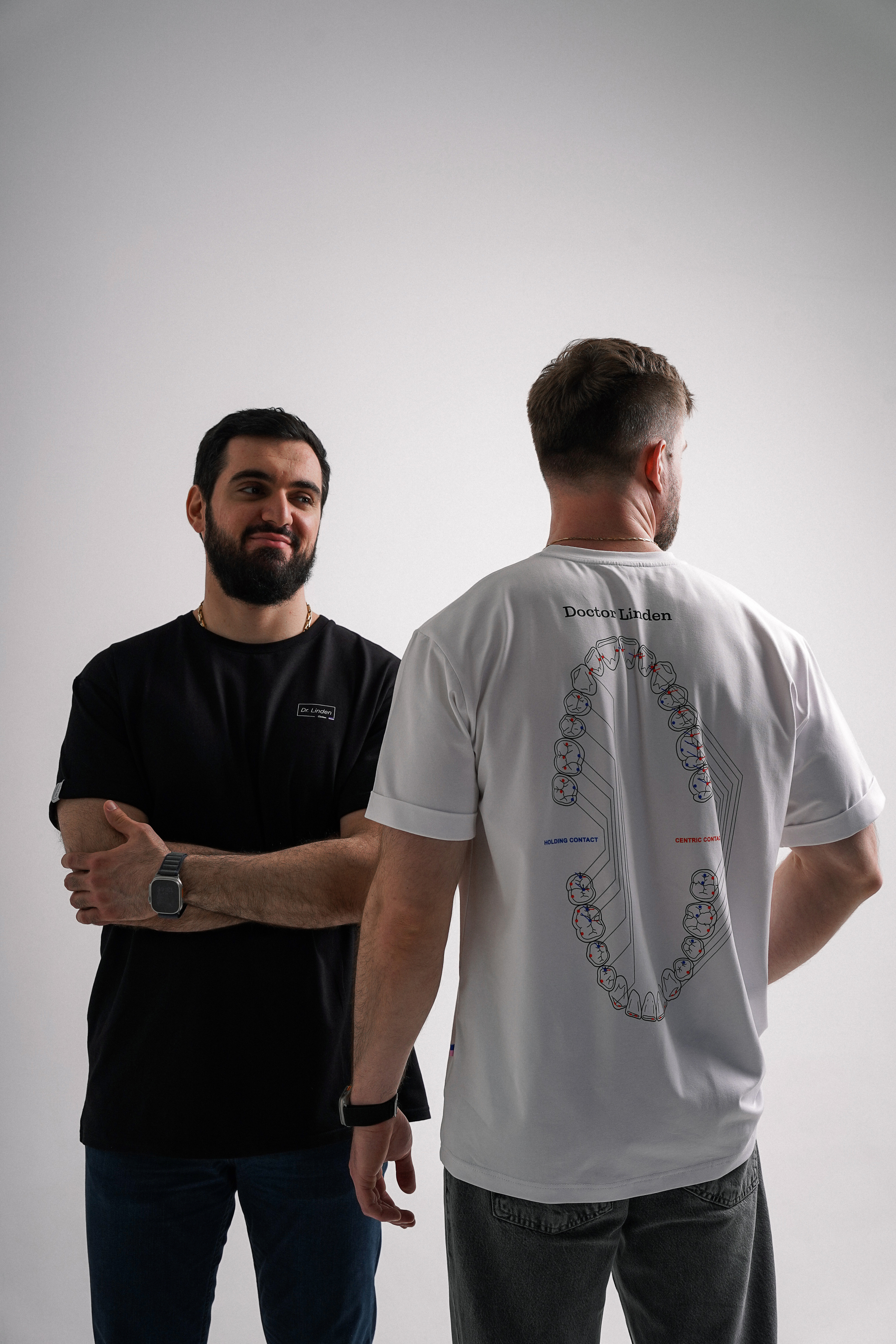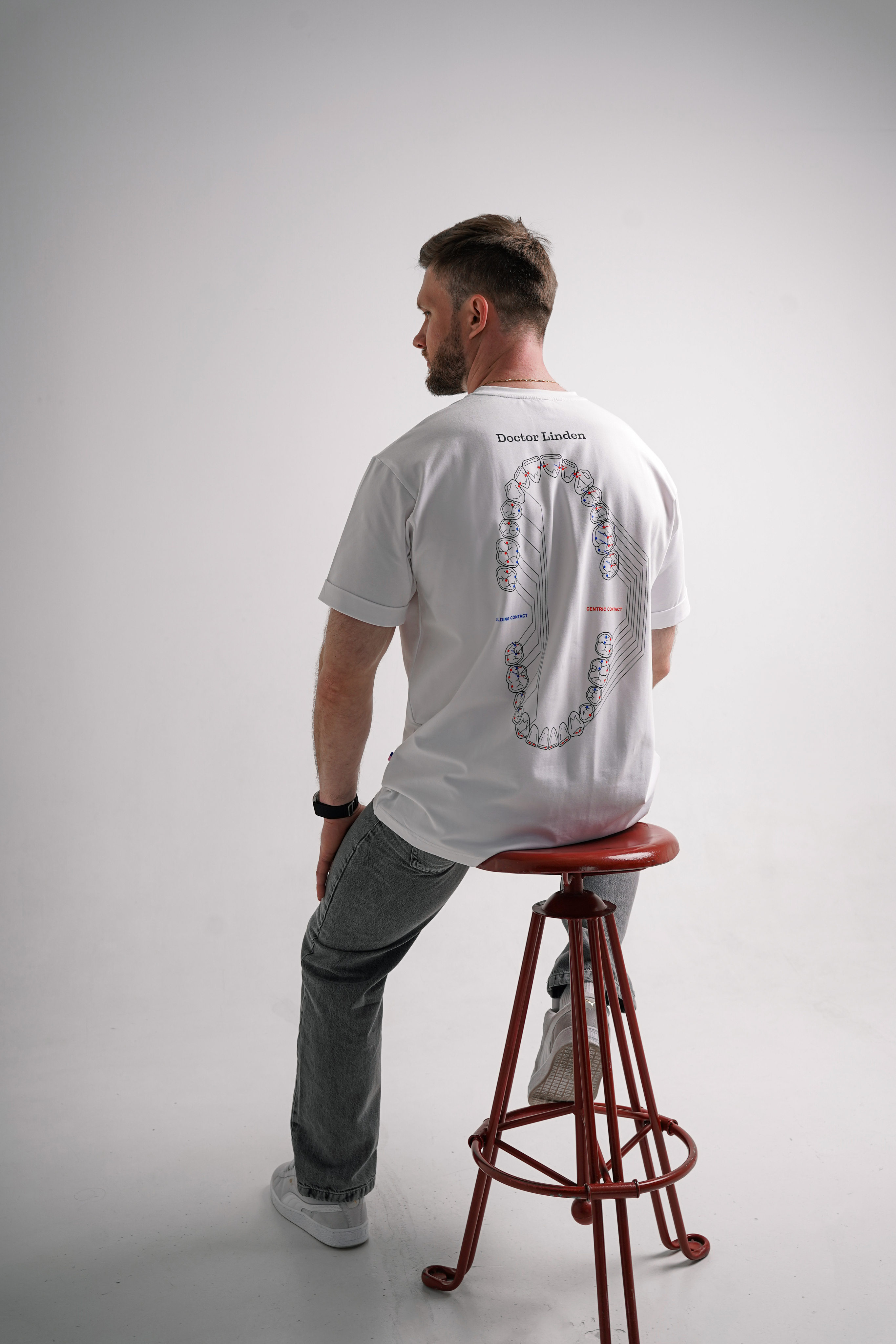 Футболка унисекс с круглым воротом, рукав с отворотом, на рукаве логотип бренда, а на спине изображены зубные контакты