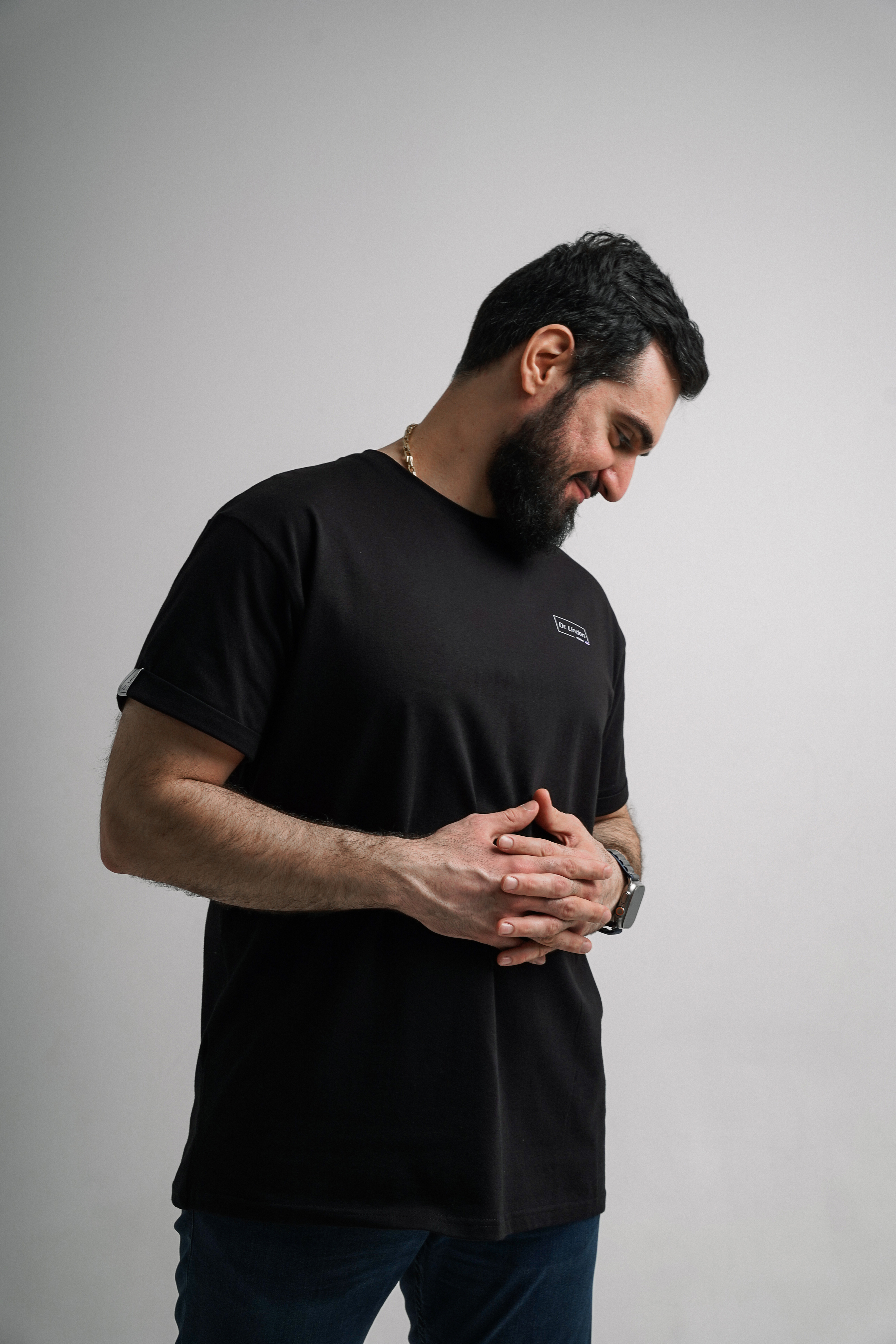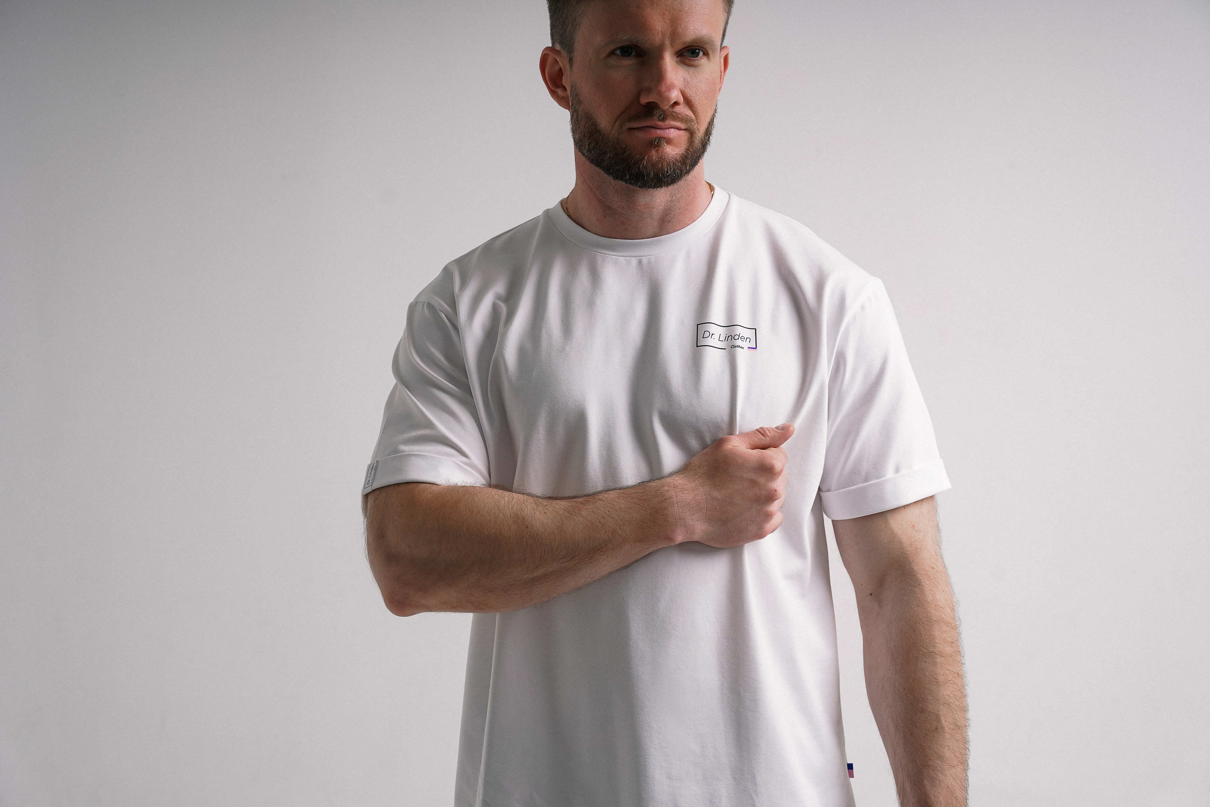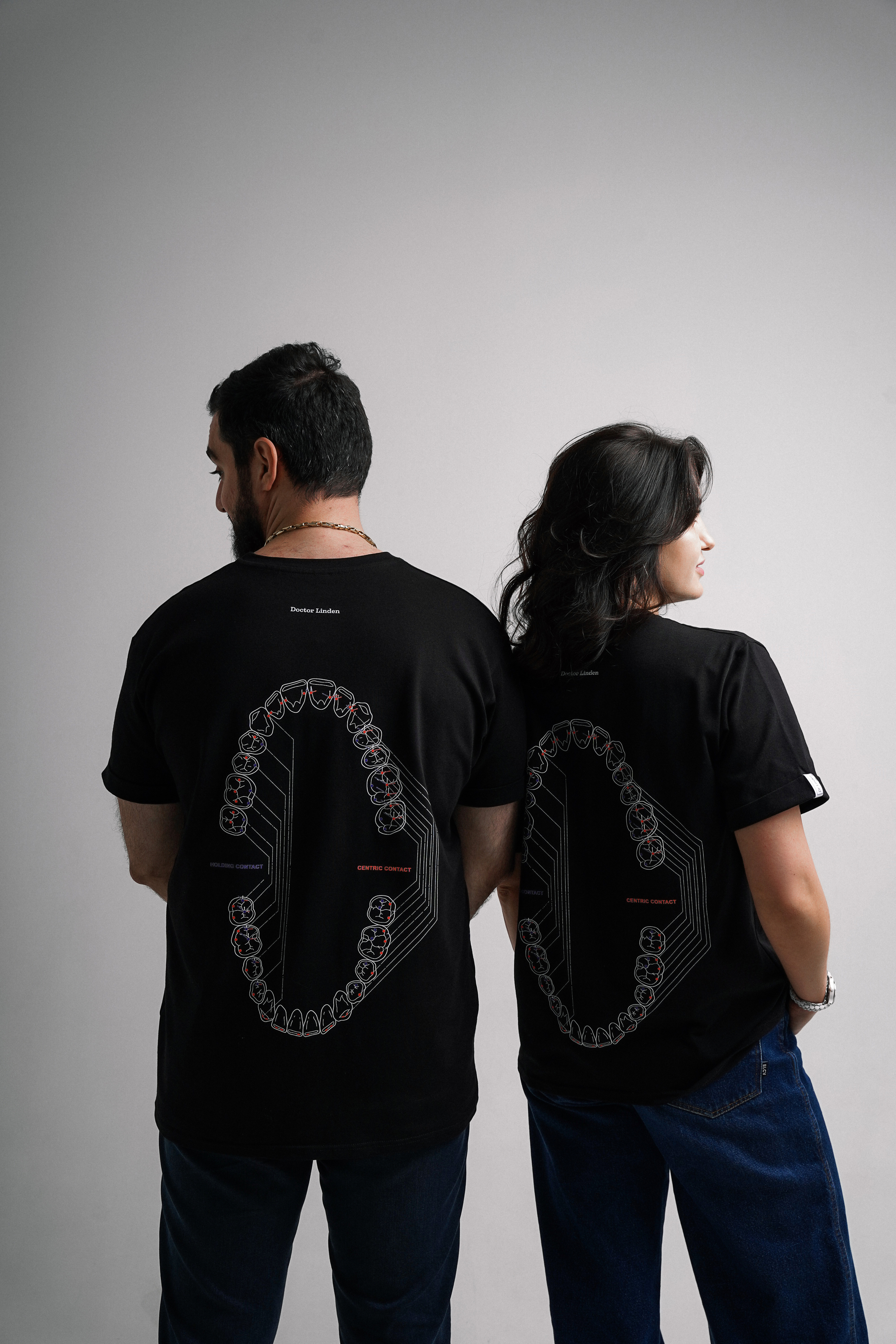 Футболка унисекс с круглым воротом, рукав с отворотом, на рукаве логотип бренда, а на спине изображены зубные контакты