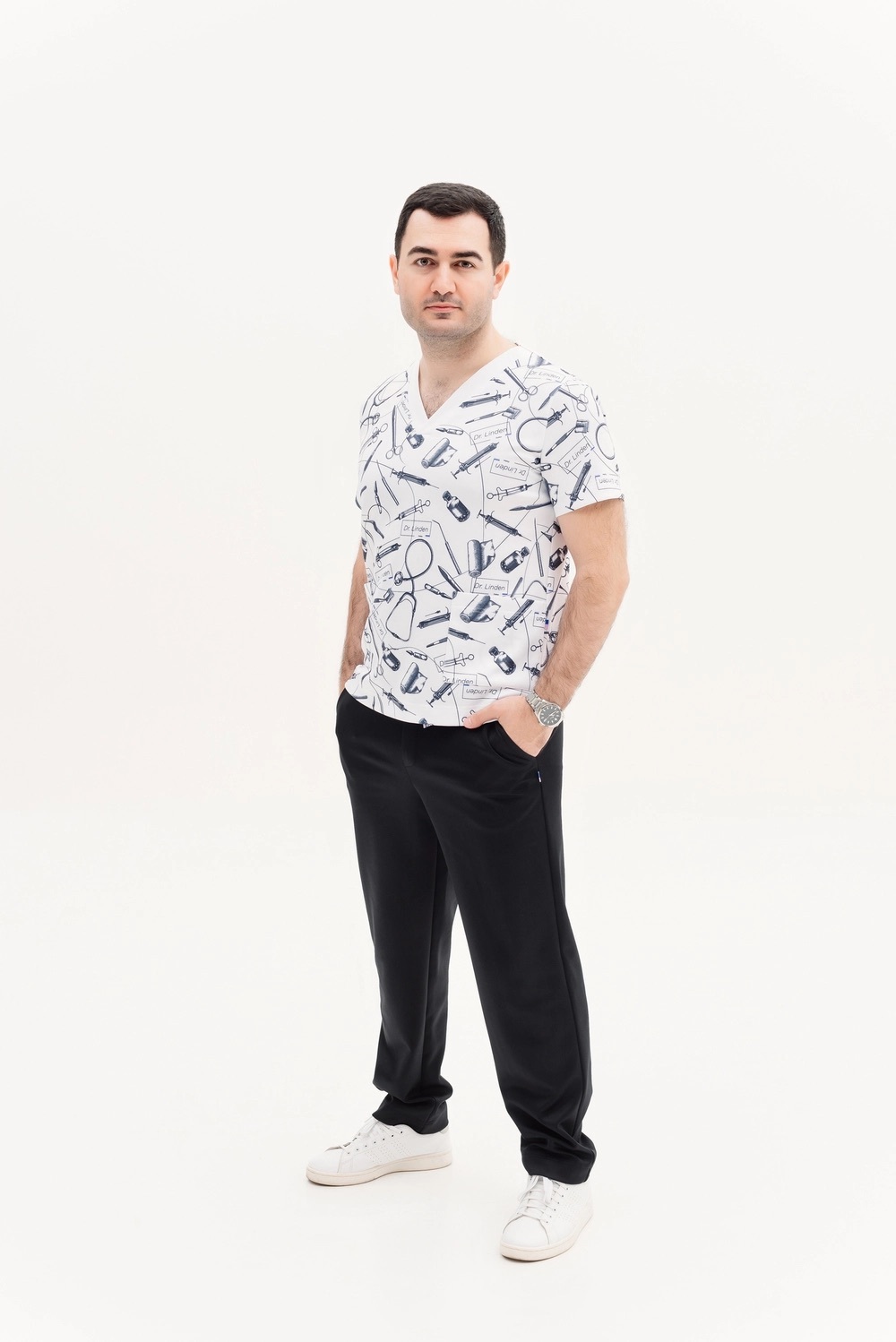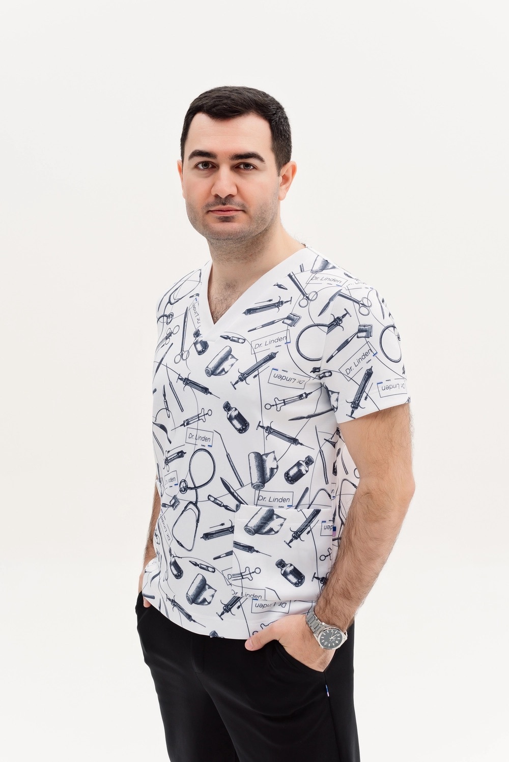 Рубашка с V-образным вырезом. Короткий рукав с отворотом. Два накладных кармана спереди. По бокам разрезы.