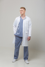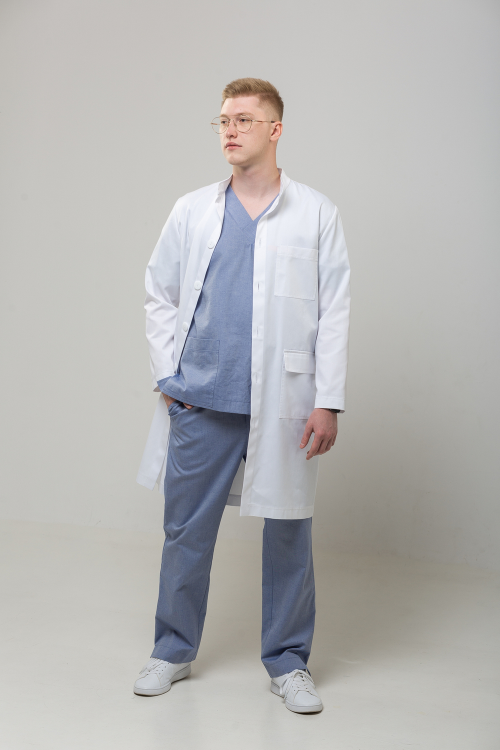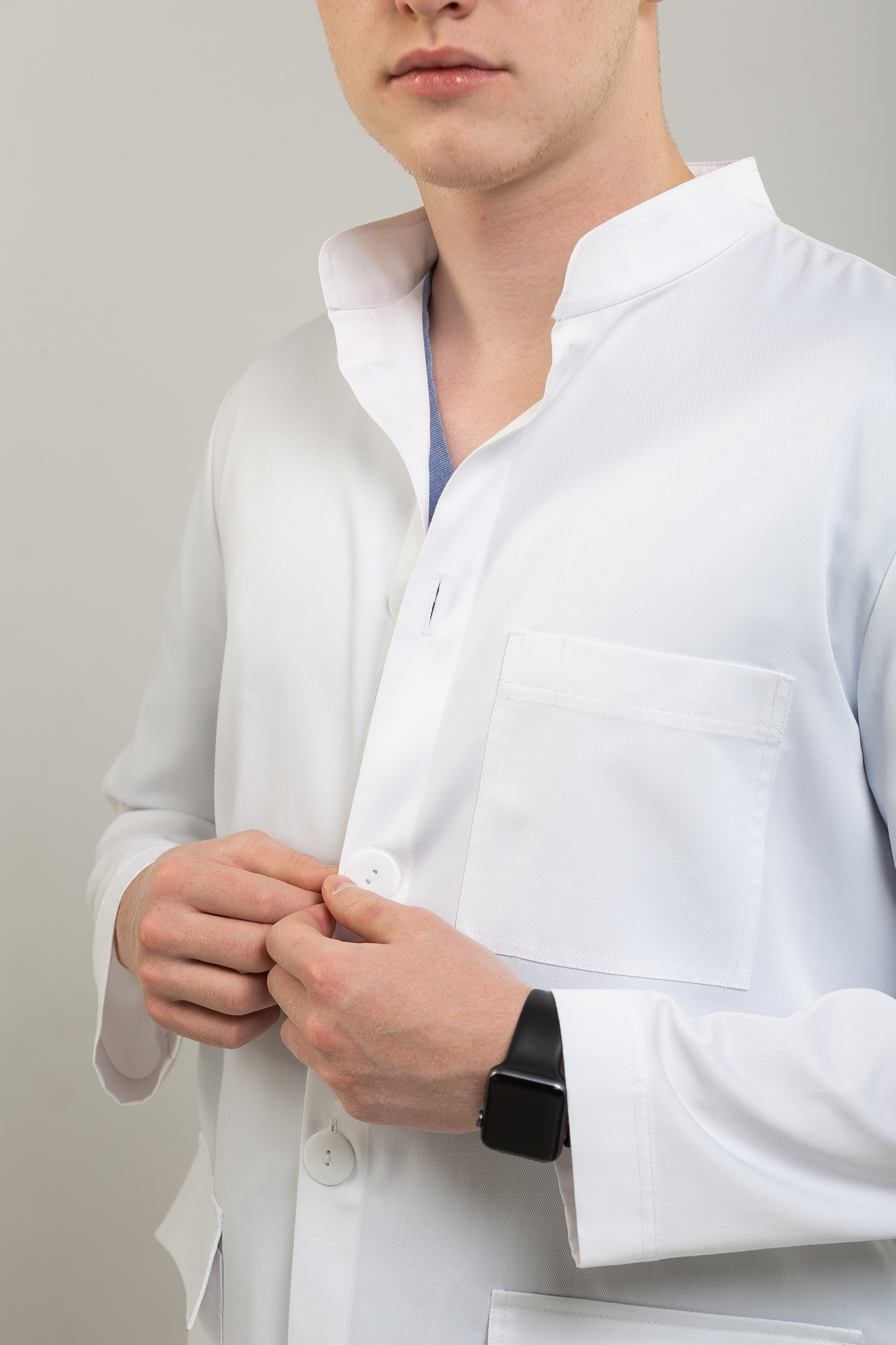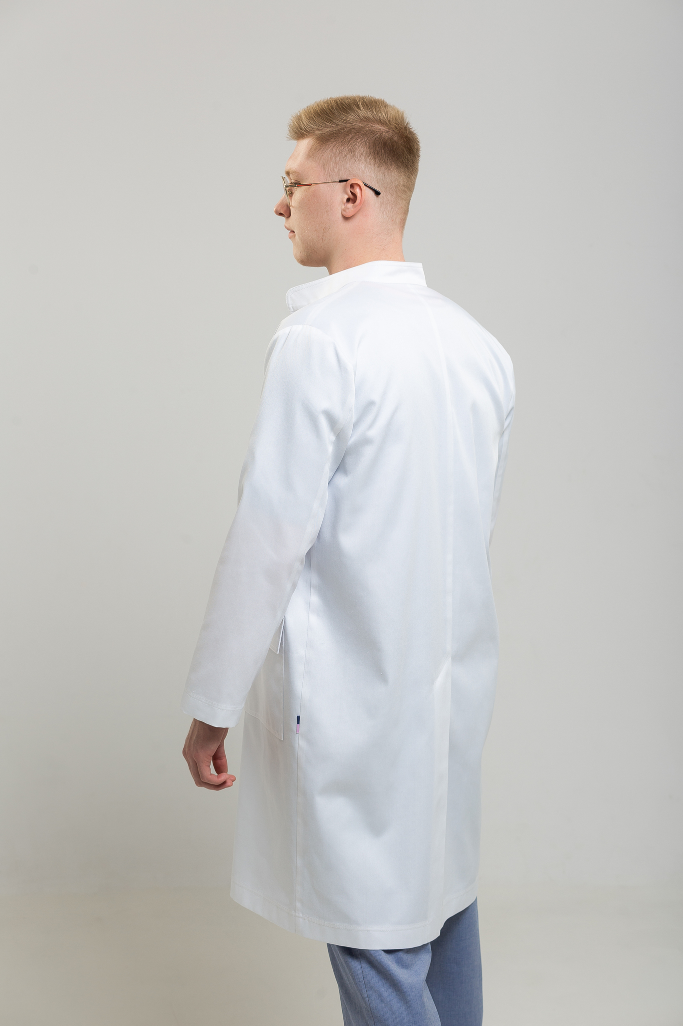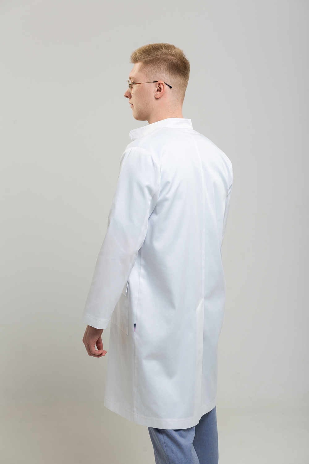 Халат мужской полуприлегающего силуэта. Халат с воротом - стойкой. Рукав длинный со шлицей и пуговицами. Нагрудный карман и два накладных спереди. На спине пояс. На рукавах декоративные паты
