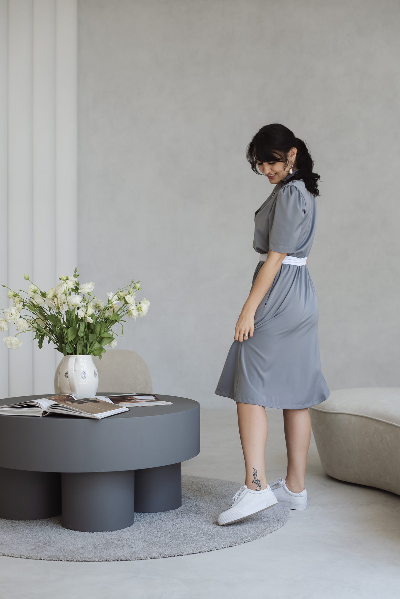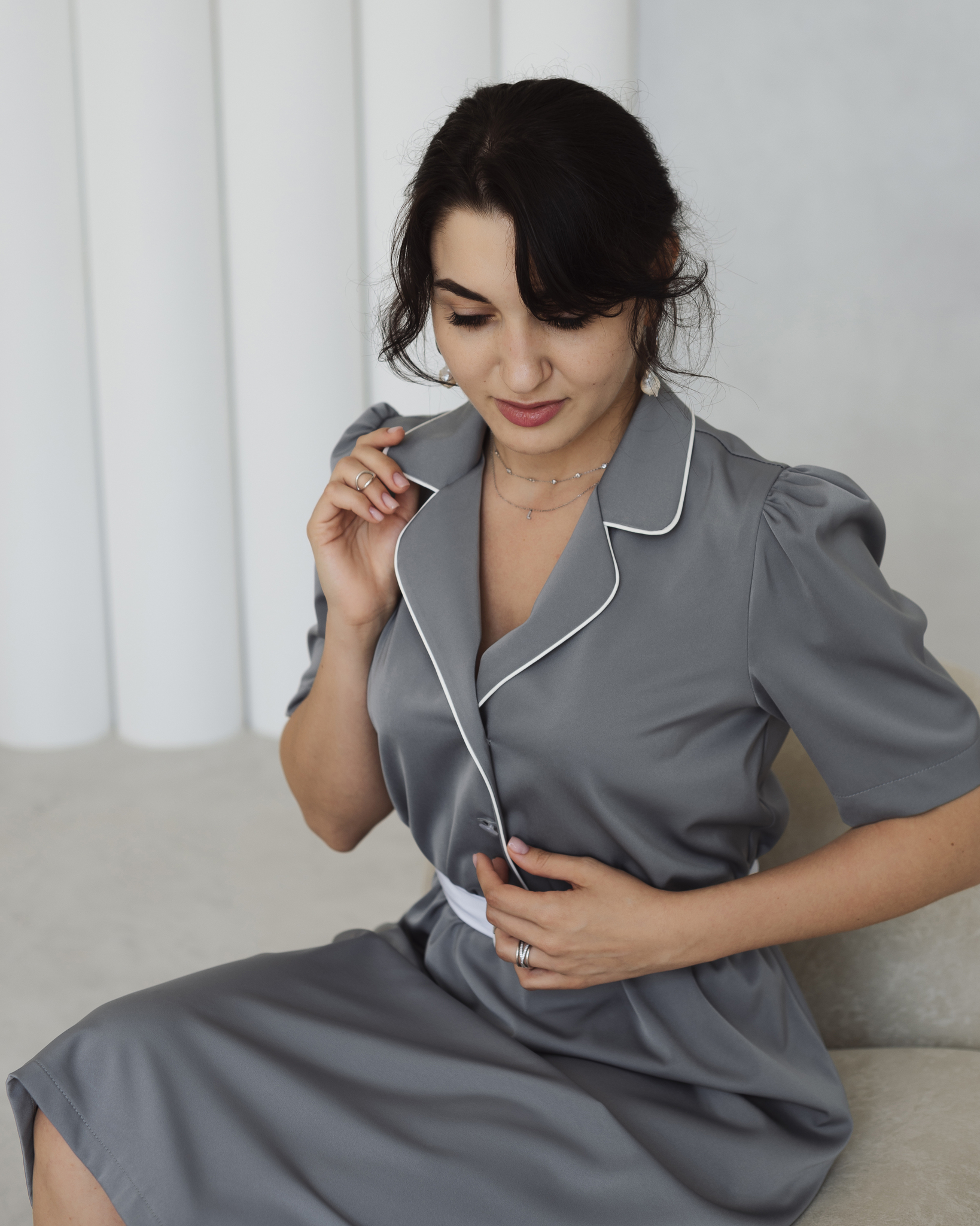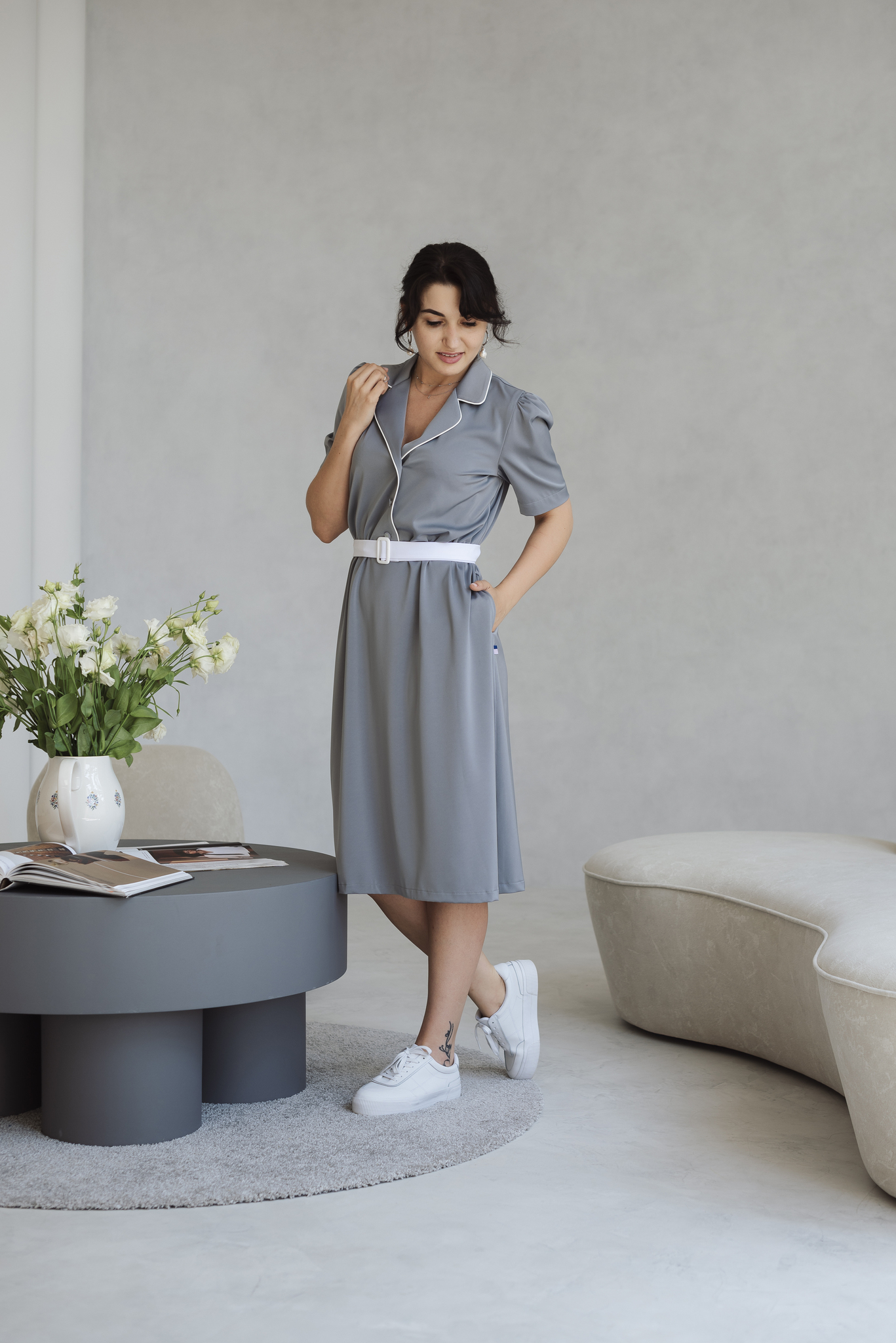 Платье женское полуприлегающего силуэта. Материал: 33% silk, 64% polyester, 3% Lycra. Сатиновое платье в стиле ретро. Рукав и ворот обработаны белым кантом. Имеет контрастные пуговицы и пояс с пряжкой. В боковых швах вшиты карманы.