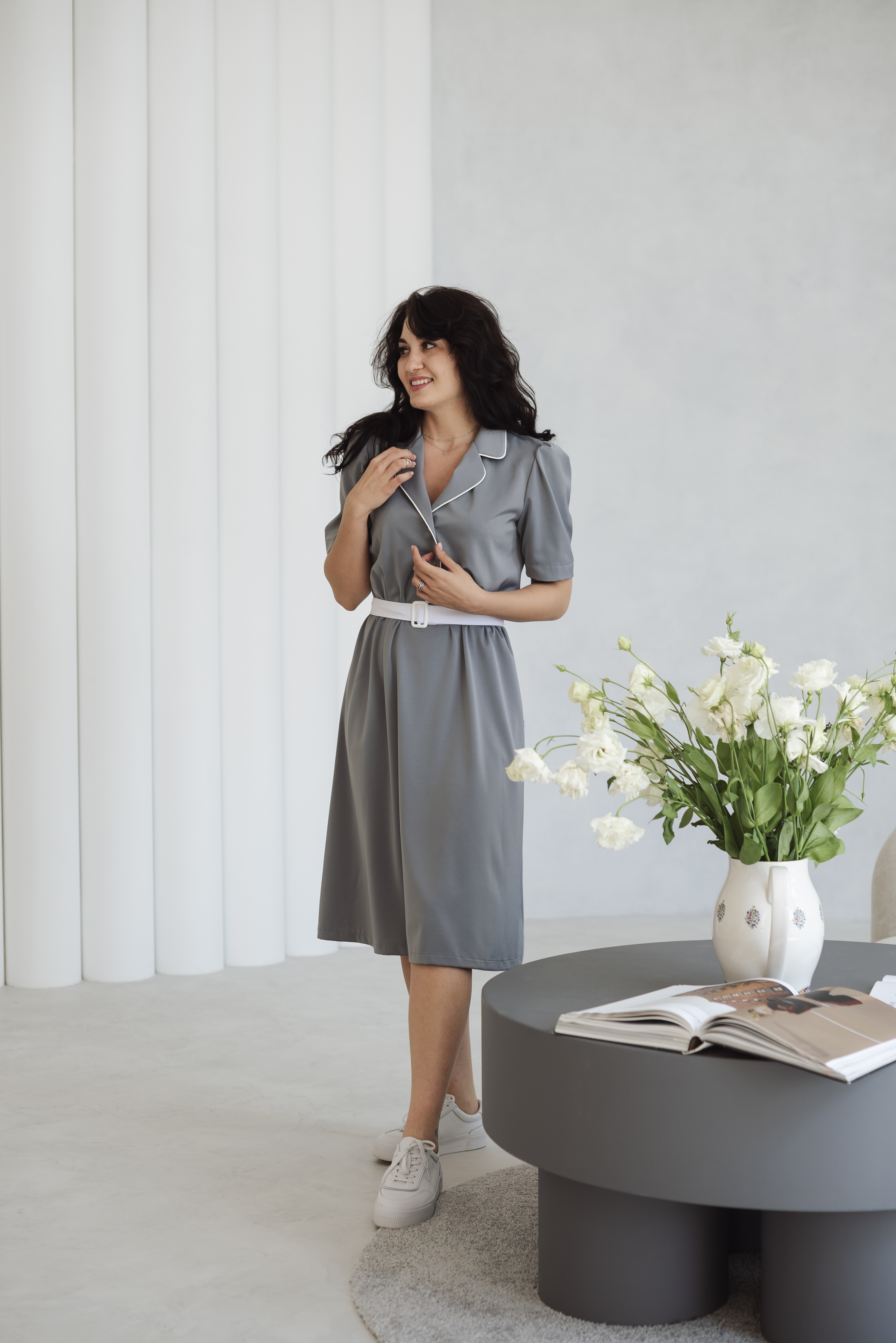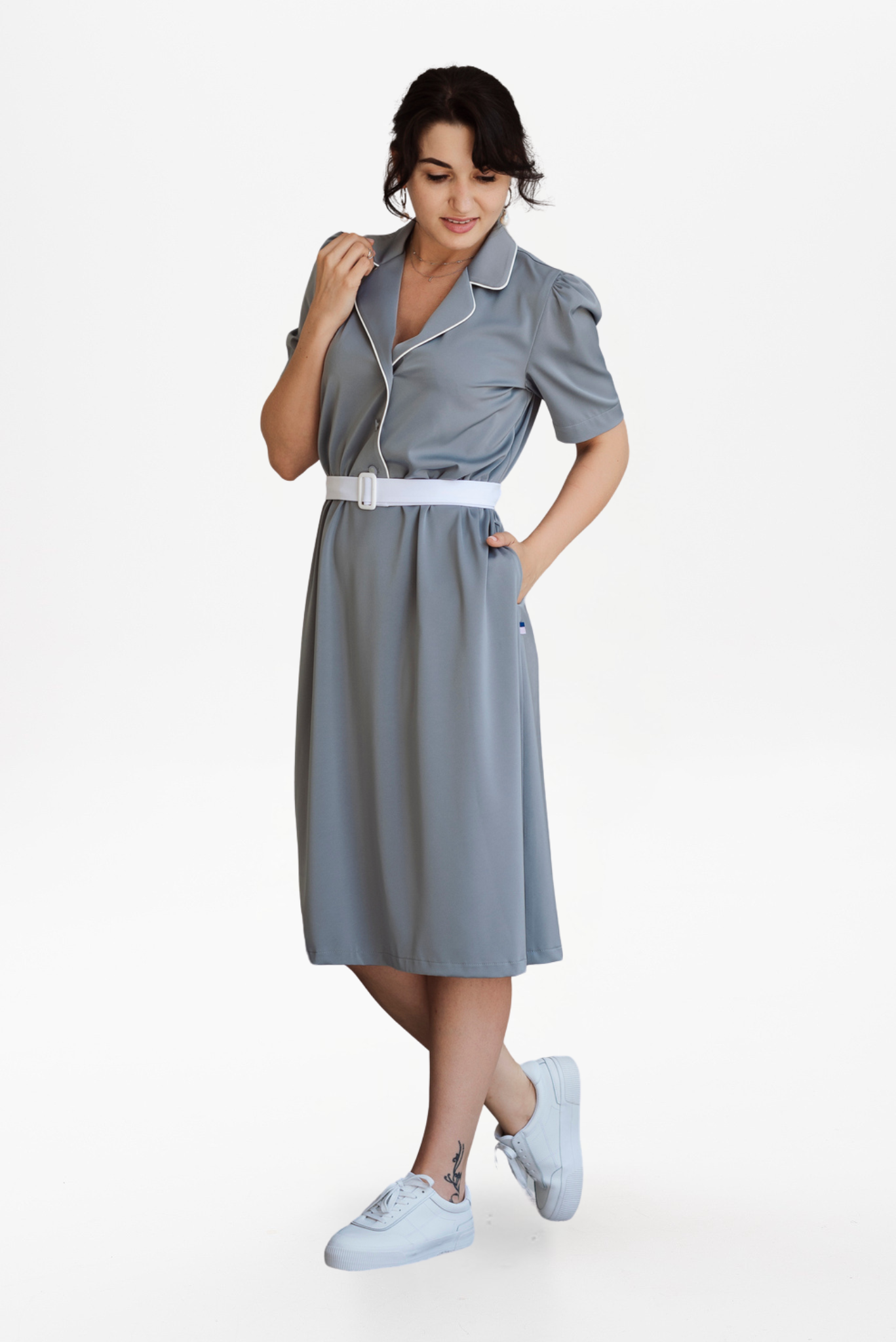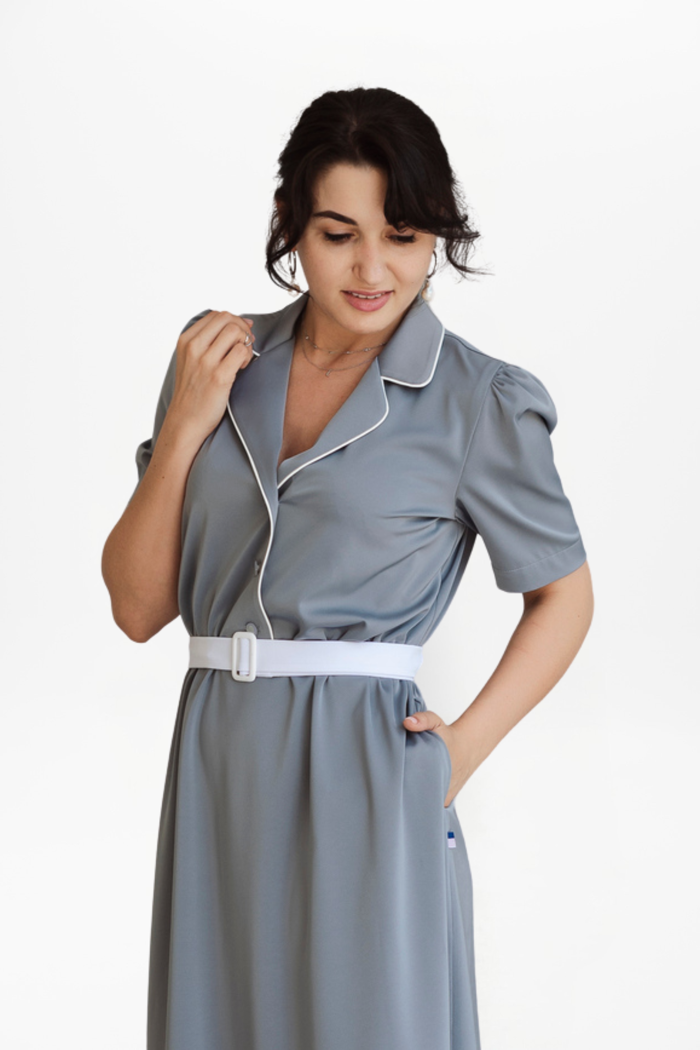 Платье женское полуприлегающего силуэта. Материал: 33% silk, 64% polyester, 3% Lycra. Сатиновое платье в стиле ретро. Рукав и ворот обработаны белым кантом. Имеет контрастные пуговицы и пояс с пряжкой. В боковых швах вшиты карманы.