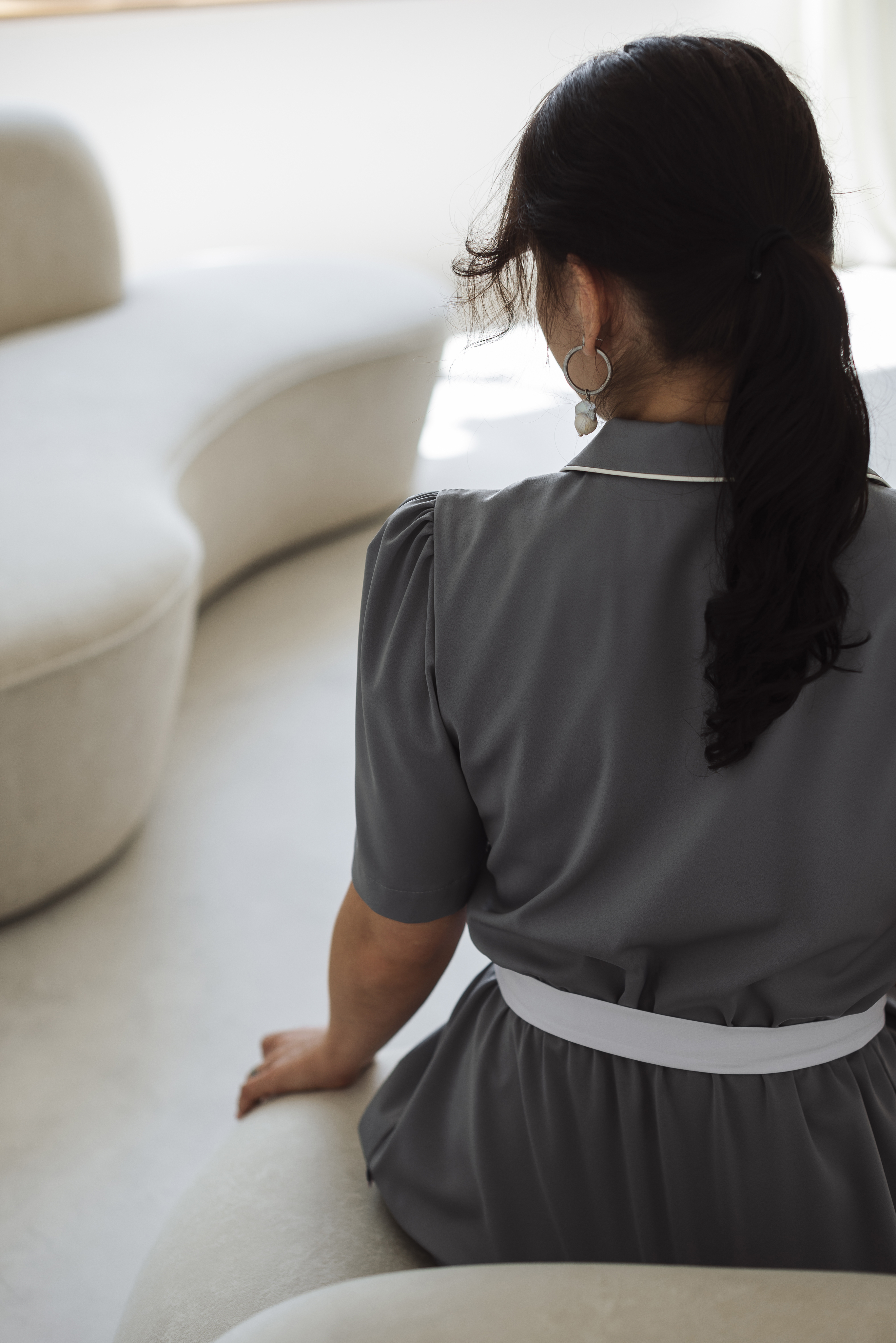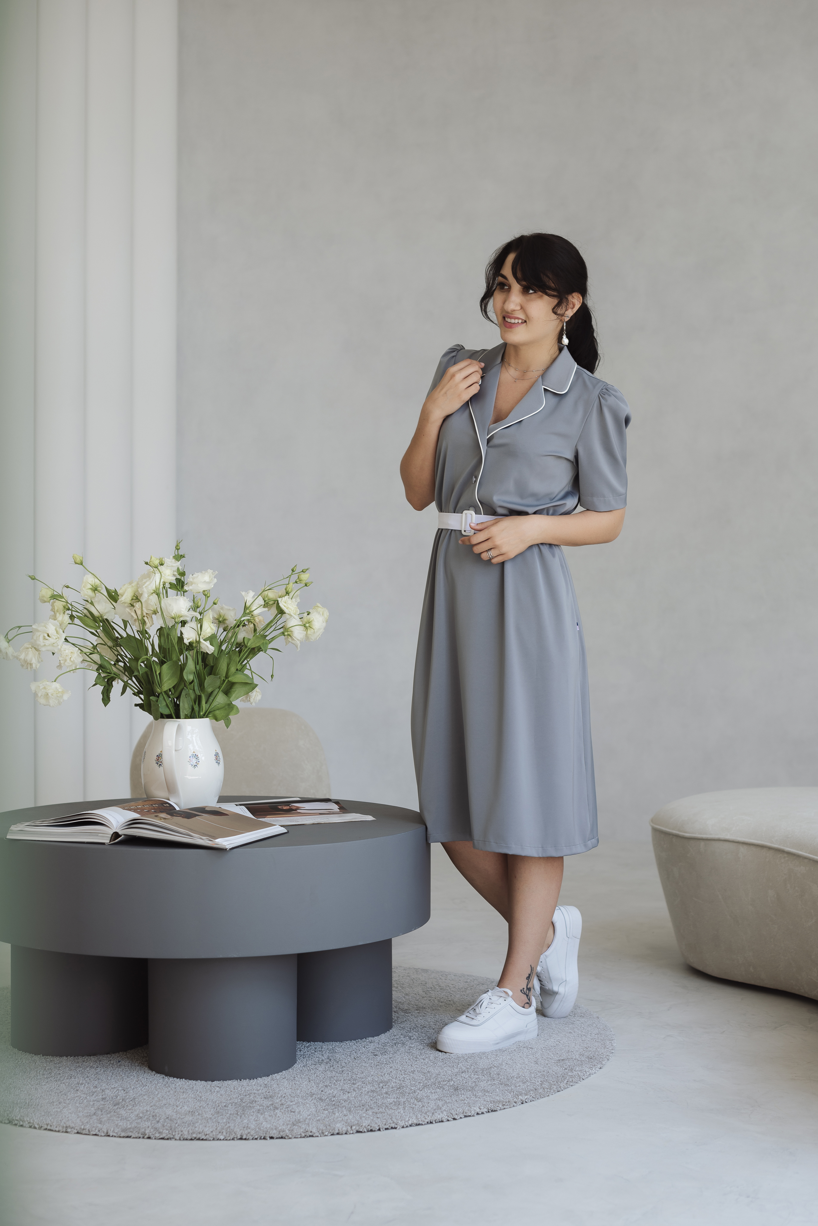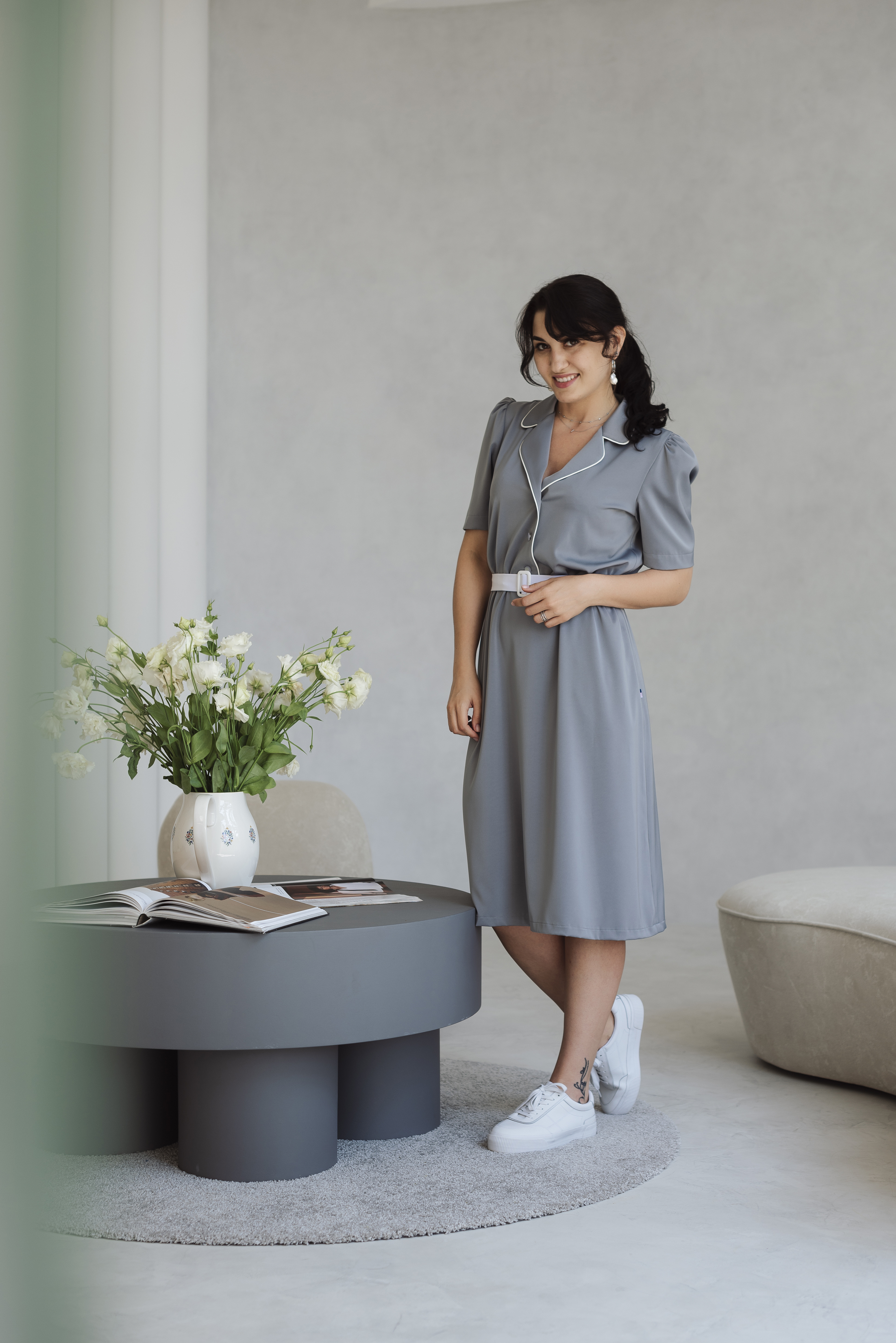 Платье женское полуприлегающего силуэта. Материал: 33% silk, 64% polyester, 3% Lycra. Сатиновое платье в стиле ретро. Рукав и ворот обработаны белым кантом. Имеет контрастные пуговицы и пояс с пряжкой. В боковых швах вшиты карманы.