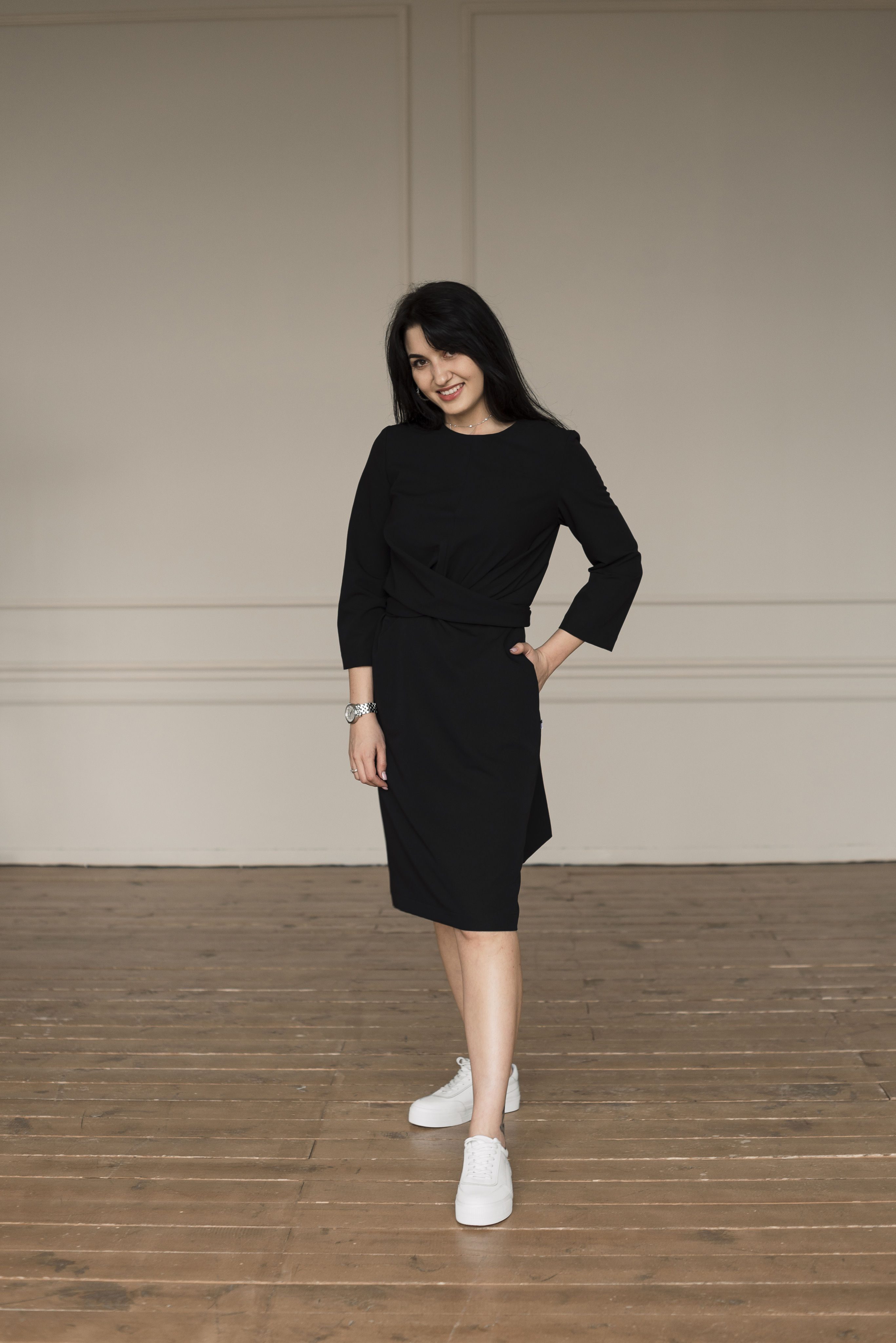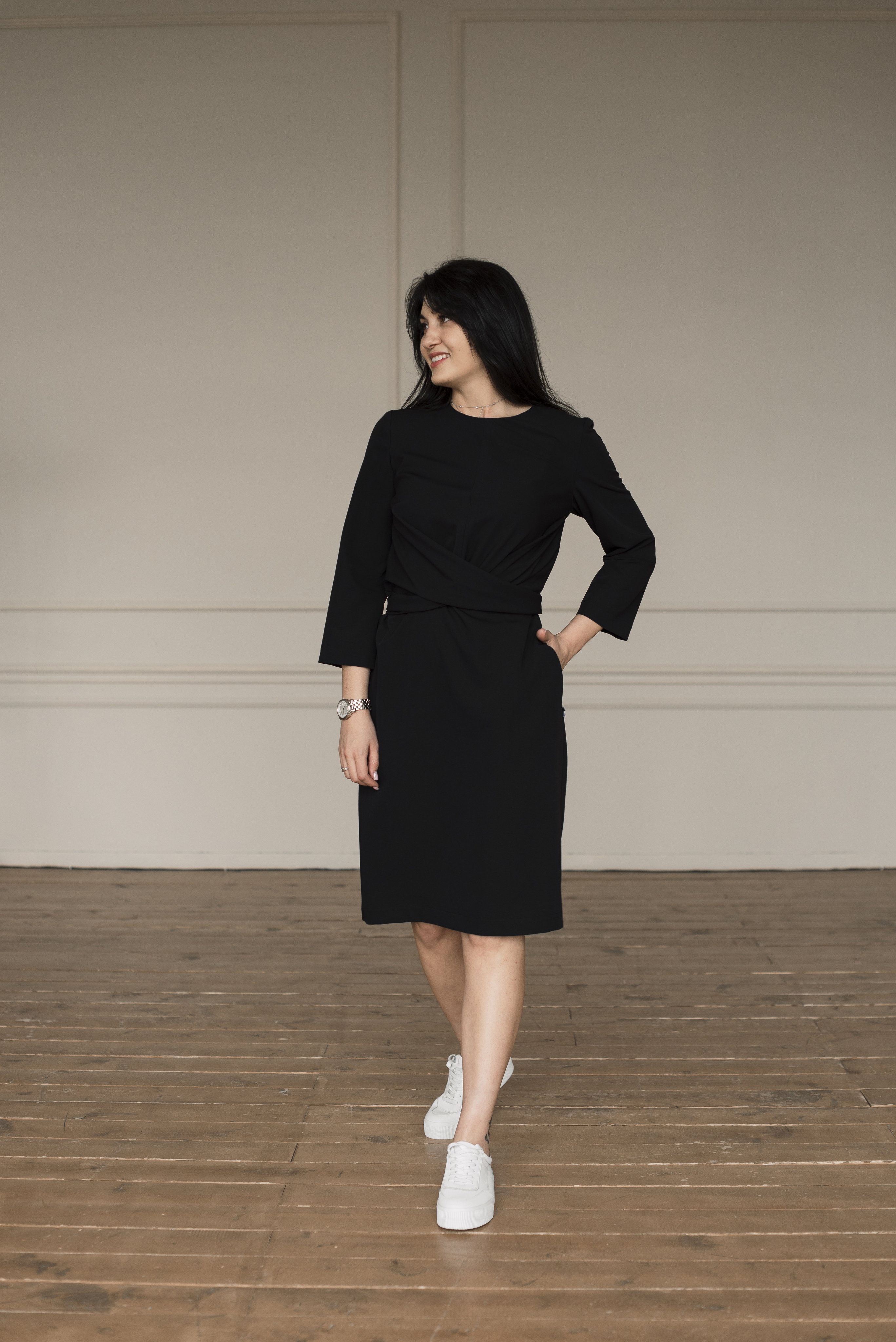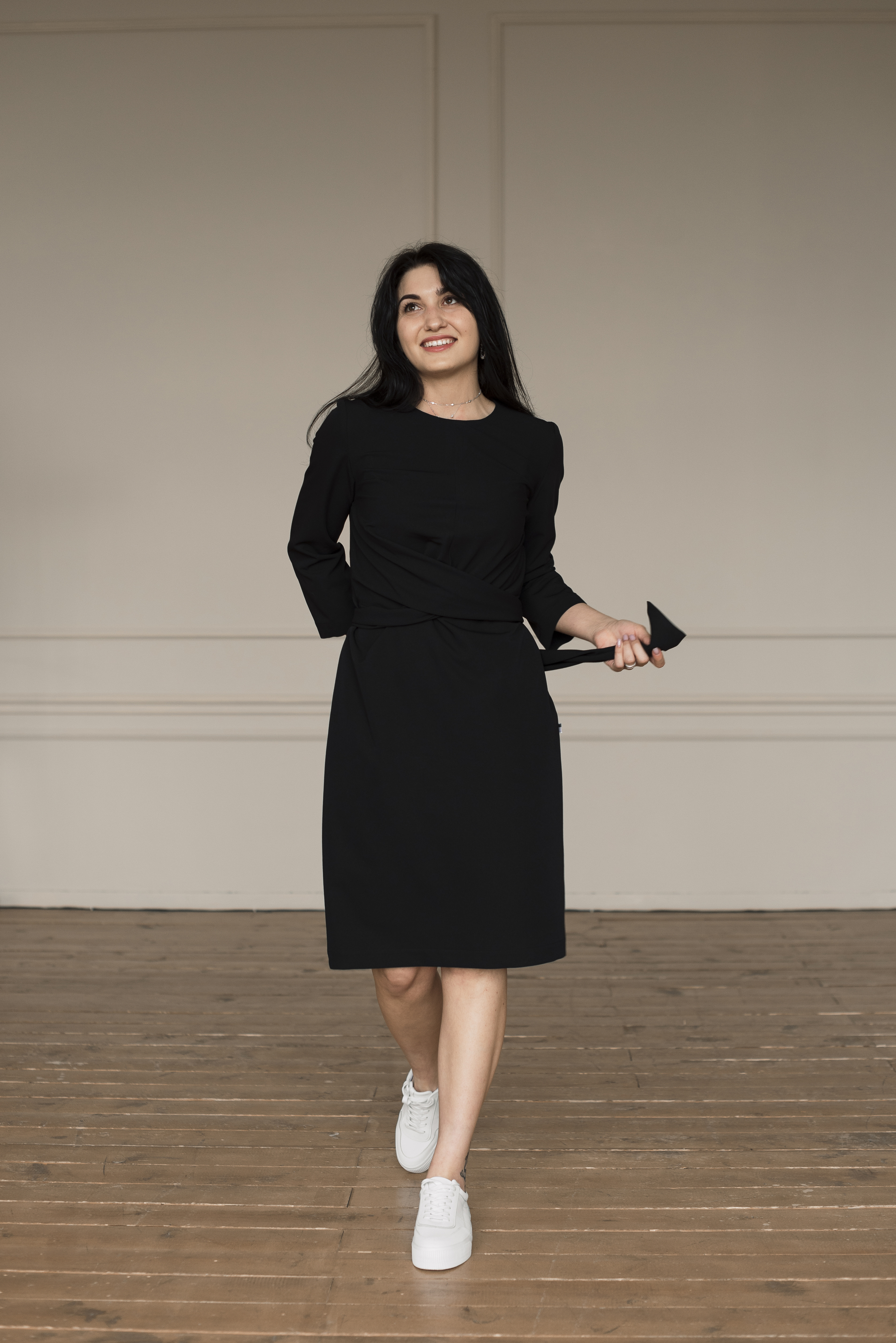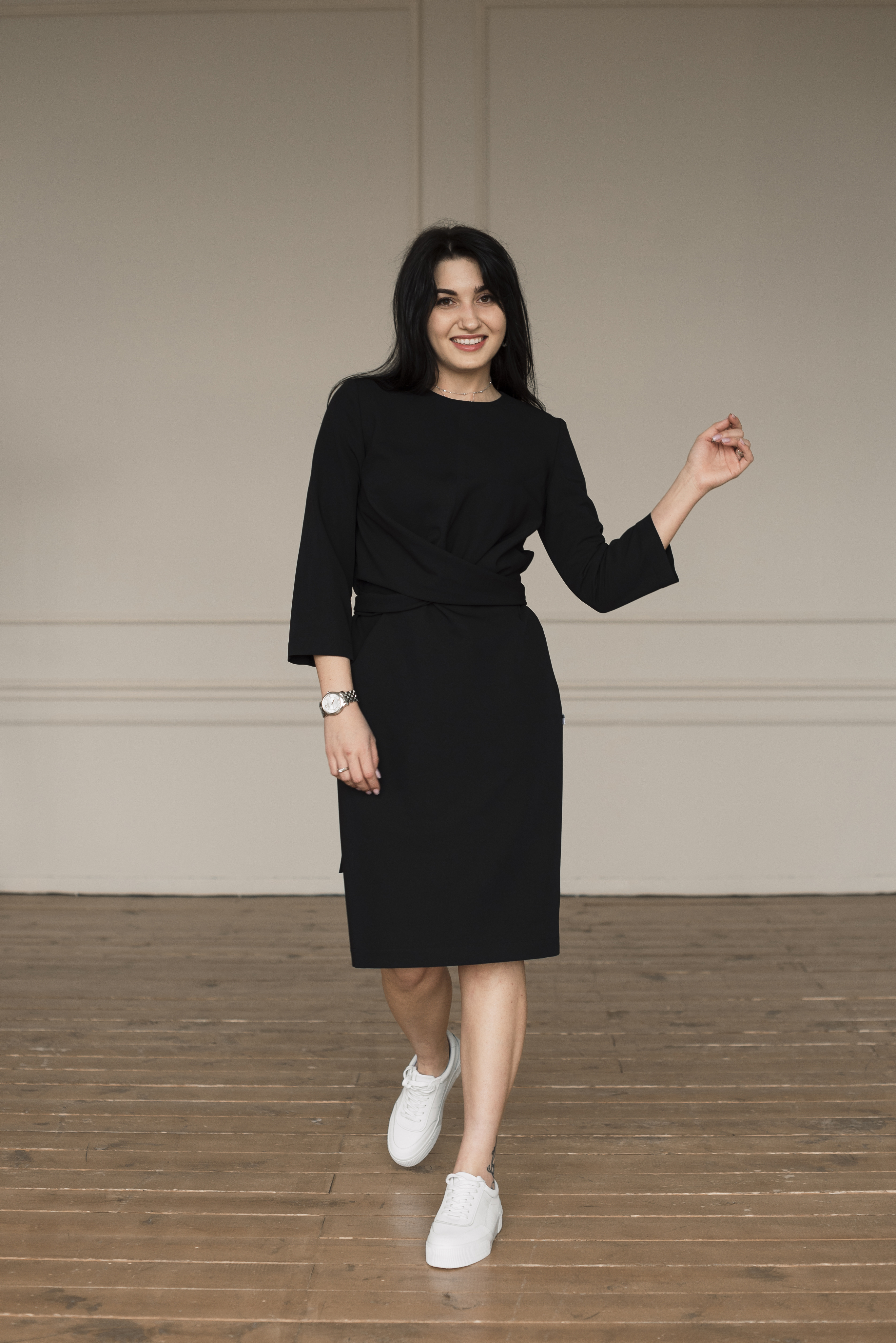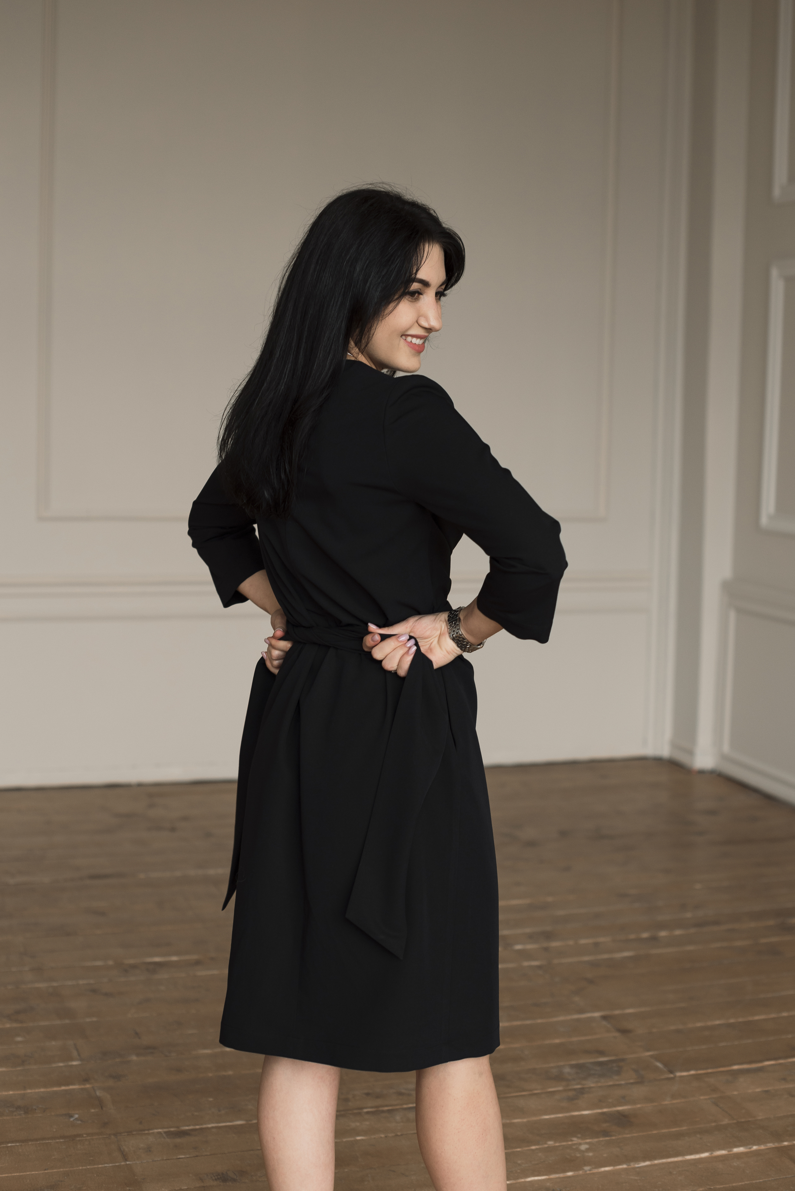 Платье женское полуприлегающего силуэта. Материал: 53% cotton, 44% polyester, 3 % Lycra. Платье имеет пояс, который перекрещивется на талии, рукав 3/4. По бокам два кармана в швах.