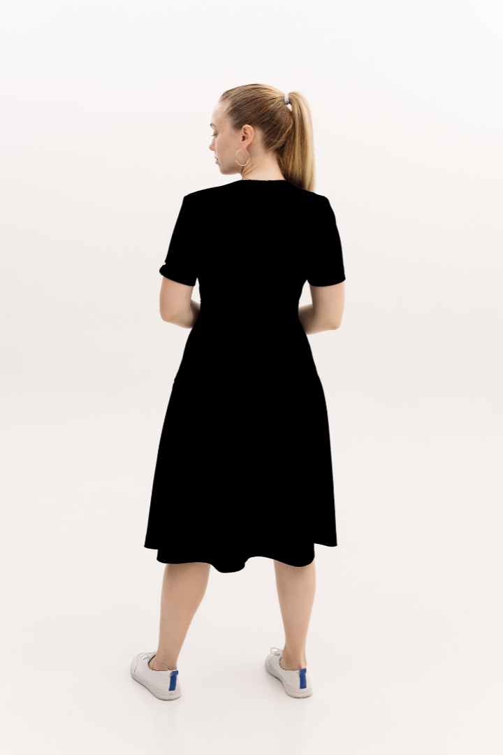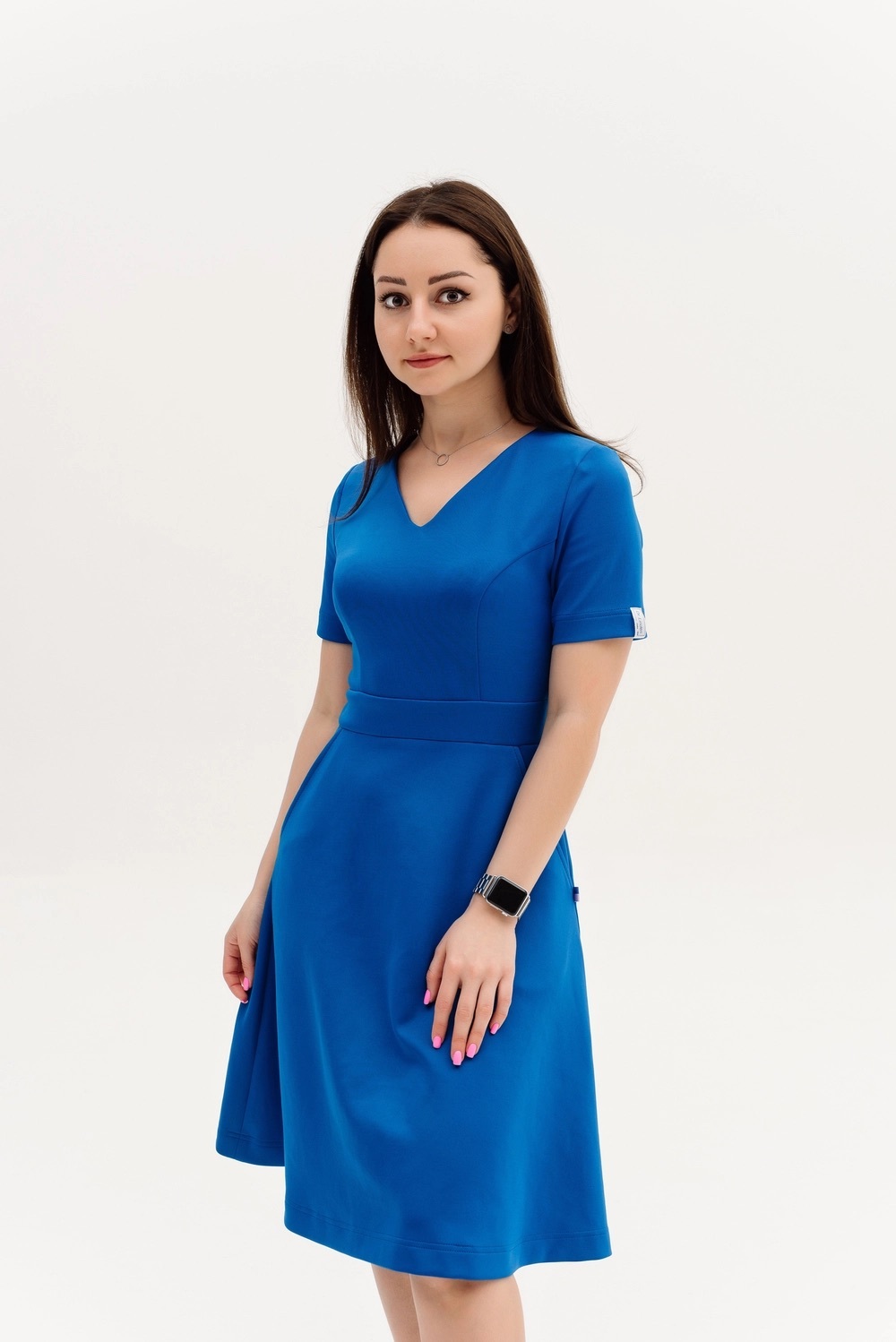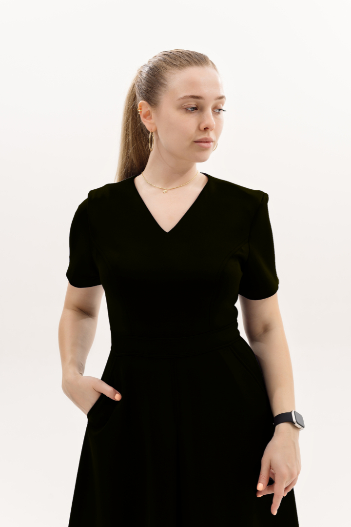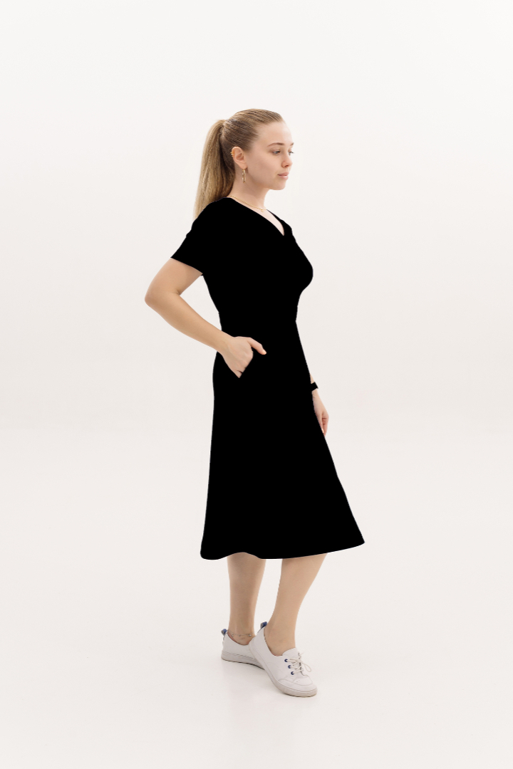 Платье с V-образным вырезом, ниже колена, рукав короткий. На талии отрезной пояс, в боковых швах карманы. Сзади молния.