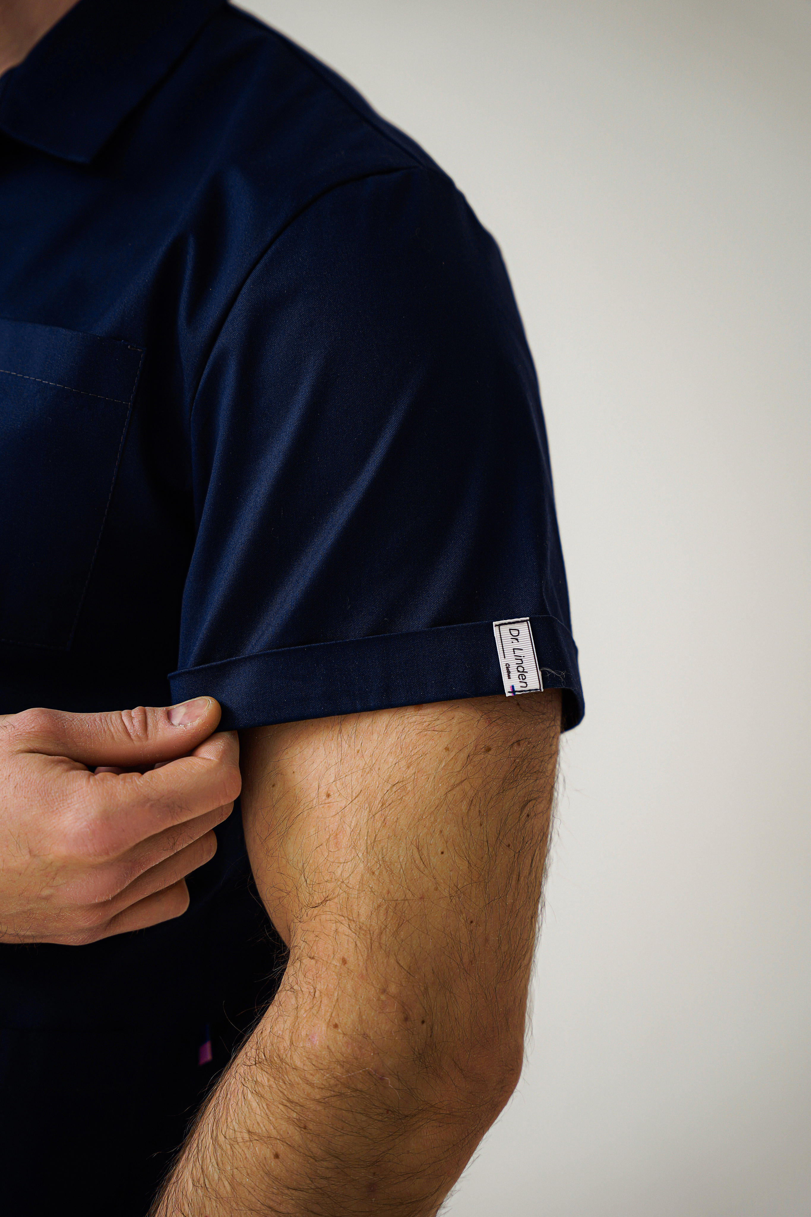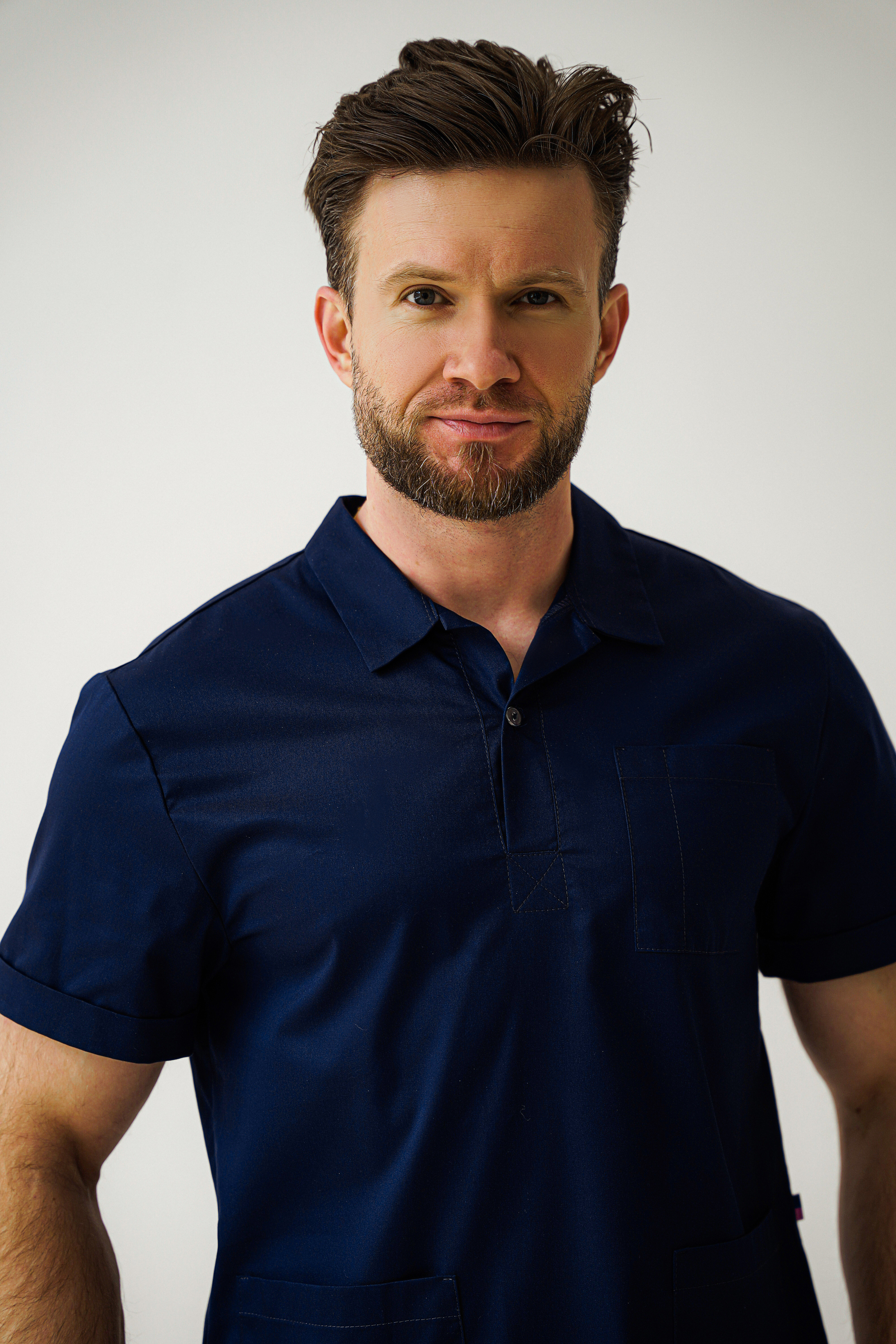 Рубашка мужская полуприлегающего силуэта. Материал: 53% cotton, 44% polyester, 3 % Lycra. Поло со стойкой. Короткий рукав с отворотом. Два накладных кармана спереди