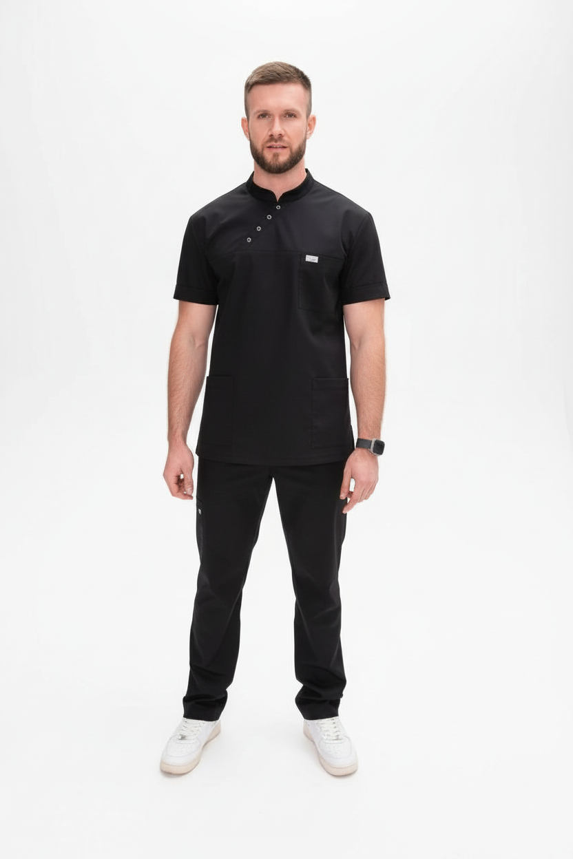 Рубашка мужская полуприлегающего силуэта. Поло со стойкой. Короткий рукав с отворотом. Два накладных кармана спереди. С застежкой на кнопках.