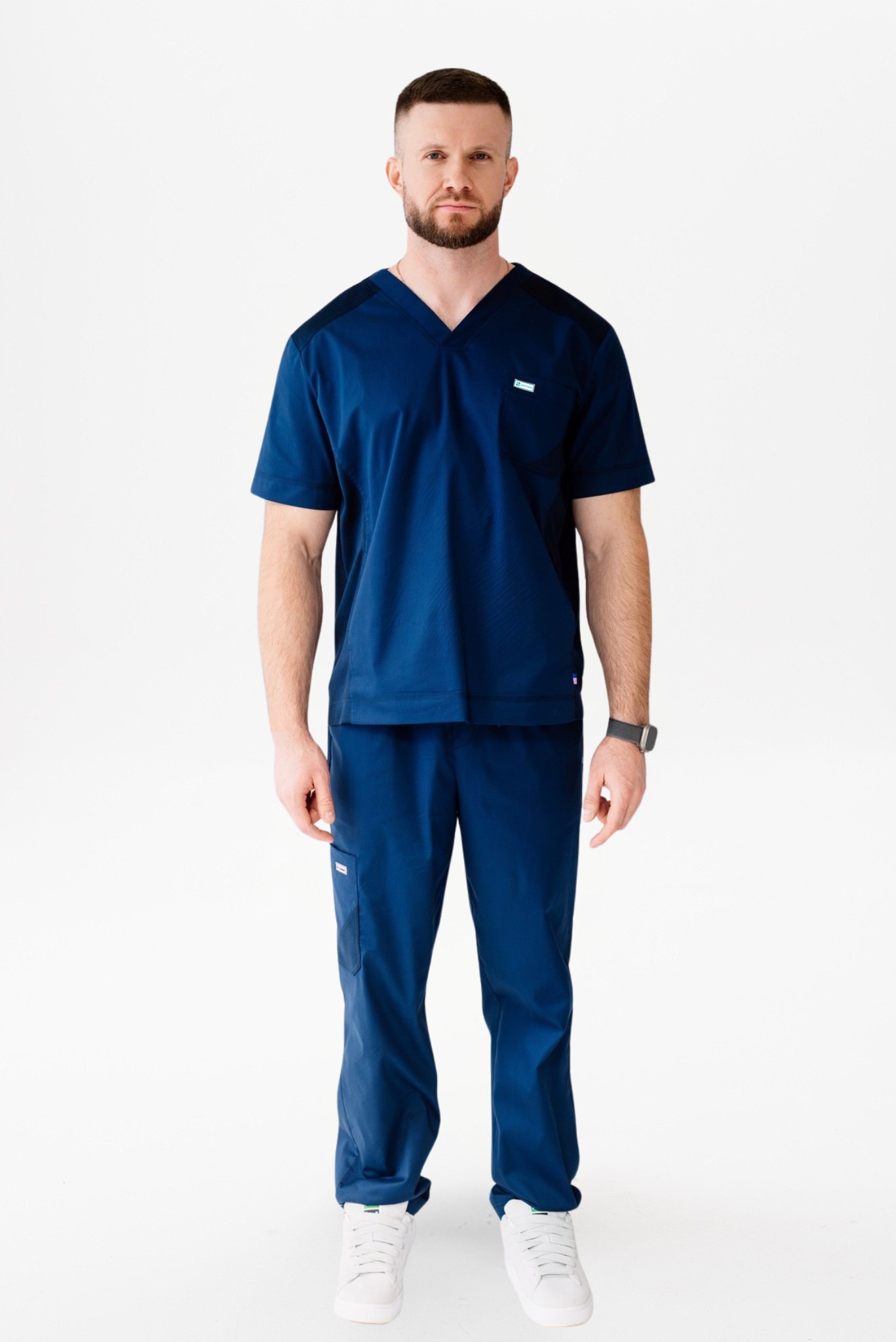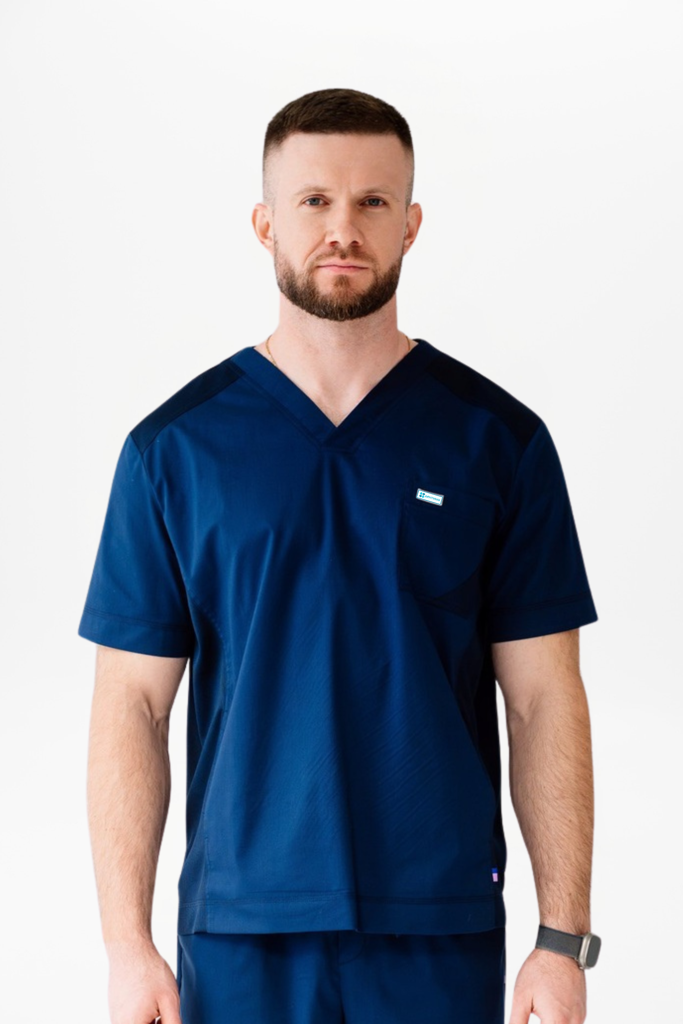 Рубашка мужская полуприлегающего силуэта. Материал: 53% cotton, 44% polyester, 3 % Lycra. Рубашка с V-образным вырезом. Короткий рукав с отворотом. Накладные карманы: один нагрудный и два спереди