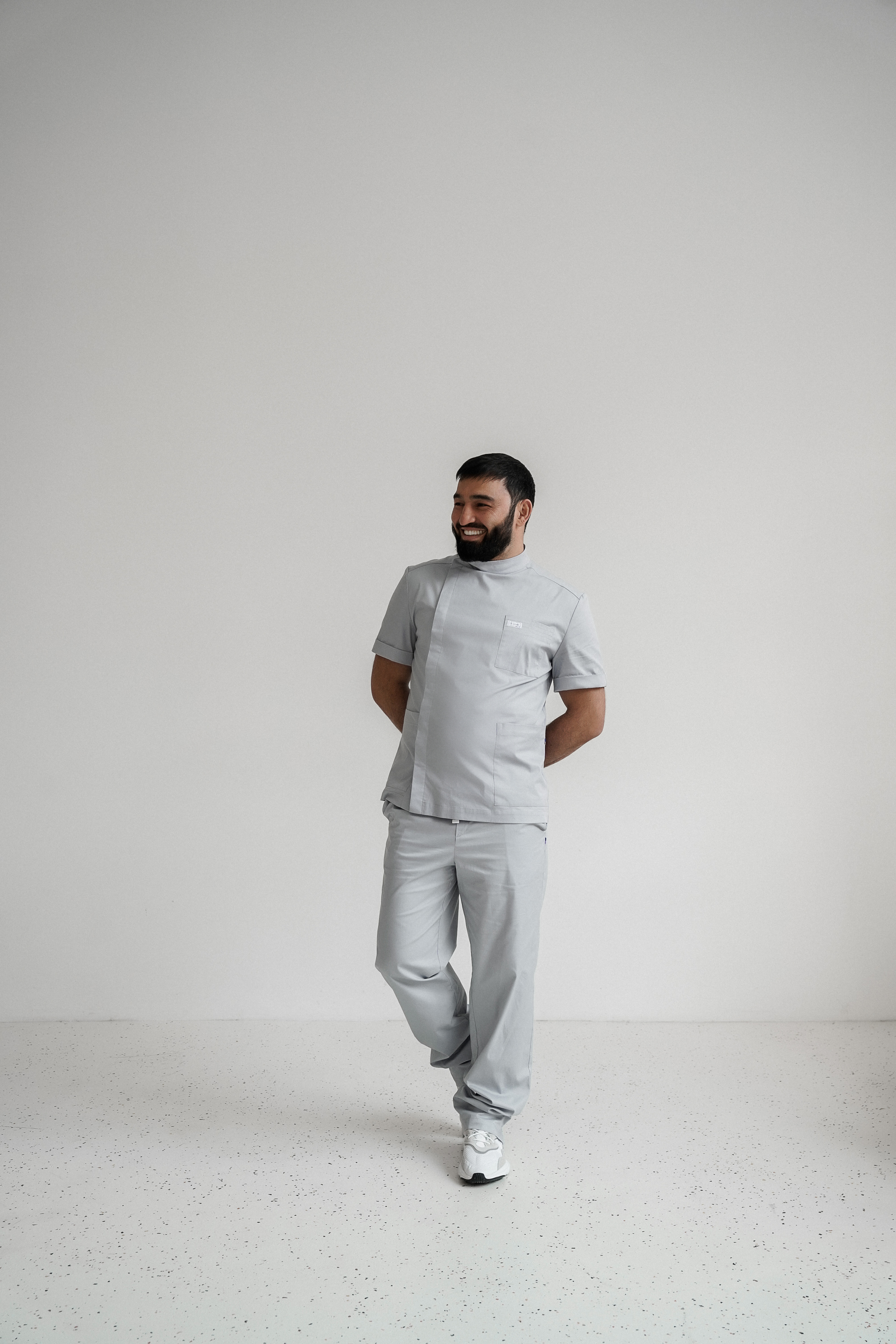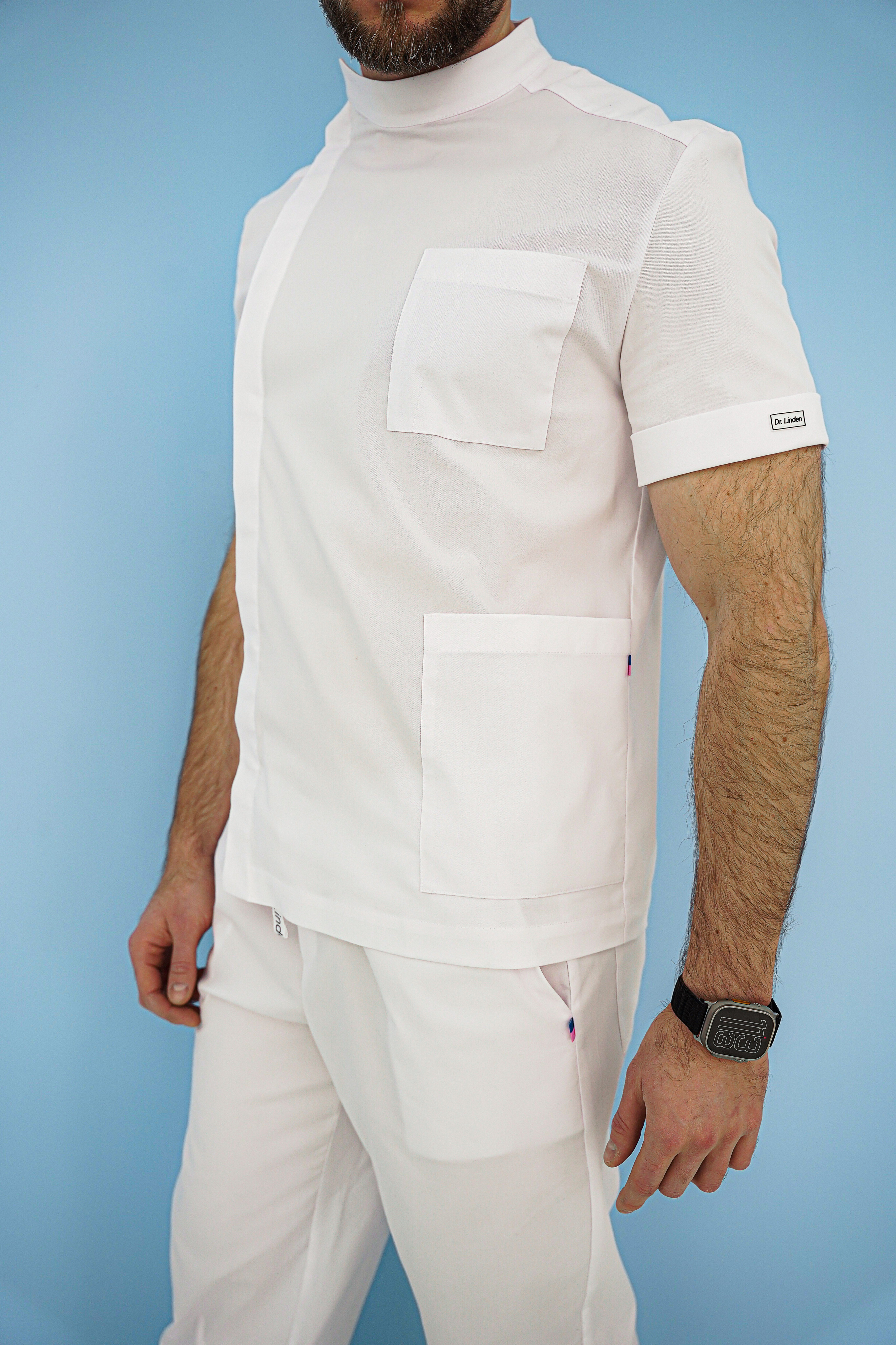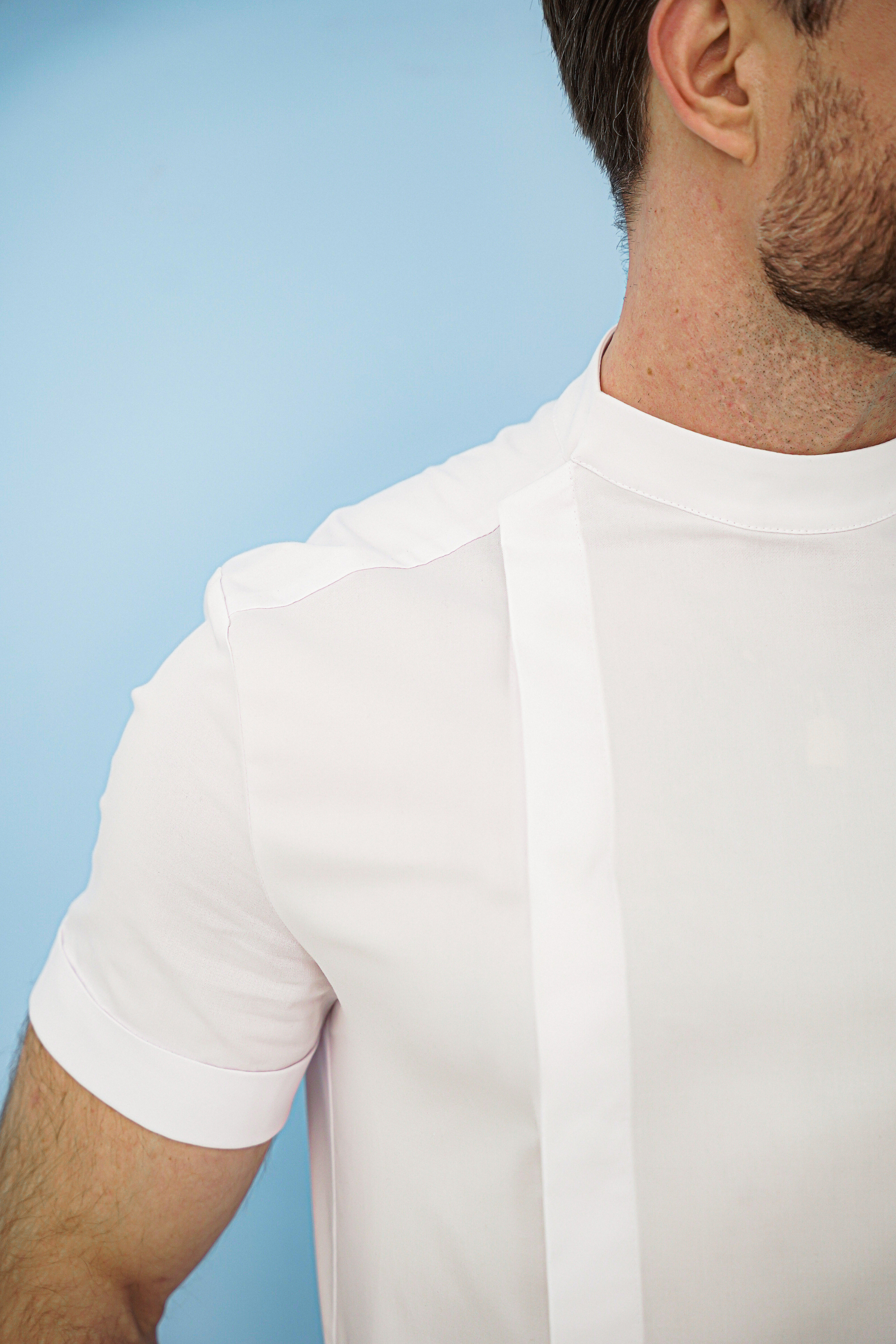 Рубашка мужская полуприлегающего силуэта. Материал: 53% cotton, 44% polyester, 3 % Lycra. Рубашка с вырезом в форме галочки. Короткий рукав с отворотом. Накладные карманы: один нагрудный и два спереди