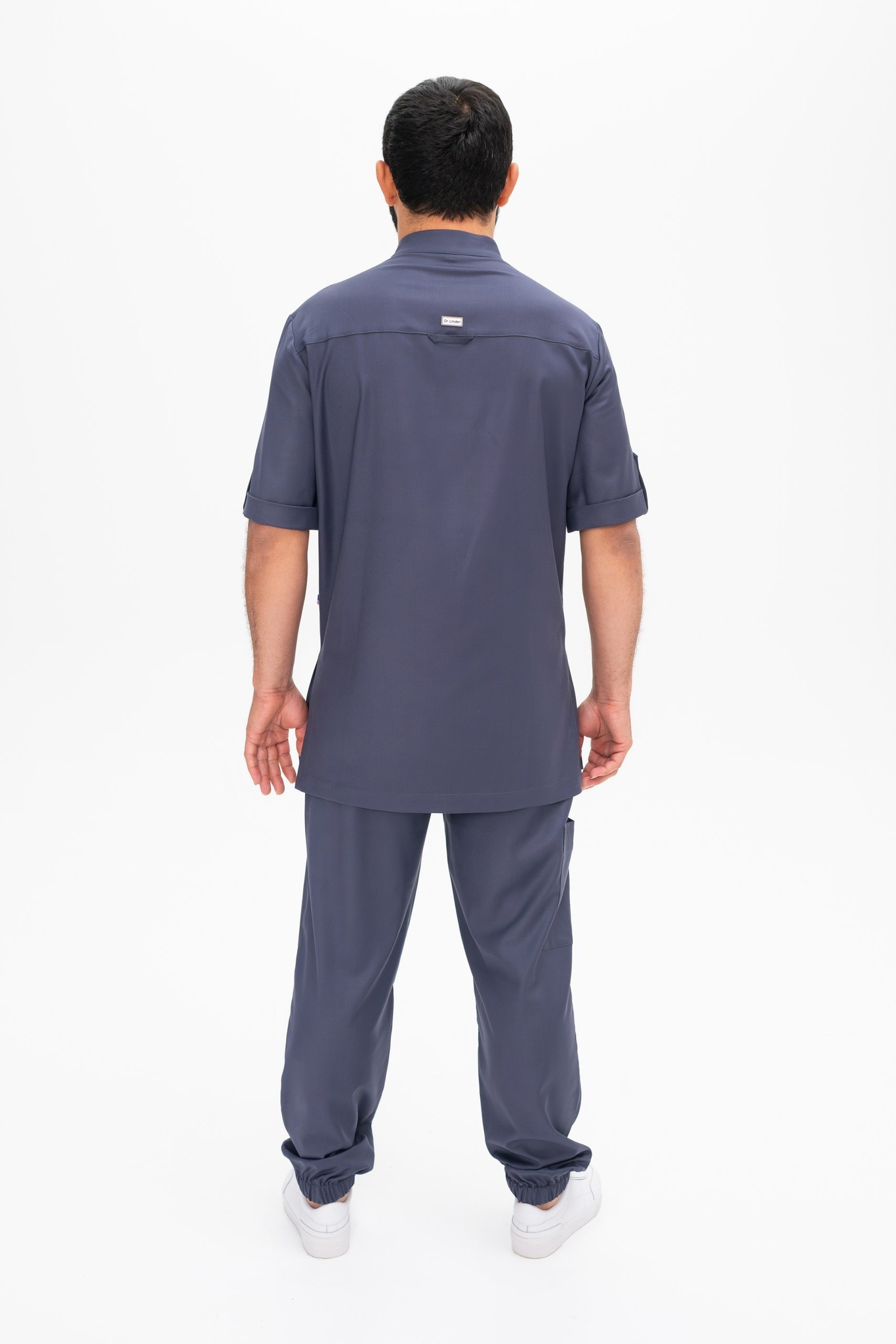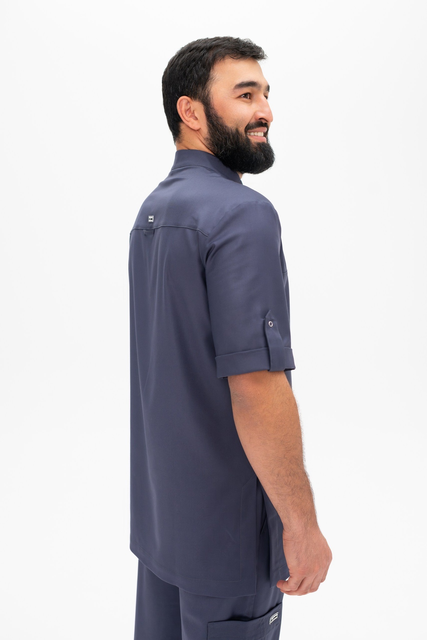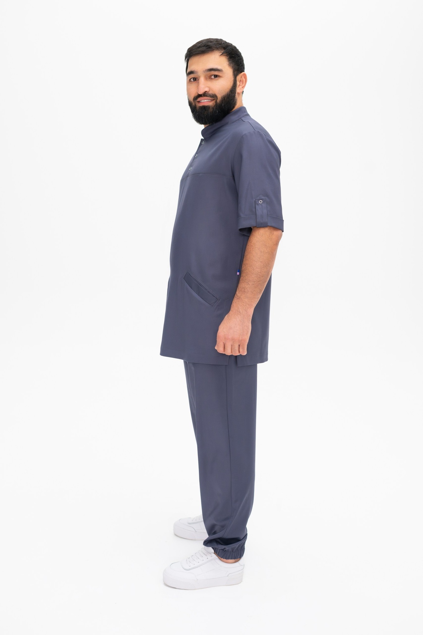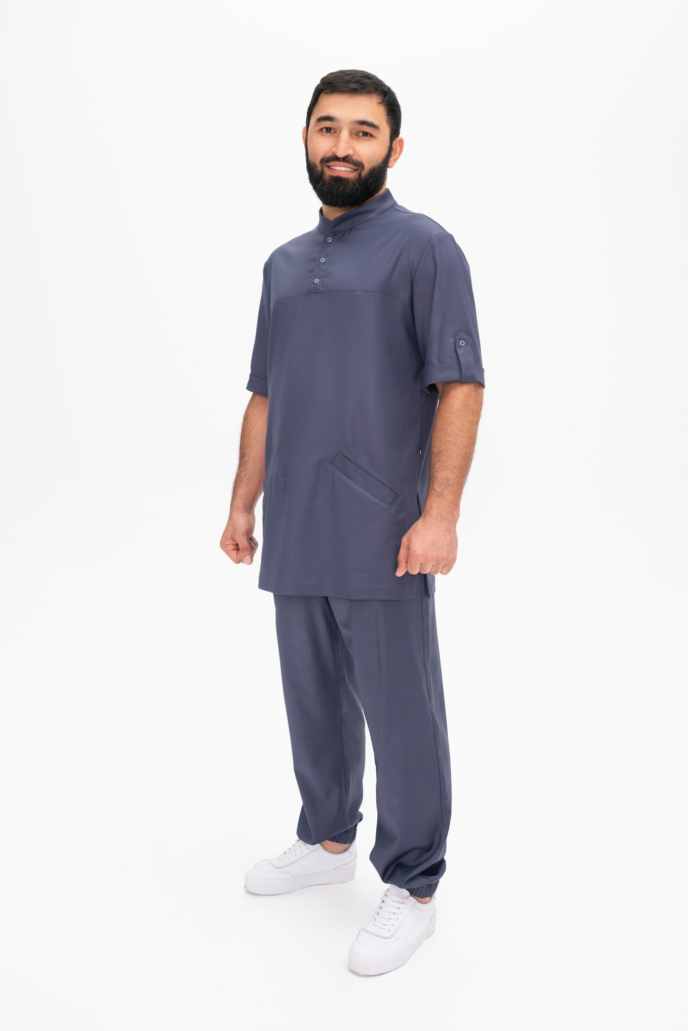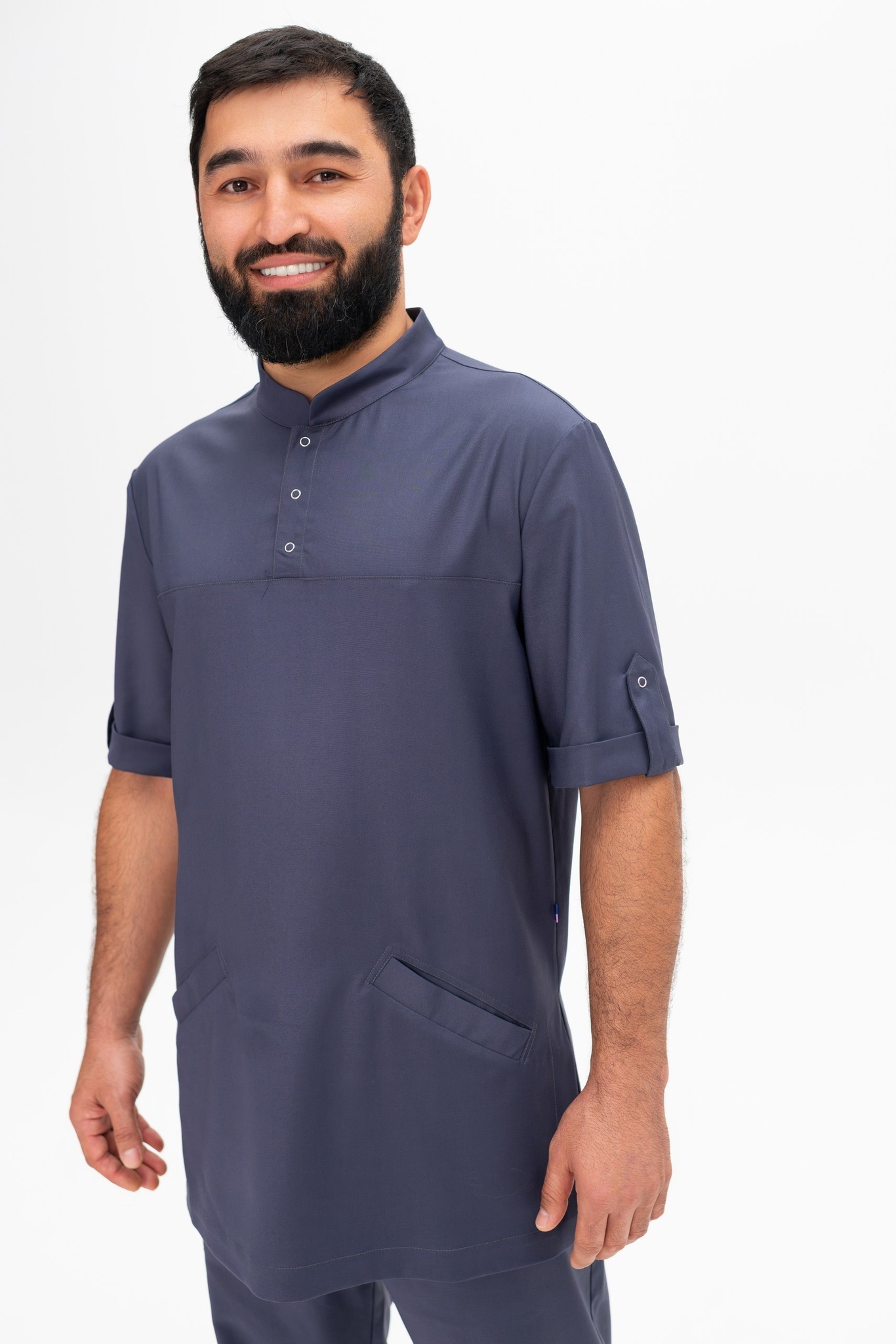 Рубашка мужская свободного силуэта. Поло со стойкой. Рукав короткий с отворотом и кнопкой. Два накладных кармана спереди.