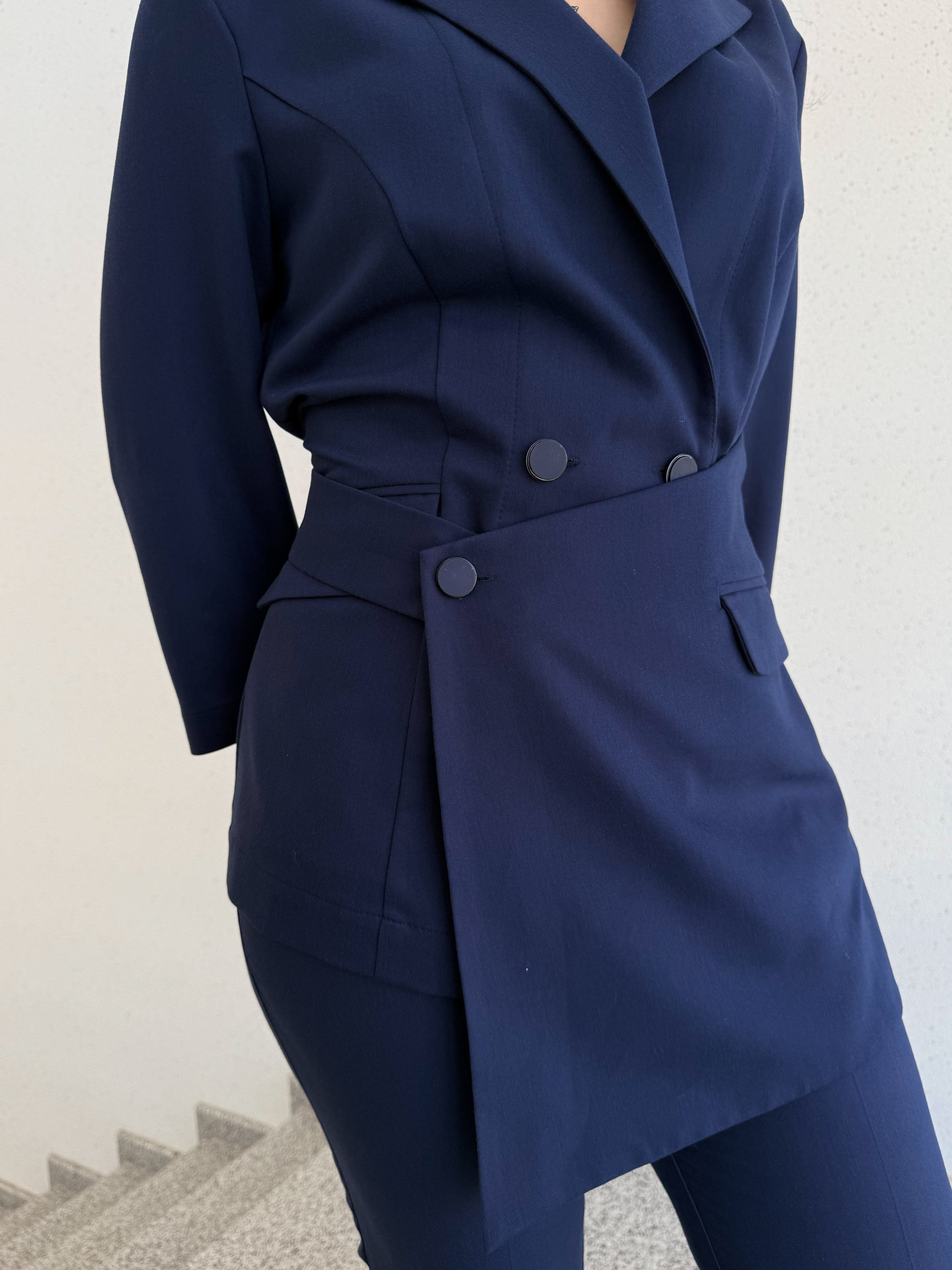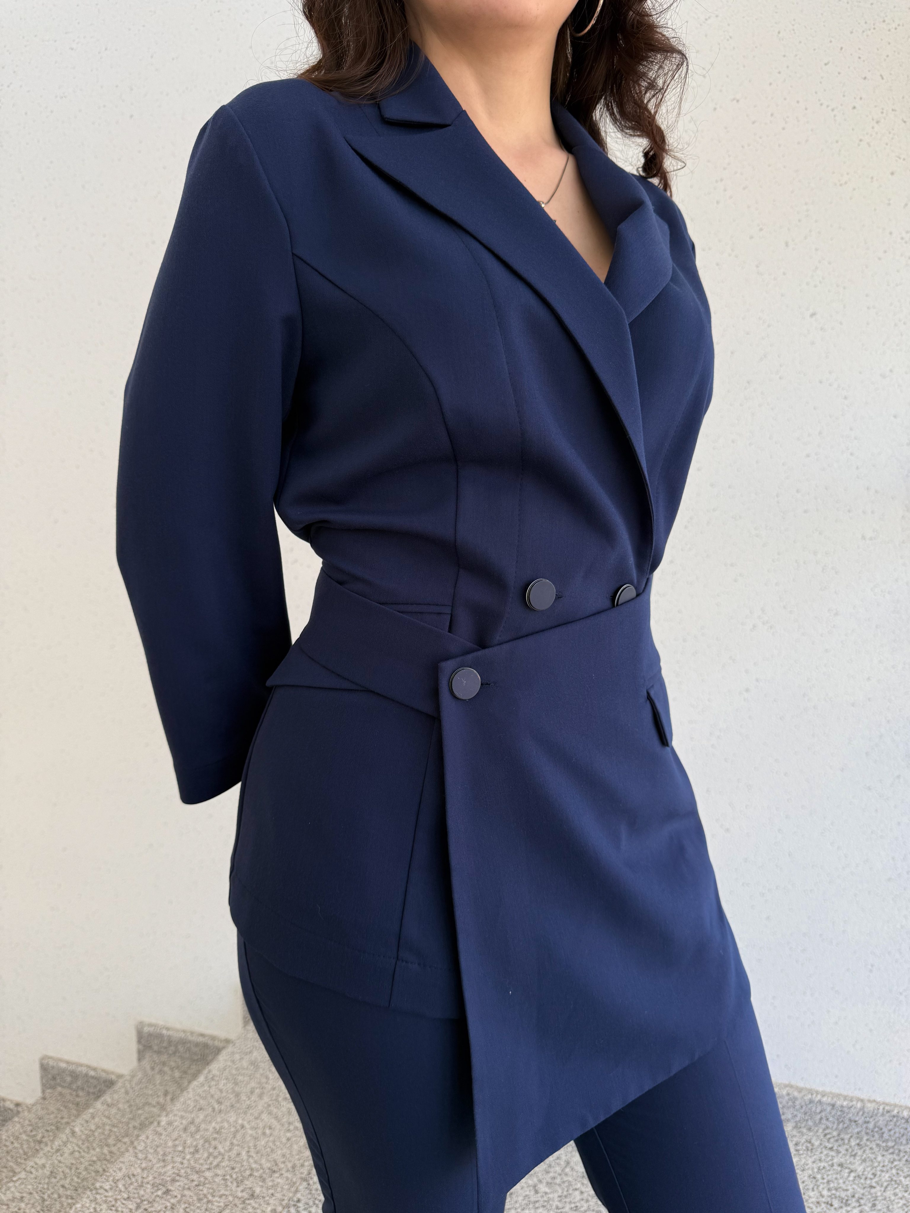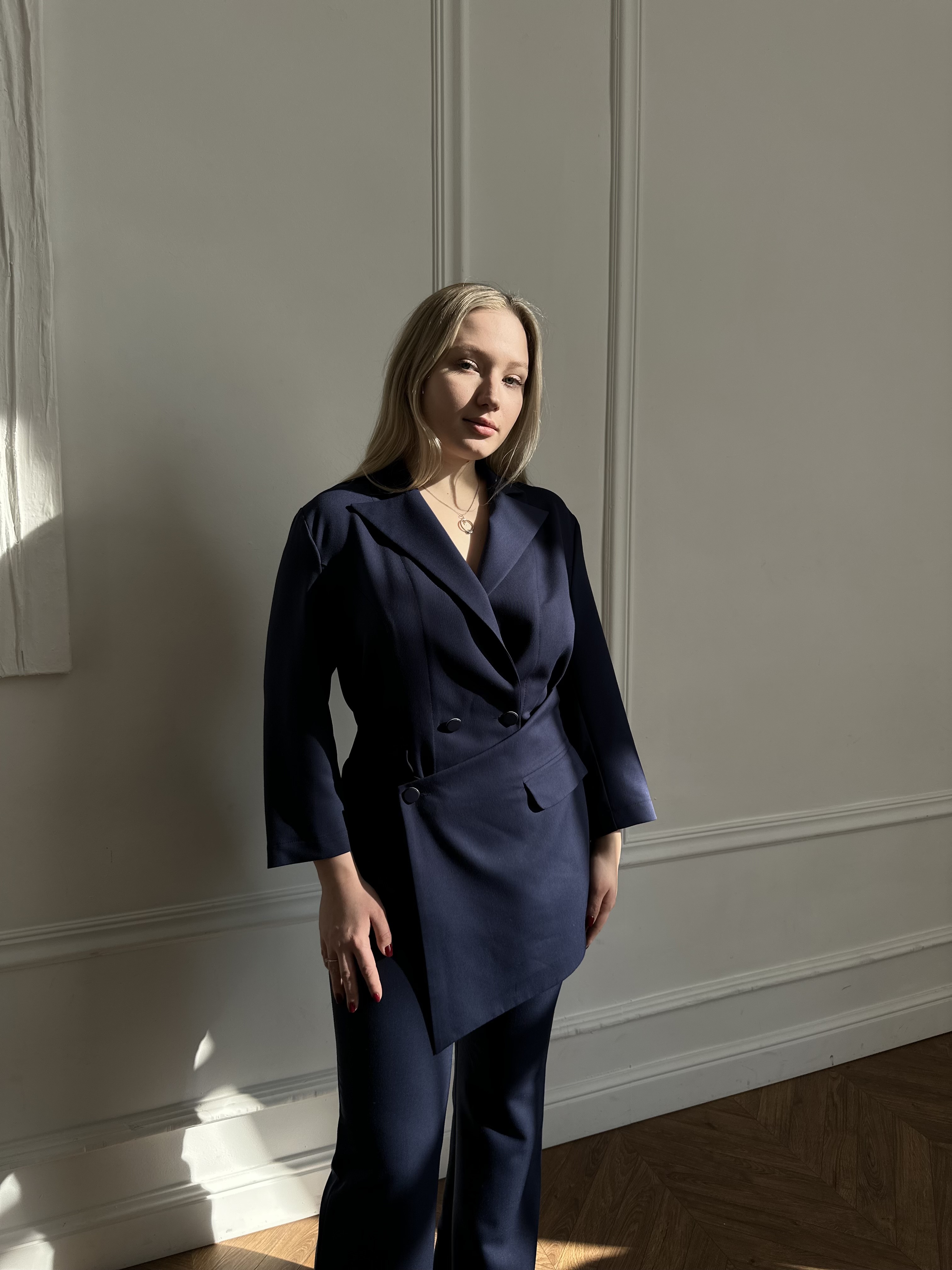 Жакет женский полуприлегающего силуэта. Модель застёгивается на пуговицы и украшена поясом. Английский вырез. Рукав длинный или 3/4 . Дополняет жакет элегантный фартук с застежкой на пуговице. Также спереди находятся два врезных кармана с клапанами.