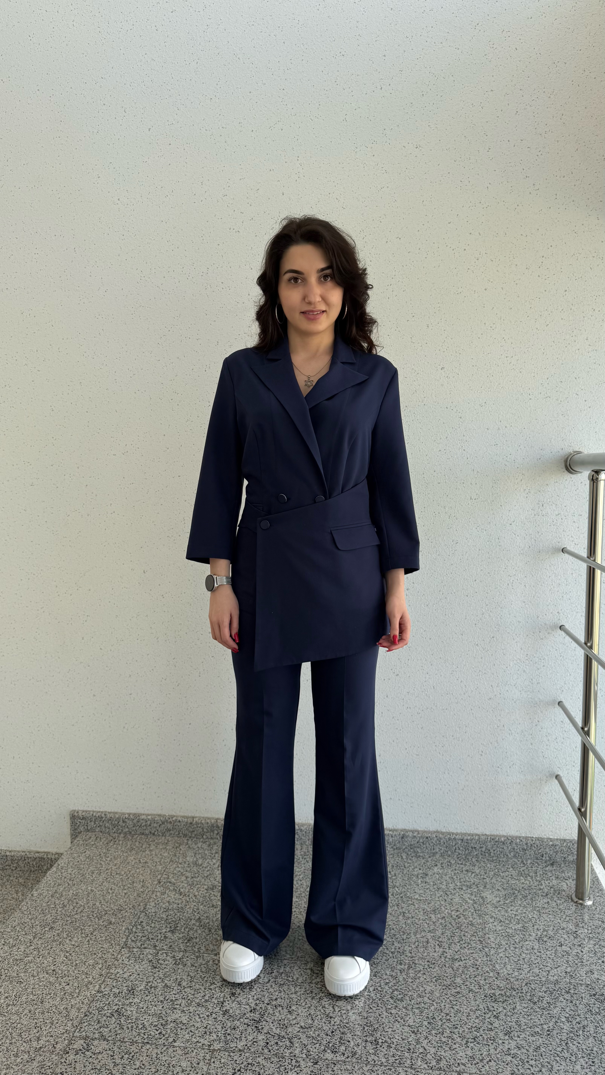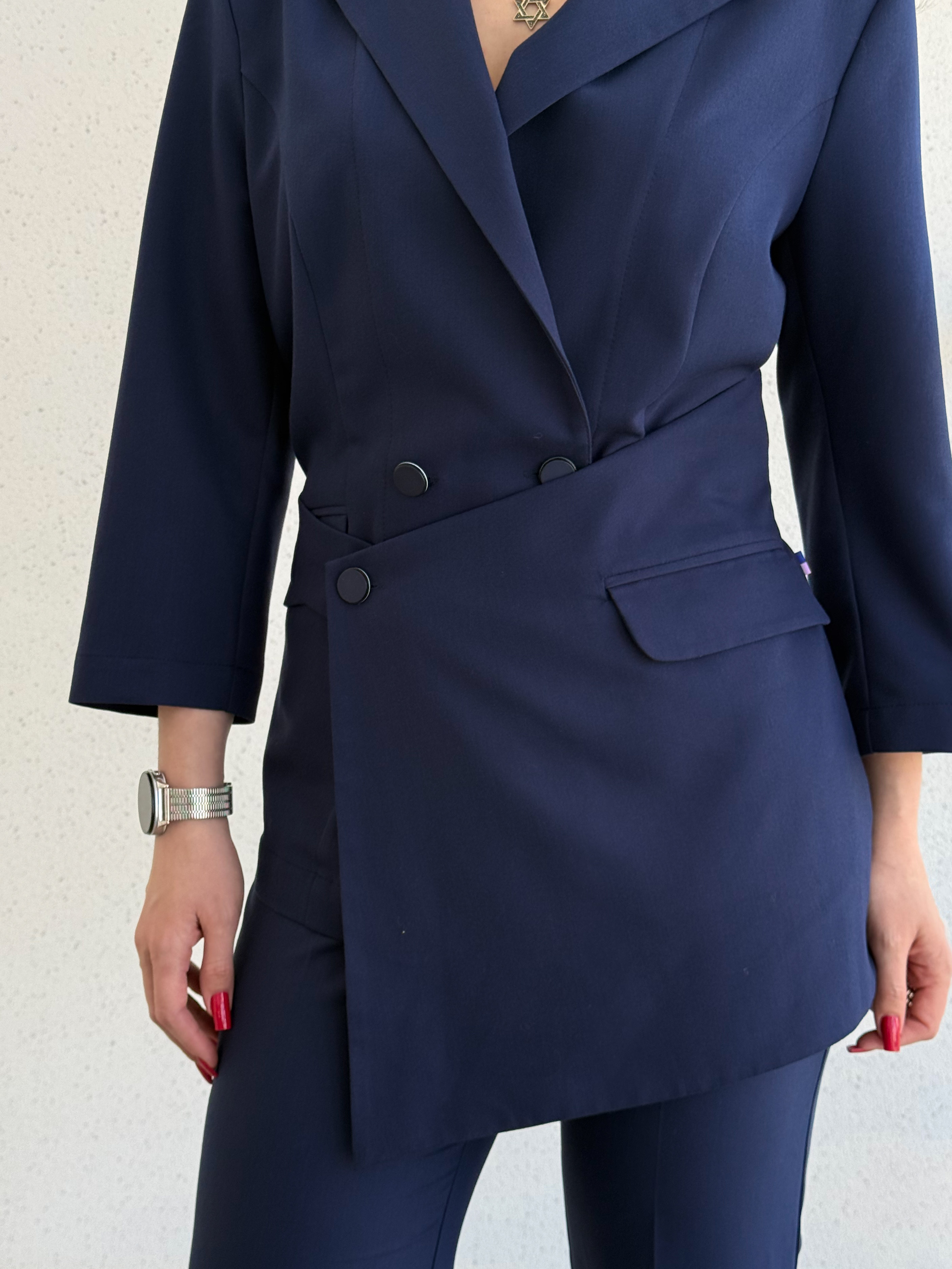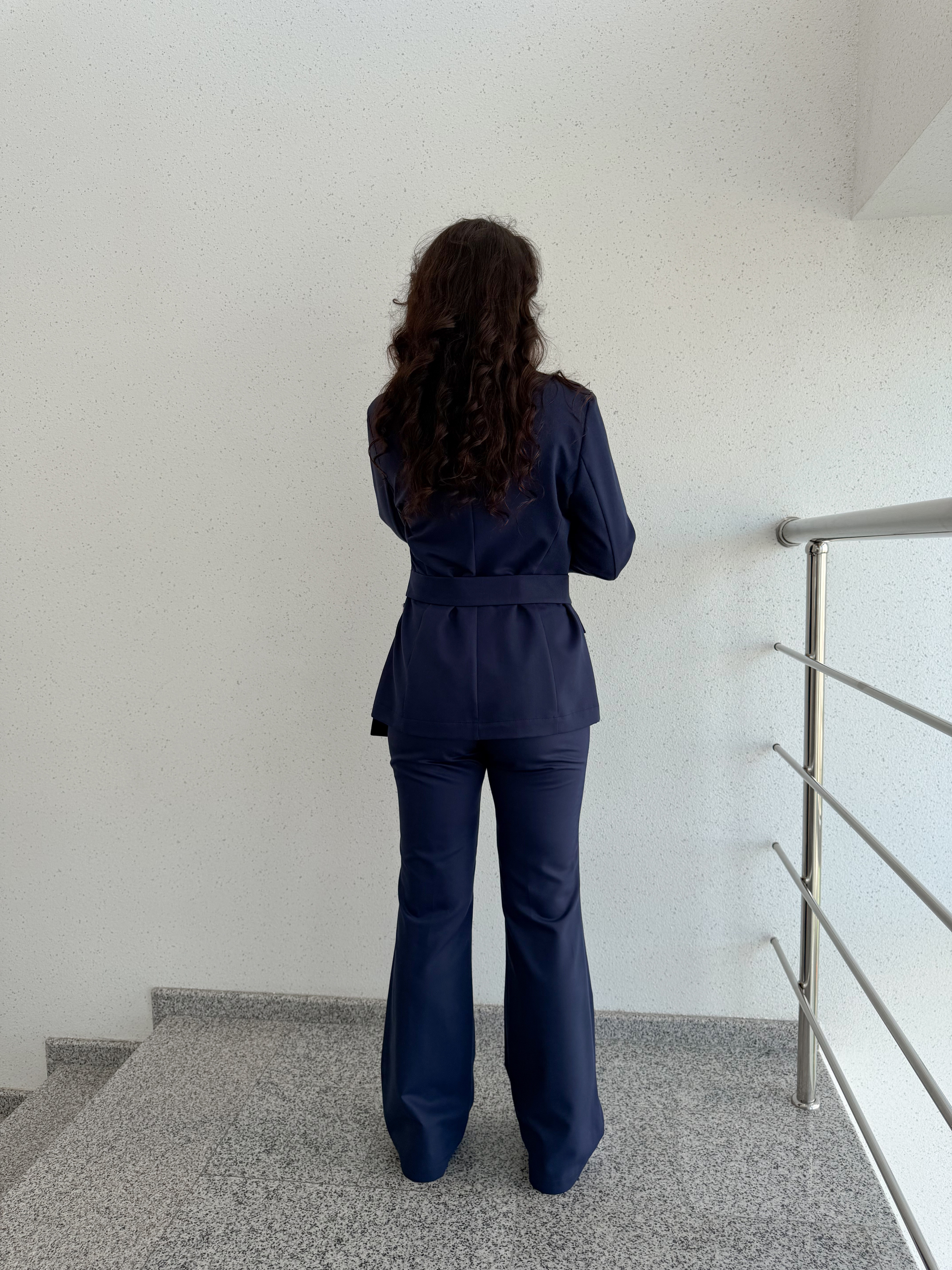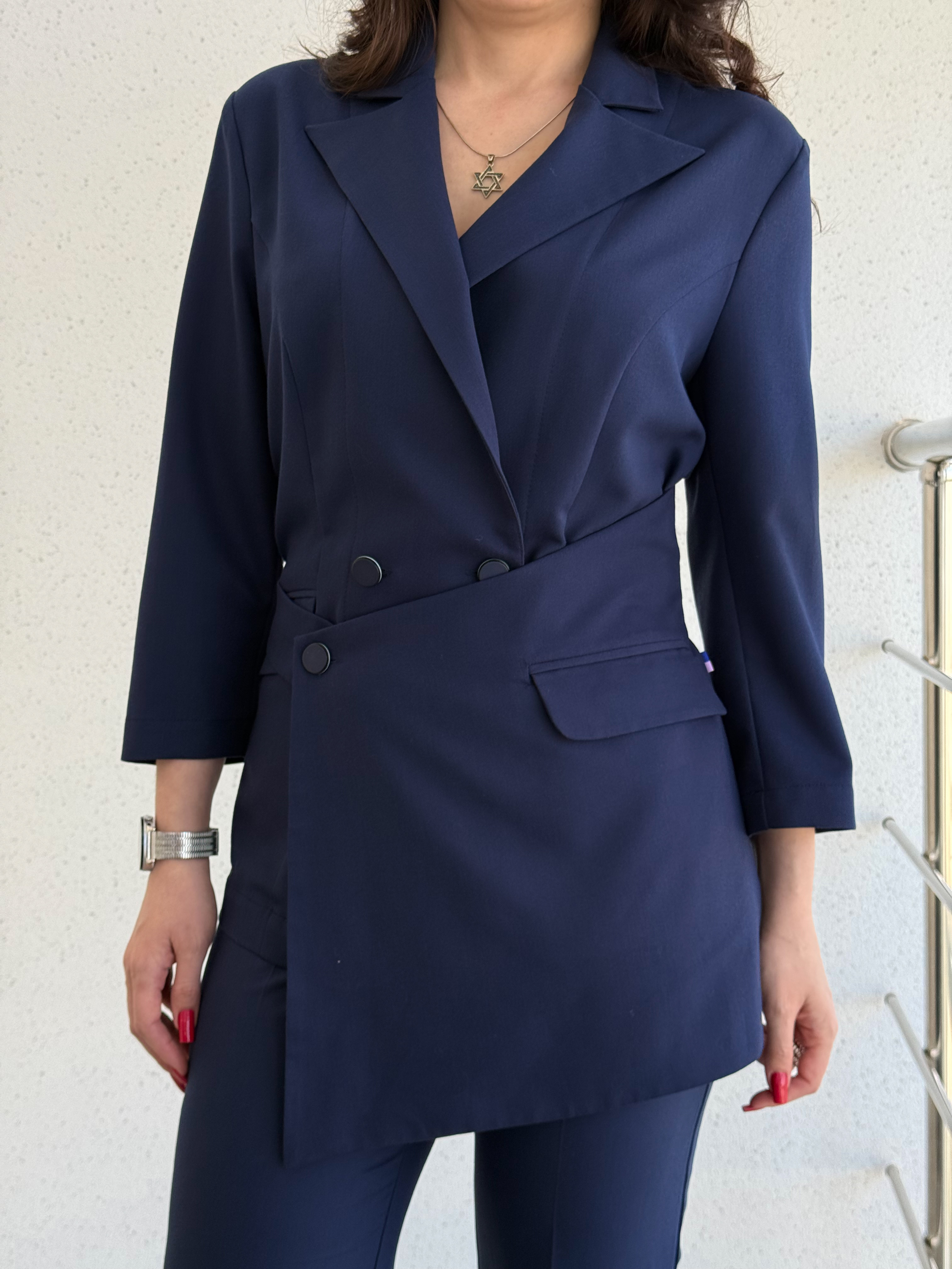 Жакет женский полуприлегающего силуэта. Модель застёгивается на пуговицы и украшена поясом. Английский вырез. Рукав длинный или 3/4 . Дополняет жакет элегантный фартук с застежкой на пуговице. Также спереди находятся два врезных кармана с клапанами.