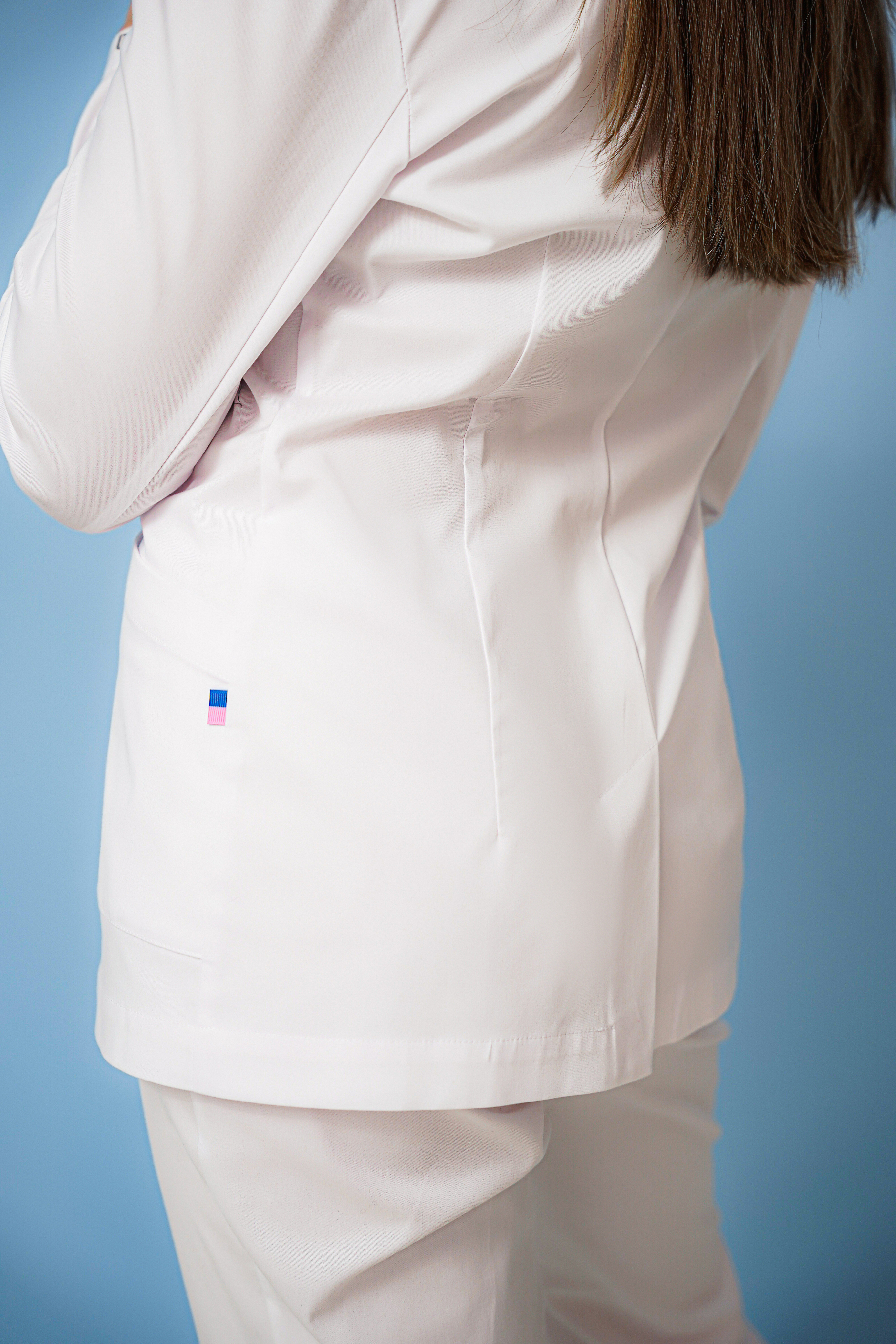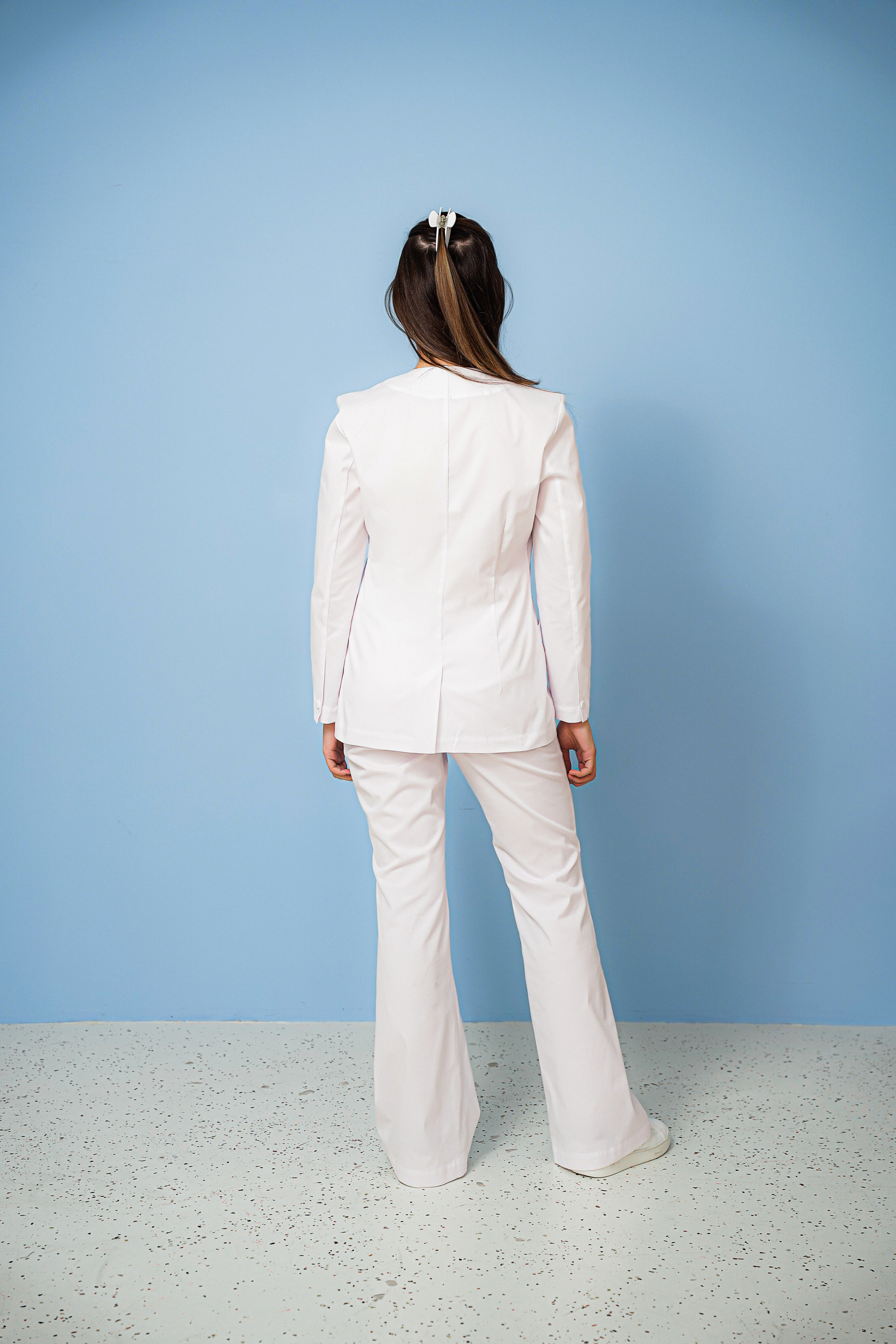 Жакет женский полуприлегающего силуэта Материал: 53% cotton, 44% polyester, 3 % Lycra. Жакет имеет элегантный V-образный вырез, длинный рукав со шлицей и пуговицами. Сзади шлица. По бокам два накладных кармана.