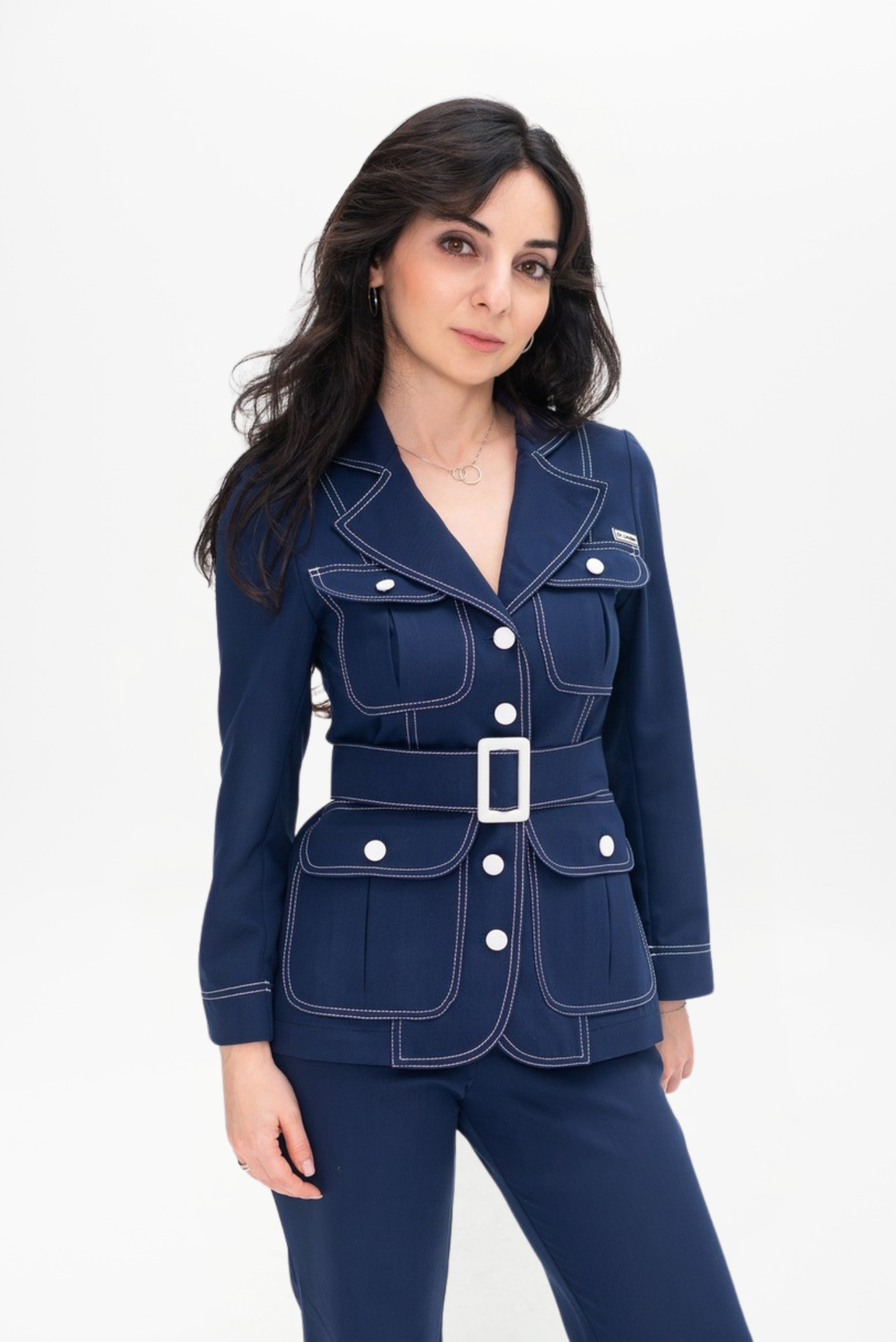Жакет женский полуприлегающего силуэта с длинными рукавами. Материал: 53% cotton, 44% polyester, 3 % Lycra Жакет выполнен в стиле милитари с отлитными деталями на груди и накладными карманами внизу. На плечах погоны. Рукав длинный с манжетом. На талии съёмный пояс с пряжкой. На жакете контрастные пуговицы.