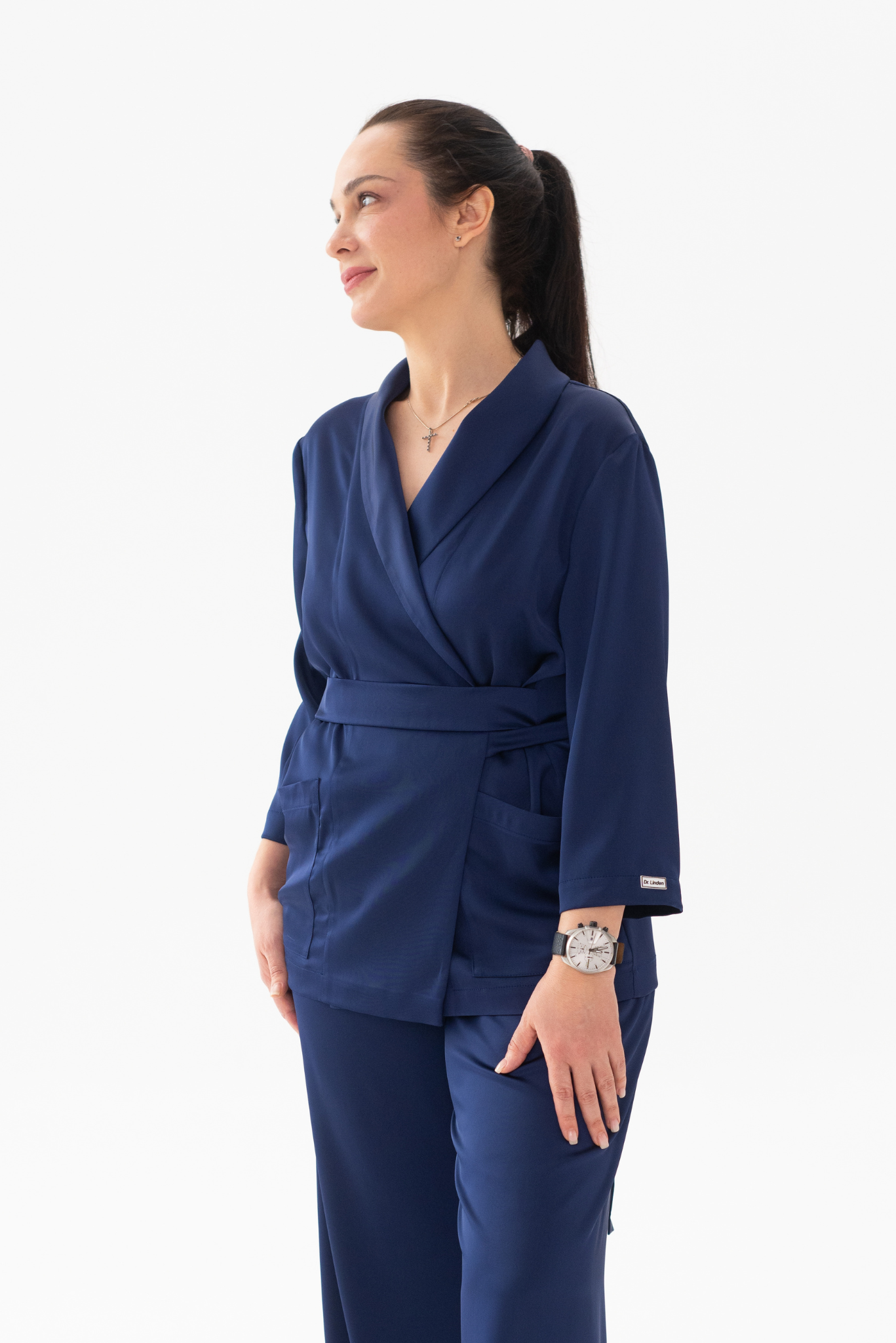 Жакет на завязках на поясе. Спереди находятся два накладных кармана.