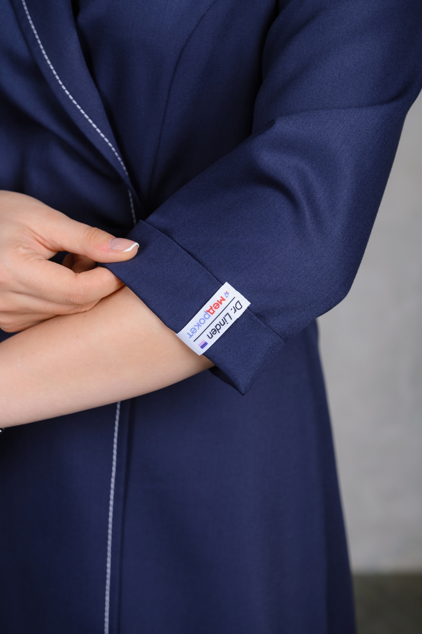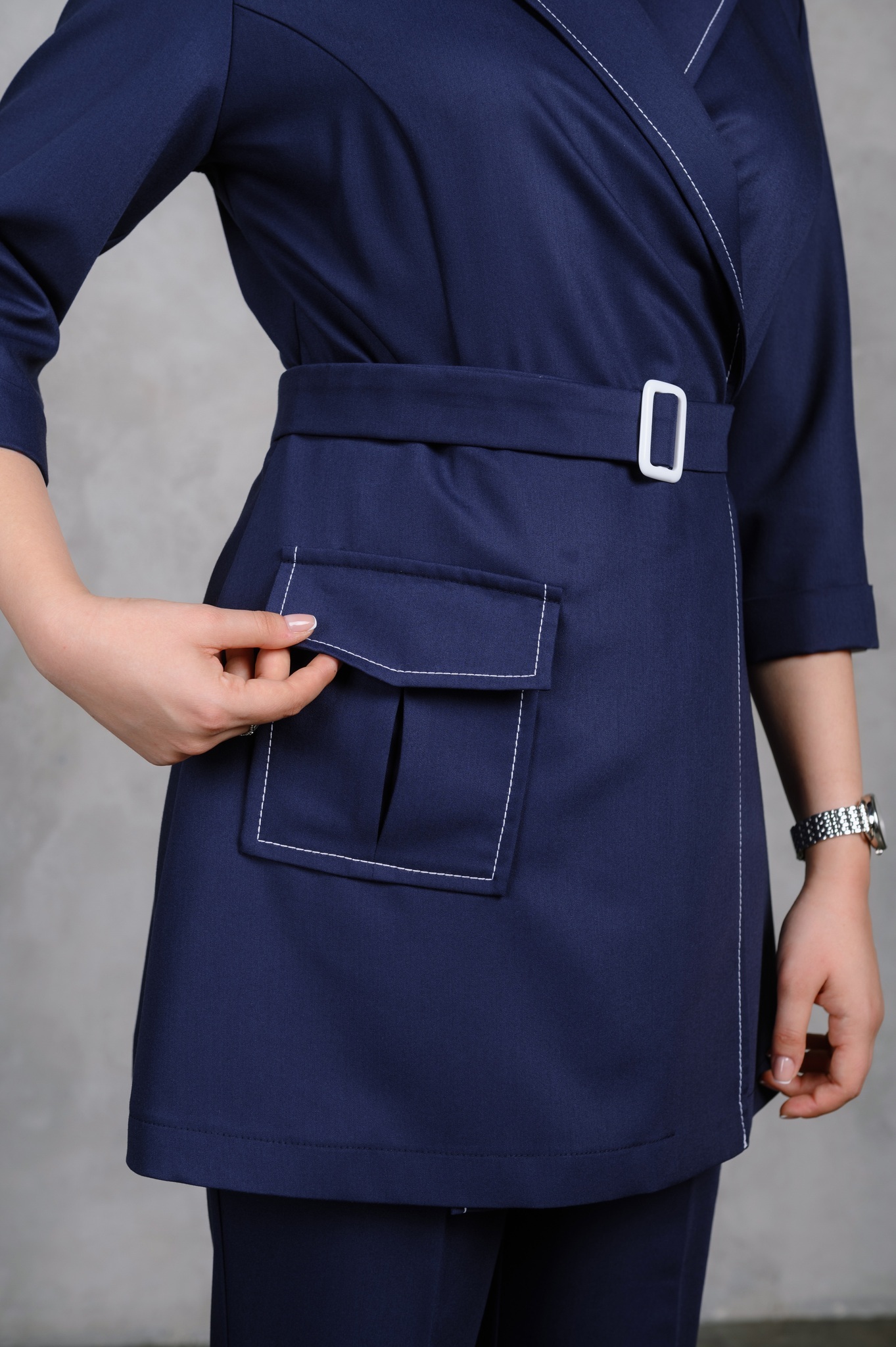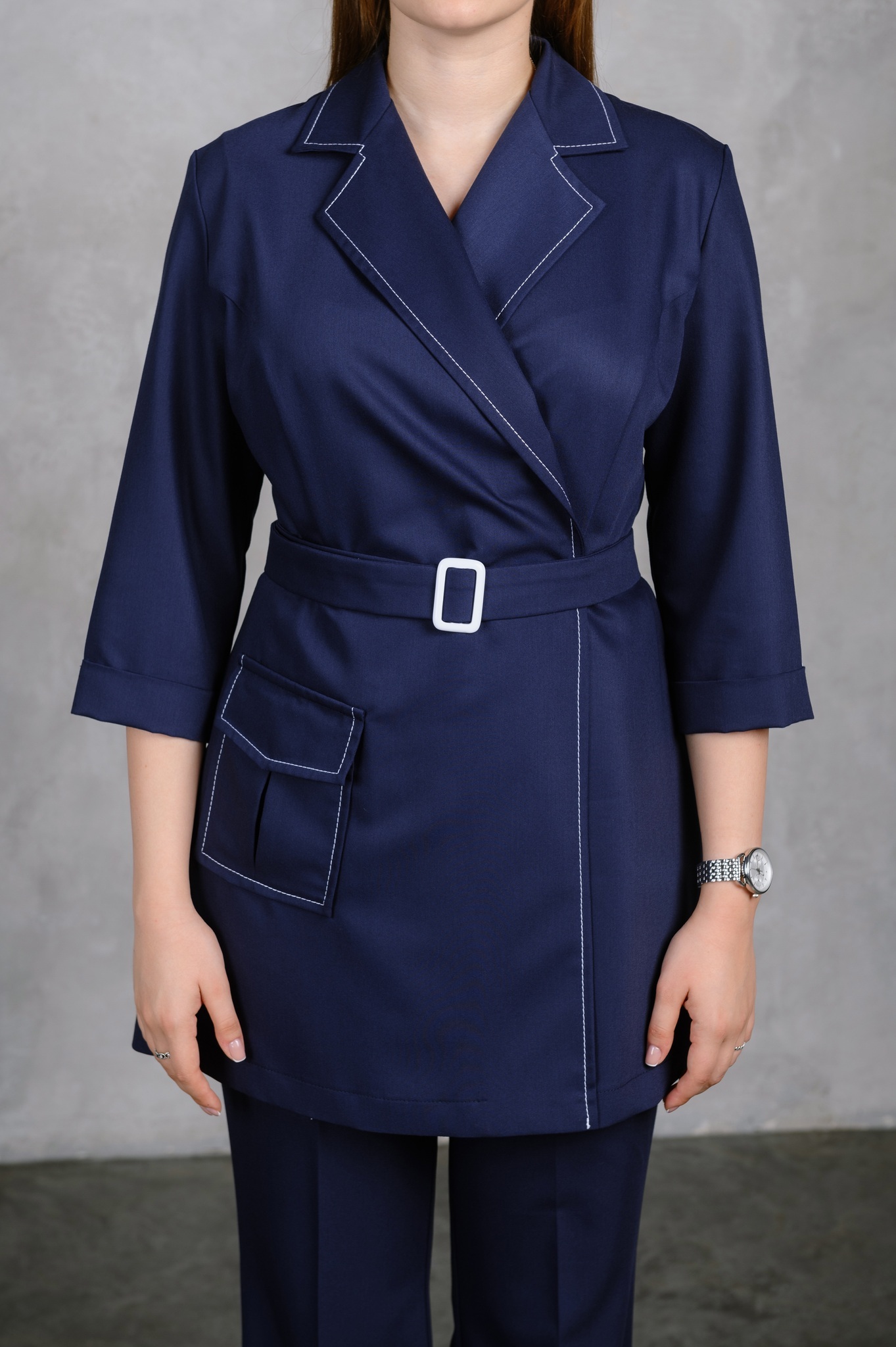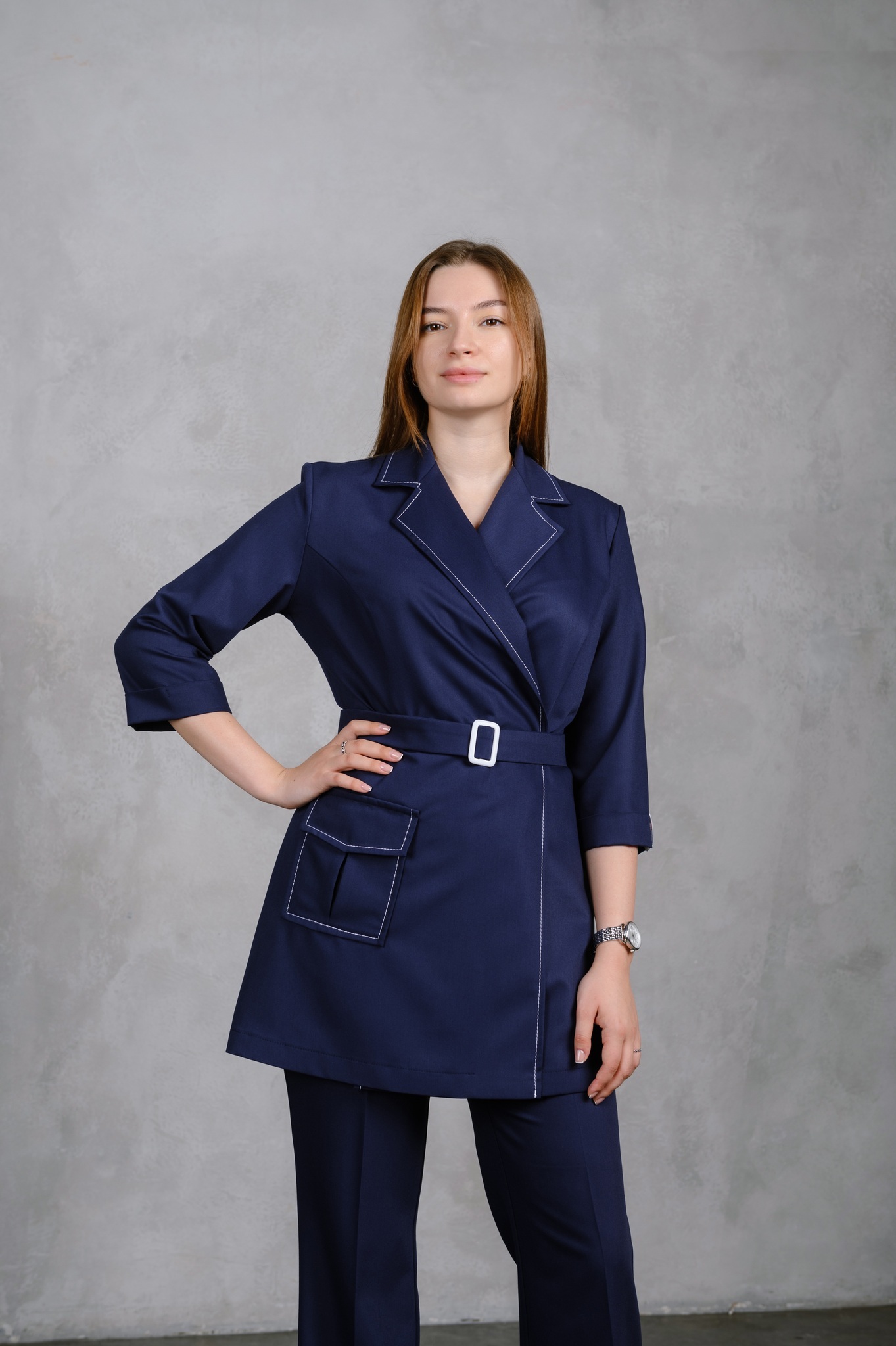 Жакет женский удлиненный полуприлегающего силуэта. Материал: 53% cotton, 44% polyester, 3 % Lycra Жакет приталенного кроя с рукавами 3/4 и элегантным английским воротником. Жакет застегивается на пуговицы. Спереди находится один накладной карман с клапаном. В комплекте съёмный пояс на талию с пряжкой.